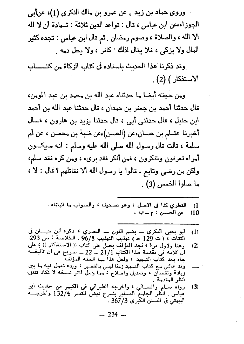 وَرَوَى حَمَّادُ بْنُ زَيْدٍ عَنْ عَمْرِو بْنِ مَالِكٍ النُّكْرِيِّ عَنْ أَبِي الْجَوْزَاءِ عَنِ ابْنِ عَبَّاسٍ قَالَ قَوَاعِدُ الدِّينِ ثَلَاثَةٌ شَهَادَةُ أَنْ لَا إِلَهَ إِلَّا اللَّهُ وَالصَّلَاةُ وَصَوْمُ رَمَضَانَ ثُمَّ قَالَ ابْنُ عَبَّاسٍ تَجِدُهُ كَثِيرَ الْمَالِ وَلَا يُزَكِّي فَلَا يُقَالُ لِذَلِكَ كَافِرٌ وَلَا يحل دمه وقد ذكرنا هذا الحديث فإسناده فِي كِتَابِ الزَّكَاةِ مِنْ كِتَابِ الِاسْتِذْكَارِ) وَمِنْ حُجَّتِهِ أَيْضًا مَا حَدَّثَنَاهُ عَبْدُ اللَّهِ بْنُ مُحَمَّدِ بْنِ عَبْدِ الْمُؤْمِنِ قَالَ حَدَّثَنَا أَحْمَدُ بْنُ جَعْفَرِ بْنِ حَمْدَانَ قَالَ حَدَّثَنَا عَبْدُ اللَّهِ بْنُ أَحْمَدَ بْنِ حَنْبَلٍ قَالَ حَدَّثَنِي أَبِي قَالَ حَدَّثَنَا يَزِيدُ بْنُ هَارُونَ قَالَ أَخْبَرَنَا هِشَامُ بْنُ حَسَّانَ عَنِ (الْحَسَنِ) عَنْ ضَبَّةَ بْنِ مِحْصَنٍ عَنْ أُمِّ سَلَمَةَ قَالَتْ قَالَ رَسُولُ اللَّهِ صَلَّى اللَّهُ عَلَيْهِ وَسَلَّمَ إِنَّهُ سَيَكُونُ أُمَرَاءُ تَعْرِفُونَ وَتُنْكِرُونَ فَمَنْ أَنْكَرَ فَقَدْ بَرِئَ وَمَنْ كَرِهَ فَقَدْ سَلِمَ وَلَكِنْ مَنْ رَضِيَ وَتَابَعَ قَالُوا يَا رَسُولَ اللَّهِ أَلَا نُقَاتِلُهُمْ قَالَ لَا مَا صَلَّوُا الْخَمْسَ