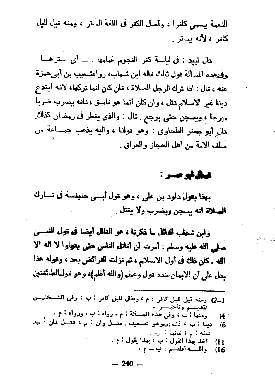 النِّعْمَةِ يُسَمَّى كَافِرًا وَأَصْلُ الْكُفْرِ فِي اللُّغَةِ السَّتْرُ وَمِنْهُ قِيلَ لِلَّيْلِ كَافِرٌ لِأَنَّهُ يَسْتُرُ قَالَ لَبِيدٌ فِي لَيْلَةٍ كَفَرَ النُّجُومَ غَمَامُهَا أَيْ سَتَرَهَا وَفِي هَذِهِ الْمَسْأَلَةِ قَوْلٌ ثَالِثٌ قَالَهُ ابْنُ شِهَابٍ رَوَاهُ شُعَيْبُ بْنُ أَبِي حَمْزَةَ عَنْهُ قَالَ إِذَا تَرَكَ الرَّجُلُ الصَّلَاةَ فَإِنْ كَانَ إِنَّمَا تَرَكَهَا لِأَنَّهُ ابْتَدَعَ دِينًا غَيْرَ الْإِسْلَامِ قُتِلَ وَإِنْ كَانَ إِنَّمَا هُوَ فَاسِقٌ فَإِنَّهُ يُضْرَبُ ضَرْبًا مُبَرِّحًا وَيُسْجَنُ حَتَّى يَرْجِعَ قَالَ وَالَّذِي يُفْطِرُ فِي رَمَضَانَ كَذَلِكَ قَالَ أَبُو جَعْفَرٍ الطَّحَاوِيُّ وَهُوَ قَوْلُنَا وَإِلَيْهِ يَذْهَبُ جَمَاعَةٌ مِنْ سَلَفِ الْأُمَّةِ مِنْ أَهْلِ الْحِجَازِ وَالْعِرَاقِ قَالَ أَبُو عُمَرَ بِهَذَا يَقُولُ دَاوُدُ بْنُ عَلِيٍّ وَهُوَ قَوْلُ أَبِي حَنِيفَةَ فِي تَارِكِ الصَّلَاةِ إِنَّهُ يُسْجَنُ وَيُضْرَبُ وَلَا يُقْتَلُ وَابْنُ شِهَابٍ الْقَائِلُ مَا ذَكَرْنَا هُوَ الْقَائِلُ أَيْضًا فِي قَوْلِ النَّبِيِّ صَلَّى اللَّهُ عَلَيْهِ وَسَلَّمَ أُمِرْتُ أَنْ أُقَاتِلَ النَّاسَ حَتَّى يَقُولُوا لَا إِلَهَ إِلَّا اللَّهُ كَانَ ذَلِكَ فِي أَوَّلِ الْإِسْلَامِ ثُمَّ نَزَلَتِ الْفَرَائِضُ بَعْدُ وَقَوْلُهُ هَذَا يَدُلُّ عَلَى أَنَّ الْإِيمَانَ عِنْدَهُ قَوْلٌ وَعَمَلٌ (وَاللَّهُ أَعْلَمُ) وَهُوَ قَوْلُ الطَّائِفَتَيْنِ