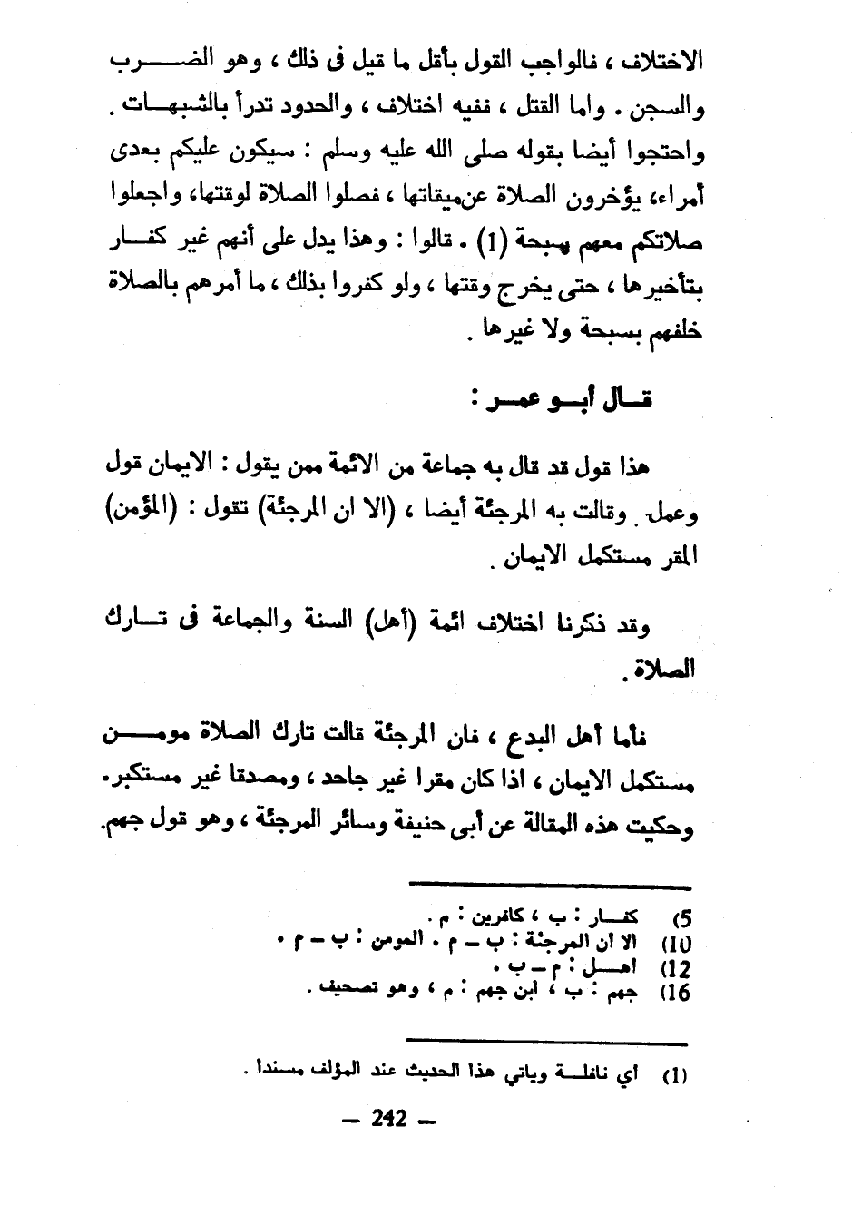 الِاخْتِلَافِ فَالْوَاجِبُ الْقَوْلُ بِأَقَلِّ مَا قِيلَ فِي ذَلِكَ وَهُوَ الضَّرْبُ وَالسَّجْنُ وَأَمَّا الْقَتْلُ فَفِيهِ اخْتِلَافٌ وَالْحُدُودُ تُدْرَأُ بِالشُّبُهَاتِ وَاحْتَجُّوا أَيْضًا بِقَوْلِهِ صَلَّى اللَّهُ عَلَيْهِ وَسَلَّمَ سَيَكُونُ عَلَيْكُمْ بَعْدِي أُمَرَاءُ يُؤَخِّرُونَ الصَّلَاةَ عَنْ مِيقَاتِهَا فَصَلُّوا الصَّلَاةَ لِوَقْتِهَا وَاجْعَلُوا صَلَاتَكُمْ مَعَهُمْ سُبْحَةً قَالُوا وَهَذَا يَدُلُّ عَلَى أَنَّهُمْ غَيْرُ كُفَّارٍ بِتَأْخِيرِهَا حَتَّى يَخْرُجَ وَقْتُهَا وَلَوْ كَفَرُوا بِذَلِكَ مَا أَمَرَهُمْ بِالصَّلَاةِ خَلْفَهُمْ بِسُبْحَةٍ وَلَا غَيْرِهَا قَالَ أَبُو عُمَرَ هَذَا قَوْلٌ قَدْ قَالَ بِهِ جَمَاعَةٌ مِنَ الْأَئِمَّةِ مِمَّنْ يَقُولُ الْإِيمَانُ قَوْلٌ وَعَمَلٌ وَقَالَتْ بِهِ الْمُرْجِئَةُ أَيْضًا (إِلَّا أَنَّ الْمُرْجِئَةَ) تَقُولُ (الْمُؤْمِنُ) الْمُقِرُّ مُسْتَكْمِلُ الْإِيمَانِ وَقَدْ ذَكَرْنَا اخْتِلَافَ أَئِمَّةِ (أَهْلِ) السُّنَّةِ وَالْجَمَاعَةِ فِي تَارِكِ الصَّلَاةِ فَأَمَّا أَهْلُ الْبِدَعِ فَإِنَّ الْمُرْجِئَةَ قَالَتْ تارك الصلاة مؤمن مُسْتَكْمِلُ الْإِيمَانِ إِذَا كَانَ مُقِرًّا غَيْرَ جَاحِدٍ وَمُصَدِّقًا غَيْرَ مُسْتَكْبِرٍ وَحُكِيَتْ هَذِهِ الْمَقَالَةُ عَنْ أَبِي حَنِيفَةَ وَسَائِرِ الْمُرْجِئَةِ وَهُوَ قَوْلُ جَهْمٍ