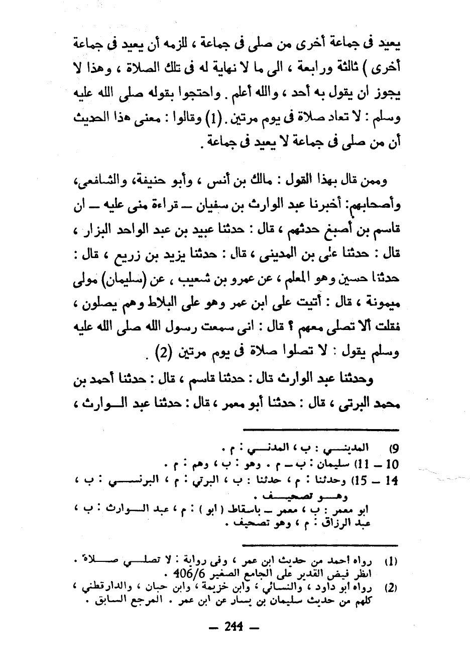 يُعِيدَ فِي جَمَاعَةٍ أُخْرَى مَنْ صَلَّى فِي جَمَاعَةٍ لَلَزِمَهُ أَنْ يُعِيدَ فِي جَمَاعَةٍ أُخْرَى) ثَالِثَةٍ وَرَابِعَةٍ إِلَى مَا لَا نِهَايَةَ لَهُ فِي تِلْكَ الصَّلَاةِ وَهَذَا لَا يَجُوزُ أَنْ يَقُولَ بِهِ أَحَدٌ وَاللَّهُ أَعْلَمُ وَاحْتَجُّوا بِقَوْلِهِ صَلَّى اللَّهُ عَلَيْهِ وَسَلَّمَ لَا تُعَادُ صَلَاةٌ فِي يَوْمٍ مَرَّتَيْنِ وَقَالُوا مَعْنَى هَذَا الْحَدِيثِ أَنَّ مَنْ صَلَّى فِي جَمَاعَةٍ لَا يُعِيدُ فِي جَمَاعَةٍ وَمِمَّنْ قَالَ بِهَذَا الْقَوْلِ مَالِكُ بْنُ أَنَسٍ وَأَبُو حَنِيفَةَ وَالشَّافِعِيُّ وَأَصْحَابُهُمْ أَخْبَرَنَا عَبْدُ الْوَارِثِ بْنُ سُفْيَانَ قِرَاءَةً مِنِّي عَلَيْهِ أَنَّ قَاسِمَ بْنَ أَصْبَغَ حَدَّثَهُمْ قَالَ حَدَّثَنَا عُبَيْدُ بْنُ عَبْدِ الْوَاحِدِ الْبَزَّارُ قَالَ حَدَّثَنَا عَلِيُّ بْنُ الْمَدِينِيِّ قَالَ حَدَّثَنَا يَزِيدُ بْنُ زُرَيْعٍ قَالَ حَدَّثَنَا حُسَيْنٌ وَهُوَ الْمُعَلِّمُ عَنْ عَمْرِو بْنِ شُعَيْبٍ عَنْ (سُلَيْمَانَ) مَوْلَى مَيْمُونَةَ قَالَ أَتَيْتُ عَلَى ابْنِ عُمَرَ وَهُوَ عَلَى الْبَلَاطِ وَهُمْ يُصَلُّونَ فَقُلْتُ أَلَا تُصَلِّي مَعَهُمْ قَالَ إِنِّي سَمِعْتُ رَسُولَ اللَّهِ صَلَّى اللَّهُ عَلَيْهِ وَسَلَّمَ يَقُولُ لَا تُصَلُّوا صَلَاةً فِي يَوْمٍ مَرَّتَيْنِ وَحَدَّثَنَا عَبْدُ الْوَارِثِ قَالَ حَدَّثَنَا قَاسِمٌ قَالَ حَدَّثَنَا أَحْمَدُ بْنُ مُحَمَّدٍ الْبِرْتِيُّ قَالَ حَدَّثَنَا أَبُو مَعْمَرٍ قَالَ حَدَّثَنَا عَبْدُ الْوَارِثِ