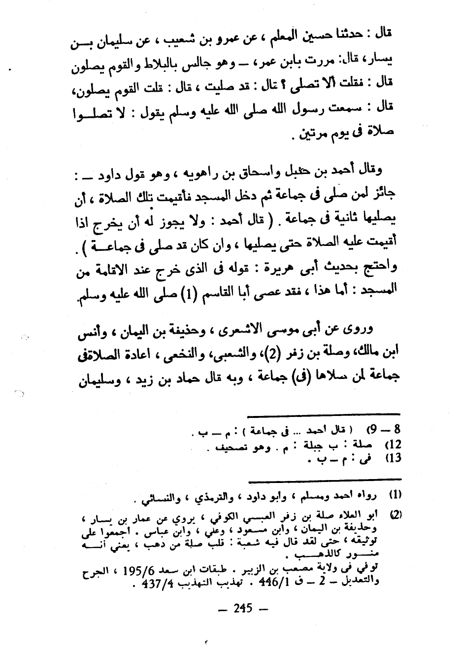 قَالَ حَدَّثَنَا حُسَيْنٍ الْمُعَلِّمِ عَنْ عَمْرِو بْنِ شُعَيْبٍ عَنْ سُلَيْمَانَ بْنَ يَسَارٍ قَالَ مَرَرْتُ بِابْنِ عُمَرَ وَهُوَ جَالِسٌ بِالْبَلَاطِ وَالْقَوْمُ يُصَلُّونَ قَالَ فَقُلْتُ أَلَا تُصَلِّي قَالَ قَدْ صَلَّيْتُ قَالَ قُلْتُ الْقَوْمُ يُصَلُّونَ قَالَ سَمِعْتُ رَسُولَ اللَّهِ صَلَّى اللَّهُ عَلَيْهِ وَسَلَّمَ يَقُولُ لَا تُصَلُّوا صَلَاةً فِي يَوْمٍ مَرَّتَيْنِ وَقَالَ أَحْمَدُ بْنُ حَنْبَلٍ وَإِسْحَاقُ بْنُ رَاهَوَيْهِ وَهُوَ قَوْلُ دَاوُدَ جَائِزٌ لِمَنْ صَلَّى فِي جَمَاعَةٍ ثُمَّ دَخَلَ الْمَسْجِدَ فَأُقِيمَتْ تِلْكَ الصَّلَاةُ أَنْ يُصَلِّيَهَا ثَانِيَةً فِي جَمَاعَةٍ (قَالَ أَحْمَدُ وَلَا يَجُوزُ لَهُ أَنْ يَخْرُجَ إِذَا أُقِيمَتْ عَلَيْهِ الصَّلَاةُ حَتَّى يُصَلِّيَهَا وَإِنْ كَانَ قَدْ صَلَّى فِي جَمَاعَةٍ) وَاحْتَجَّ بِحَدِيثِ أَبِي هُرَيْرَةَ قَوْلِهِ فِي الَّذِي خَرَجَ عِنْدَ الْإِقَامَةِ مِنَ الْمَسْجِدِ أَمَّا هَذَا فَقَدْ عَصَى أَبَا الْقَاسِمِ صَلَّى اللَّهُ عَلَيْهِ وَسَلَّمَ وَرُوِيَ عَنْ أَبِي مُوسَى الْأَشْعَرِيِّ وحذيفة بن اليمان وأنس ابن مَالِكٍ وَصِلَةَ بْنِ زُفَرَ وَالشَّعْبِيِّ وَالنَّخَعِيِّ إِعَادَةُ الصَّلَاةِ فِي جَمَاعَةٍ لِمَنْ صَلَّاهَا (فِي) جَمَاعَةٍ وبه قال حماد بن زيد وسليمان