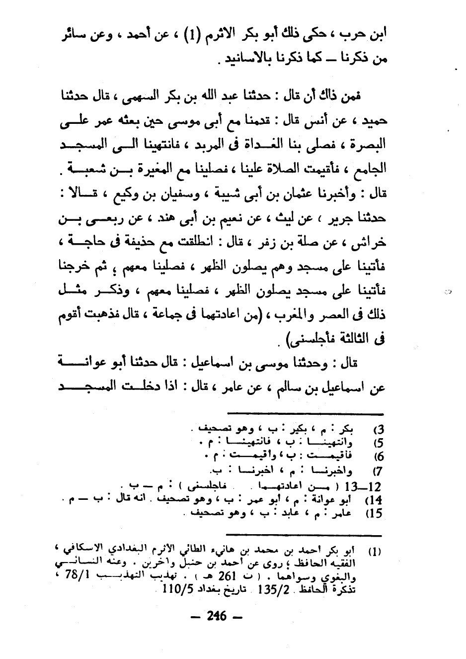 ابن حَرْبٍ حَكَى ذَلِكَ أَبُو بَكْرٍ الْأَثْرَمُ عَنْ أَحْمَدَ وَعَنْ سَائِرِ مَنْ ذَكَرْنَا كَمَا ذَكَرْنَا بِالْأَسَانِيدِ فَمِنْ ذَلِكَ أَنْ قَالَ حَدَّثَنَا عَبْدُ اللَّهِ بْنُ بَكْرٍ السَّهْمِيُّ قَالَ حَدَّثَنَا حُمَيْدٌ عَنْ أَنَسٍ قَالَ قَدِمْنَا مَعَ أَبِي مُوسَى حِينَ بَعَثَهُ عُمَرُ عَلَى الْبَصْرَةِ فَصَلَّى بِنَا الْغَدَاةَ فِي الْمِرْبَدِ فَانْتَهَيْنَا إِلَى الْمَسْجِدِ الْجَامِعِ فَأُقِيمَتِ الصَّلَاةُ عَلَيْنَا فَصَلَّيْنَا مَعَ الْمُغِيرَةِ بْنِ شُعْبَةَ قَالَ وَأَخْبَرَنَا عُثْمَانُ بْنُ أَبِي شَيْبَةَ وَسُفْيَانُ بْنُ وَكِيعٍ قَالَا حَدَّثَنَا جَرِيرٌ عَنْ لَيْثٍ عَنْ نُعَيْمِ بْنِ أَبِي هِنْدٍ عَنْ رِبْعِيِّ بْنِ خِرَاشٍ عَنْ صِلَةَ بْنِ زُفَرَ قَالَ انْطَلَقْتُ مَعَ حُذَيْفَةَ فِي حَاجَةٍ فَأَتَيْنَا عَلَى مَسْجِدٍ وَهُمْ يُصَلُّونَ الظُّهْرَ فَصَلَّيْنَا مَعَهُمْ ثُمَّ خَرَجْنَا فَأَتَيْنَا عَلَى مَسْجِدٍ يُصَلُّونَ الظُّهْرَ فَصَلَّيْنَا مَعَهُمْ وَذَكَرَ مِثْلَ ذَلِكَ فِي الْعَصْرِ وَالْمَغْرِبِ (مِنْ إِعَادَتِهِمَا فِي جَمَاعَةٍ قَالَ فَذَهَبْتُ أَقُومُ فِي الثَّالِثَةِ فَأَجْلَسَنِي) قَالَ وَحَدَّثَنَا مُوسَى بن إسمعيل قال حدثنا أبو عوانة عن إسمعيل بْنِ سَالِمٍ عَنْ عَامِرٍ قَالَ إِذَا دَخَلْتَ المسجد