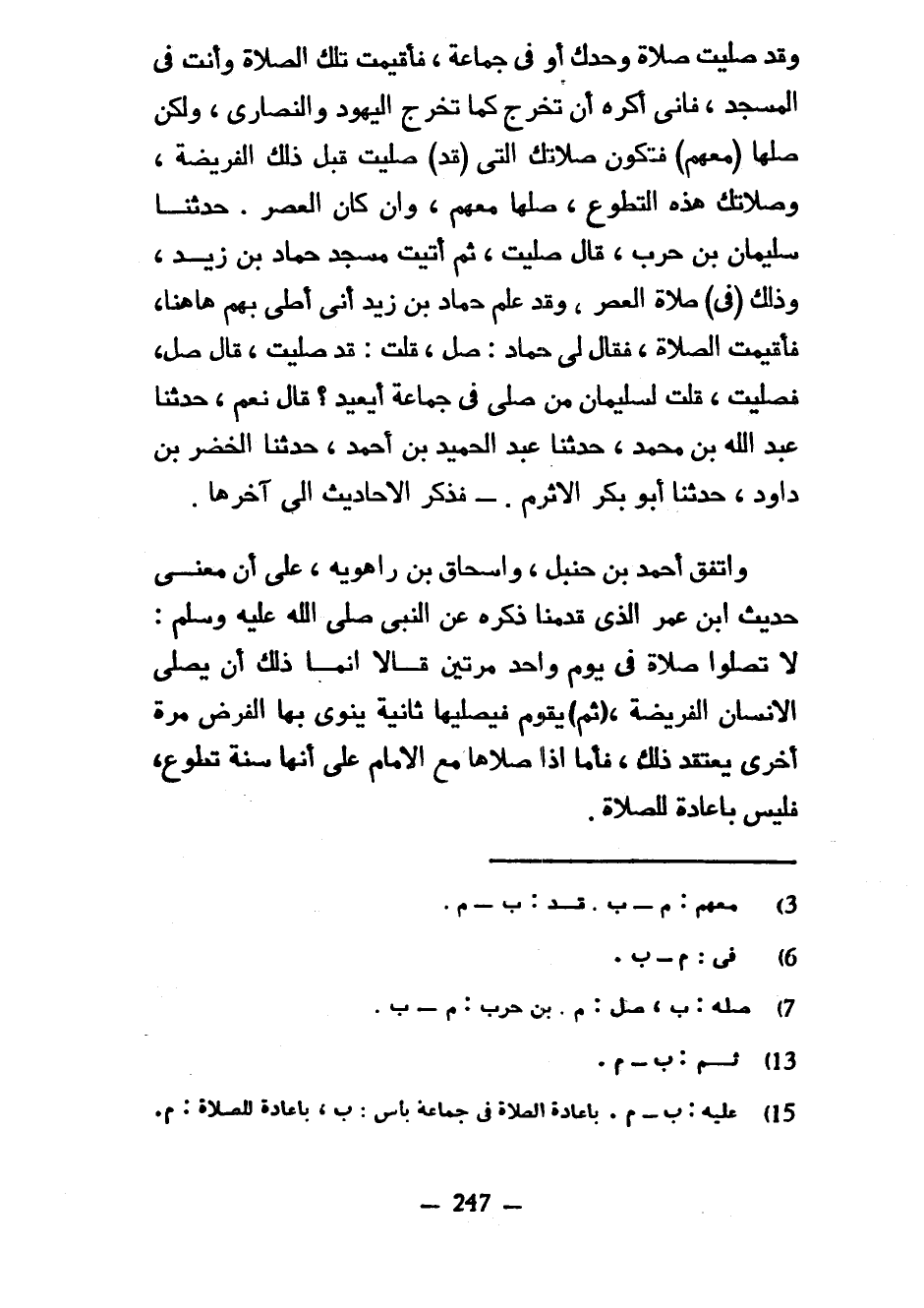 وَقَدْ صَلَّيْتَ صَلَاةً وَحْدَكَ أَوْ فِي جَمَاعَةٍ فَأُقِيمَتْ تِلْكَ الصَّلَاةُ وَأَنْتَ فِي الْمَسْجِدِ فَإِنِّي أَكْرَهُ أَنْ تَخْرُجَ كَمَا تَخْرُجُ الْيَهُودُ وَالنَّصَارَى وَلَكِنْ صَلِّهَا (مَعَهُمْ) فَتَكُونُ صَلَاتُكُ الَّتِي (قَدْ) صُلِّيَتْ قَبْلَ ذَلِكَ الْفَرِيضَةَ وَصَلَاتُكَ هَذِهِ التَّطَوُّعَ صَلِّهَا مَعَهُمْ وَإِنْ كَانَ الْعَصْرَ حَدَّثَنَا سُلَيْمَانُ بْنُ حَرْبٍ قَالَ صَلَّيْتُ ثُمَّ أَتَيْتُ مَسْجِدَ حَمَّادِ بْنِ زَيْدٍ وَذَلِكَ (فِي) صَلَاةِ الْعَصْرِ وَقَدْ عَلِمَ حَمَّادُ بْنُ زَيْدٍ أَنِّي أُصَلِّي بهم ها هنا فَأُقِيمَتِ الصَّلَاةُ فَقَالَ لِي حَمَّادٌ صَلِّ قُلْتُ قَدْ صَلَّيْتُ قَالَ صَلِّ فَصَلَّيْتُ قُلْتُ لِسُلَيْمَانَ مَنْ صَلَّى فِي جَمَاعَةٍ أَيُعِيدُ قَالَ نَعَمْ حَدَّثَنَا عَبْدُ اللَّهِ بْنُ مُحَمَّدٍ حَدَّثَنَا عَبْدُ الْحَمِيدِ بْنُ أَحْمَدَ حَدَّثَنَا الْخَضِرُ بْنُ دَاوُدَ حَدَّثَنَا أَبُو بَكْرٍ الْأَثْرَمُ فَذَكَرَ الْأَحَادِيثَ إِلَى آخِرِهَا وَاتَّفَقَ أَحْمَدُ بْنُ حَنْبَلٍ وَإِسْحَاقُ بْنُ رَاهَوَيْهِ عَلَى أَنَّ مَعْنَى حَدِيثِ ابْنِ عُمَرَ الَّذِي قَدَّمْنَا ذِكْرَهُ عَنِ النَّبِيِّ صَلَّى اللَّهُ عَلَيْهِ وَسَلَّمَ لَا تُصَلُّوا صَلَاةً فِي يَوْمٍ وَاحِدٍ مَرَّتَيْنِ قَالَا إِنَّمَا ذَلِكَ أَنْ يُصَلِّيَ الْإِنْسَانُ الْفَرِيضَةَ (ثُمَّ) يَقُومُ فَيُصَلِّيهَا ثَانِيَةً يَنْوِي بِهَا الْفَرْضَ مَرَّةً أُخْرَى يَعْتَقِدُ ذَلِكَ فَأَمَّا إِذَا صَلَّاهَا مَعَ الْإِمَامِ عَلَى أَنَّهَا سُنَّةُ تَطَوُّعٍ فَلَيْسَ بِإِعَادَةٍ لِلصَّلَاةِ