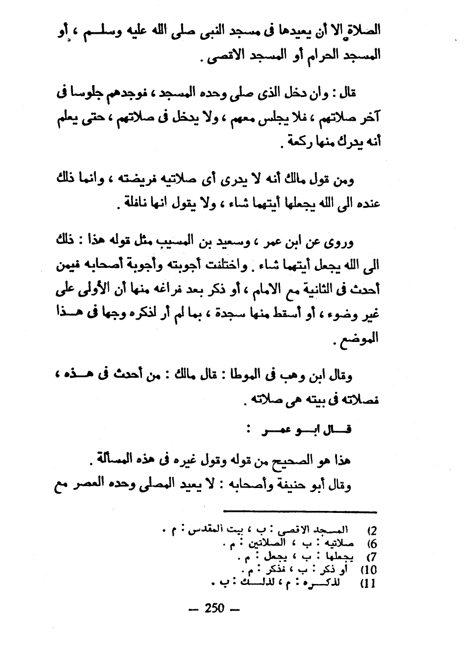 الصَّلَاةَ إِلَّا أَنْ يُعِيدَهَا فِي مَسْجِدِ النَّبِيِّ صَلَّى اللَّهُ عَلَيْهِ وَسَلَّمَ أَوِ الْمَسْجِدِ الْحَرَامِ أَوِ الْمَسْجِدِ الْأَقْصَى قَالَ وَإِنْ دَخَلَ الَّذِي صَلَّى وَحْدَهُ الْمَسْجِدَ فَوَجَدَهُمْ جُلُوسًا فِي آخِرِ صَلَاتِهِمْ فَلَا يَجْلِسُ مَعَهُمْ وَلَا يَدْخُلُ فِي صَلَاتِهِمْ حَتَّى يَعْلَمَ أَنَّهُ يُدْرِكُ مِنْهَا رَكْعَةً وَمِنْ قَوْلِ مَالِكٍ أَنَّهُ لَا يَدْرِي أَيَّ صَلَاتَيْهِ فَرِيضَتَهُ وَإِنَّمَا ذَلِكَ عِنْدَهُ إِلَى اللَّهِ يَجْعَلُهَا أَيَّتَهُمَا شَاءَ وَلَا يَقُولُ إِنَّهَا نَافِلَةٌ وَرُوِيَ عَنِ ابْنِ عُمَرَ وَسَعِيدِ بْنِ الْمُسَيَّبِ مِثْلُ قَوْلِهِ هَذَا ذَلِكَ إِلَى اللَّهِ يَجْعَلُ أَيَّتَهُمَا شَاءَ وَاخْتَلَفَتْ أَجْوِبَتُهُ وَأَجْوِبَةُ أَصْحَابِهِ فِيمَنْ أَحْدَثَ فِي الثَّانِيَةِ مَعَ الْإِمَامِ أَوْ ذَكَرَ بَعْدَ فَرَاغِهِ مِنْهَا أَنَّ الْأُولَى عَلَى غَيْرِ وُضُوءٍ أَوْ أَسْقَطَ مِنْهَا سَجْدَةً بِمَا لَمْ أَرَ لِذِكْرِهِ وَجْهًا فِي هَذَا الْمَوْضِعِ وَقَالَ ابْنُ وَهْبٍ فِي الْمُوَطَّأِ قَالَ مَالِكٌ مَنْ أَحْدَثَ فِي هَذِهِ فَصَلَاتُهُ فِي بَيْتِهِ هِيَ صَلَاتُهُ قَالَ أَبُو عُمَرَ هَذَا هُوَ الصَّحِيحُ مِنْ قَوْلِهِ وَقَوْلِ غَيْرِهِ فِي هَذِهِ الْمَسْأَلَةِ وَقَالَ أَبُو حَنِيفَةَ وَأَصْحَابُهُ لَا يُعِيدُ الْمُصَلِّي وَحْدَهُ الْعَصْرَ مَعَ