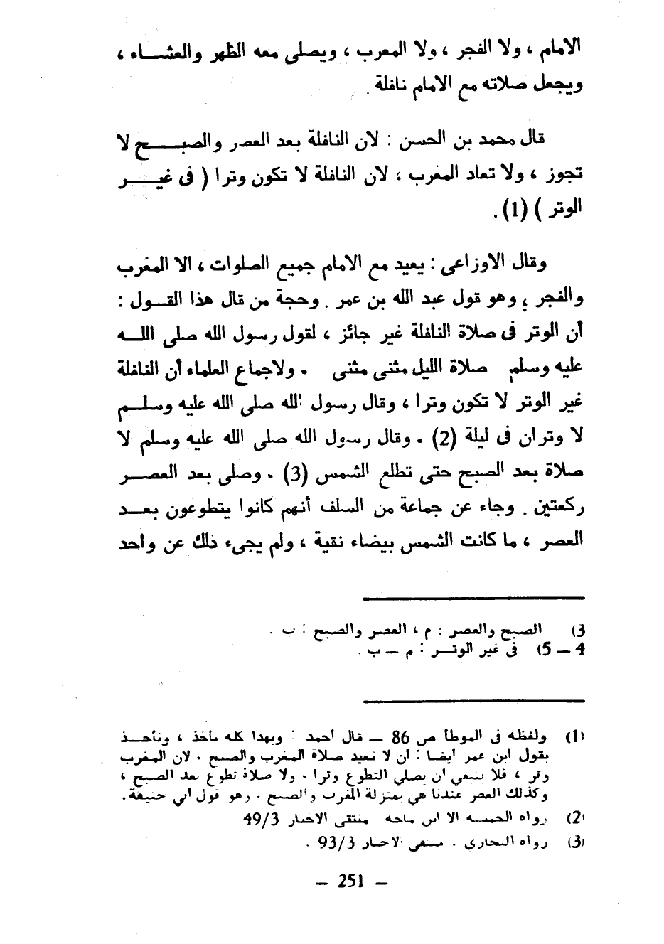 الْإِمَامِ وَلَا الْفَجْرَ وَلَا الْمَغْرِبَ وَيُصَلِّي مَعَهُ الظُّهْرَ وَالْعِشَاءَ وَيَجْعَلُ صَلَاتَهُ مَعَ الْإِمَامِ نَافِلَةً قَالَ مُحَمَّدُ بْنُ الْحَسَنِ لِأَنَّ النَّافِلَةَ بَعْدَ الْعَصْرِ وَالصُّبْحِ لَا تَجُوزُ وَلَا تُعَادُ الْمَغْرِبُ لِأَنَّ النَّافِلَةَ لَا تَكُونُ وِتْرًا (فِي غَيْرِ الْوِتْرِ) وَقَالَ الْأَوْزَاعِيُّ يُعِيدُ مَعَ الْإِمَامِ جَمِيعَ الصَّلَوَاتِ إِلَّا الْمَغْرِبَ وَالْفَجْرَ وَهُوَ قَوْلُ عَبْدِ اللَّهِ بْنِ عُمَرَ وَحُجَّةُ مَنْ قَالَ هَذَا الْقَوْلَ أَنَّ الْوِتْرَ فِي صَلَاةِ النَّافِلَةِ غَيْرُ جَائِزٍ لِقَوْلِ رَسُولِ اللَّهِ صَلَّى اللَّهُ عَلَيْهِ وَسَلَّمَ صَلَاةُ اللَّيْلِ مَثْنَى مَثْنَى وَلِإِجْمَاعِ الْعُلَمَاءِ أَنَّ النَّافِلَةَ غَيْرَ الْوِتْرِ لَا تَكُونُ وِتْرًا وَقَالَ رَسُولُ اللَّهِ صَلَّى اللَّهُ عَلَيْهِ وَسَلَّمَ لَا وِتْرَانِ فِي لَيْلَةٍ وَقَالَ رَسُولُ اللَّهِ صَلَّى اللَّهُ عَلَيْهِ وَسَلَّمَ لَا صَلَاةَ بَعْدَ الصُّبْحِ حَتَّى تَطْلُعَ الشَّمْسُ وَصَلَّى بَعْدَ الْعَصْرِ رَكْعَتَيْنِ وَجَاءَ عَنْ جَمَاعَةٍ مِنَ السَّلَفِ أَنَّهُمْ كَانُوا يَتَطَوَّعُونَ بَعْدَ الْعَصْرِ مَا كَانَتِ الشَّمْسُ بيضاء نقية ولم يجيء ذَلِكَ عَنْ وَاحِدٍ
