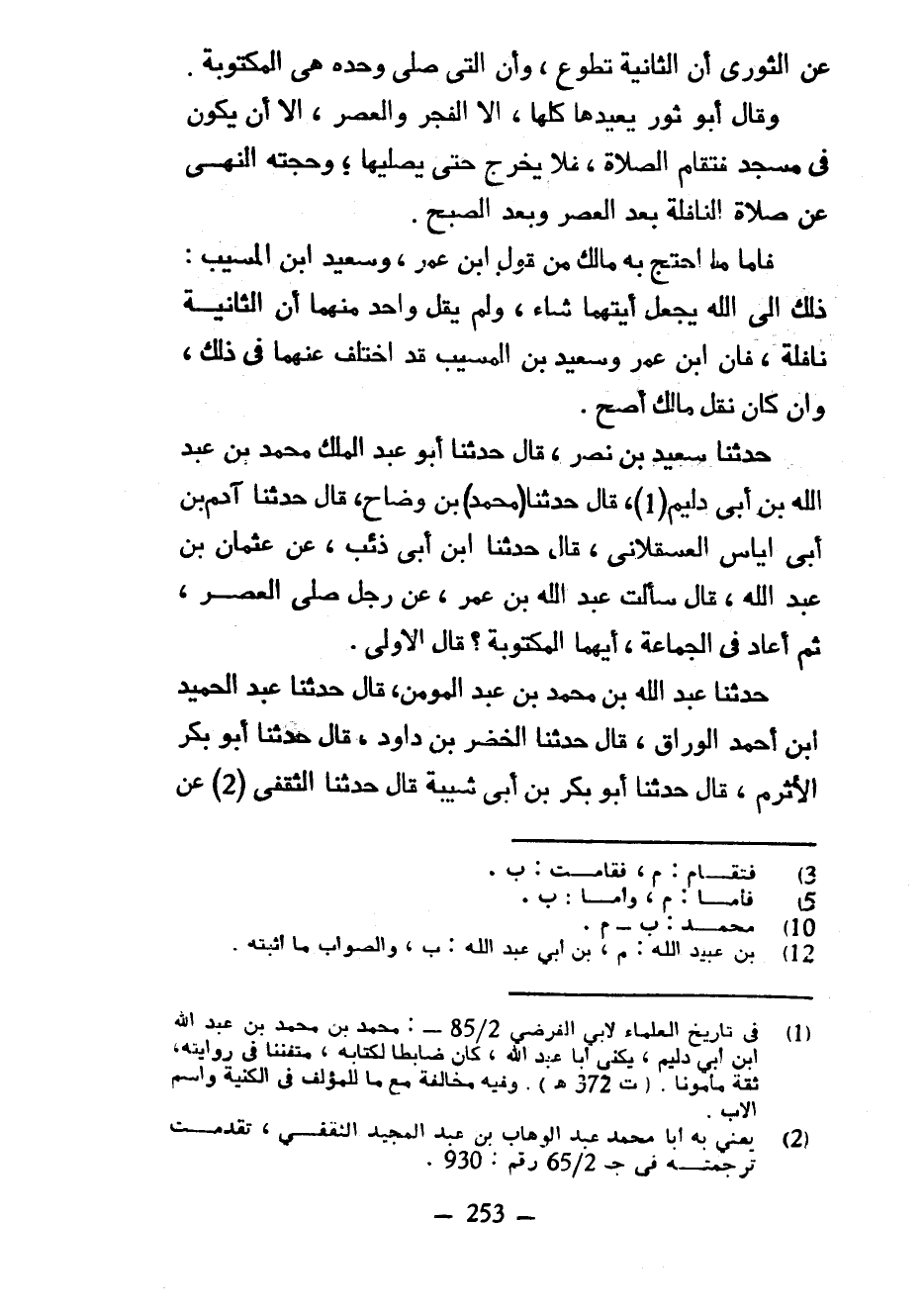 عَنِ الثَّوْرِيِّ أَنَّ الثَّانِيَةَ تَطَوُّعٌ وَأَنَّ الَّتِي صَلَّى وَحْدَهُ هِيَ الْمَكْتُوبَةُ وَقَالَ أَبُو ثَوْرٍ يُعِيدُهَا كُلَّهَا إِلَّا الْفَجْرَ وَالْعَصْرَ إِلَّا أَنْ يَكُونَ فِي مَسْجِدٍ فَتُقَامُ الصَّلَاةُ فَلَا يَخْرُجُ حَتَّى يُصَلِّيَهَا وَحُجَّتُهُ النَّهْيُ عَنْ صَلَاةِ النَّافِلَةِ بَعْدَ الْعَصْرِ وَبَعْدَ الصُّبْحِ فَأَمَّا مَا احْتَجَّ بِهِ مَالِكٌ مِنْ قَوْلِ ابْنِ عُمَرَ وَسَعِيدِ ابن الْمُسَيَّبِ ذَلِكَ إِلَى اللَّهِ يَجْعَلُ أَيَّتَهُمَا شَاءَ وَلَمْ يَقُلْ وَاحِدٌ مِنْهُمَا أَنَّ الثَّانِيَةَ نَافِلَةٌ فَإِنَّ ابْنَ عُمَرَ وَسَعِيدَ بْنَ الْمُسَيَّبِ قَدِ اخْتُلِفَ عَنْهُمَا فِي ذَلِكَ وَإِنْ كَانَ نَقْلُ مَالِكٍ أَصَحَّ حَدَّثَنَا سَعِيدُ بْنُ نَصْرٍ قَالَ حَدَّثَنَا أَبُو عَبْدِ الْمَلِكِ مُحَمَّدُ بْنُ عَبْدِ اللَّهِ بْنِ أَبِي دُلَيْمٍ قَالَ حَدَّثَنَا (مُحَمَّدُ) بْنُ وَضَّاحٍ قَالَ حَدَّثَنَا آدَمُ بْنُ أَبِي إِيَاسٍ الْعَسْقَلَانِيُّ قَالَ حَدَّثَنَا ابْنُ أَبِي ذِئْبٍ عَنْ عُثْمَانَ بْنِ عَبْدِ اللَّهِ قَالَ سَأَلْتُ عَبْدَ اللَّهِ بْنَ عُمَرَ عَنْ رَجُلٍ صَلَّى الْعَصْرَ ثُمَّ أَعَادَ فِي الْجَمَاعَةِ أَيُّهُمَا الْمَكْتُوبَةُ قَالَ الْأُولَى حَدَّثَنَا عَبْدُ اللَّهِ بْنُ مُحَمَّدِ بْنِ عَبْدِ المؤمن قال حدثنا عبد الحميد ابن أَحْمَدَ الْوَرَّاقُ قَالَ حَدَّثَنَا الْخَضِرُ بْنُ دَاوُدَ قَالَ حَدَّثَنَا أَبُو بَكْرٍ الْأَثْرَمُ قَالَ حَدَّثَنَا أَبُو بَكْرِ بْنُ أَبِي شَيْبَةَ قَالَ حَدَّثَنَا الثقفي عن