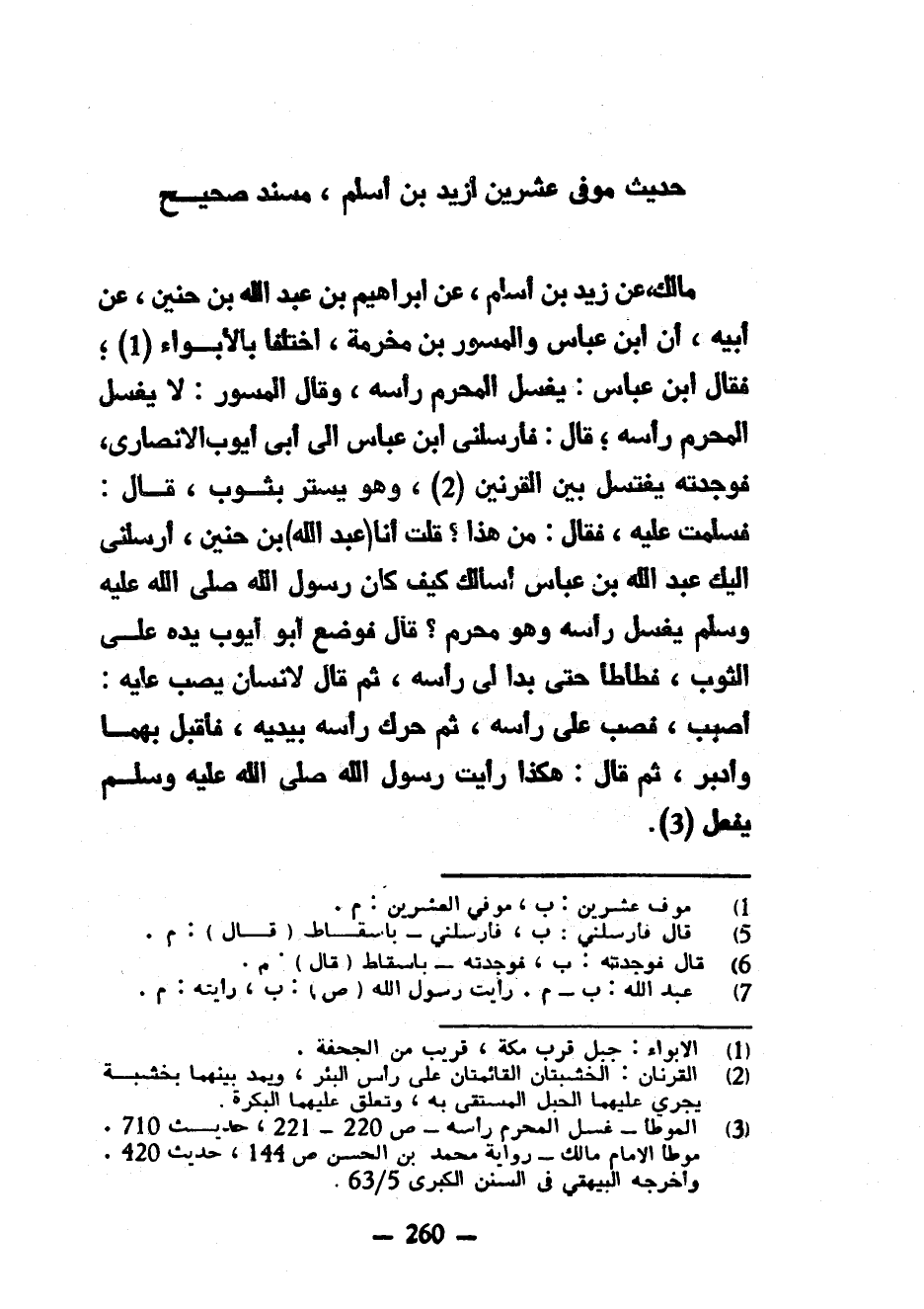 حَدِيثٌ مُوفِي عِشْرِينَ لِزَيْدِ بْنِ أَسْلَمَ مُسْنَدٌ صَحِيحٌ مَالِكٌ عَنْ زيد ابن أَسْلَمَ عَنْ إِبْرَاهِيمَ بْنِ عَبْدِ اللَّهِ بْنِ حُنَيْنٍ عَنْ أَبِيهِ أَنَّ ابْنَ عَبَّاسٍ وَالْمُسَوَّرَ بن مخرمة اخْتَلَفَا بِالْأَبْوَاءِ فَقَالَ ابْنُ عَبَّاسٍ يَغْسِلُ الْمُحْرِمُ رَأْسَهُ وَقَالَ الْمُسَوَّرُ لَا يَغْسِلُ الْمُحْرِمُ رَأْسَهُ قَالَ فَأَرْسَلَنِي ابْنُ عَبَّاسٍ إِلَى أَبِي أَيُّوبَ الْأَنْصَارِيِّ فَوَجَدْتُهُ يَغْتَسِلُ بَيْنَ الْقَرْنَيْنِ وَهُوَ يُسْتَرُ بِثَوْبٍ قَالَ فَسَلَّمْتُ عَلَيْهِ فَقَالَ مَنْ هَذَا قُلْتُ أَنَا (عَبْدُ اللَّهِ) بْنُ حُنَيْنٍ أَرْسَلَنِي إِلَيْكَ عَبْدُ اللَّهِ بْنُ عَبَّاسٍ أَسْأَلُكَ كَيْفَ كَانَ رَسُولُ اللَّهِ صَلَّى اللَّهُ عَلَيْهِ وَسَلَّمَ يَغْسِلُ رَأْسَهُ وَهُوَ مُحْرِمٌ قَالَ فَوَضَعَ أَبُو أيوب يده علىالثوب فَطَأْطَأَ حَتَّى بَدَا لِي رَأْسُهُ ثُمَّ قَالَ لِإِنْسَانٍ يَصُبُّ عَلَيْهِ اصْبُبْ فَصَبَّ عَلَى رَأْسِهِ ثُمَّ حَرَّكَ رَأْسَهُ بِيَدَيْهِ فَأَقْبَلَ بِهِمَا وَأَدْبَرَ ثُمَّ قَالَ هَكَذَا رَأَيْتُ رَسُولَ اللَّهِ صَلَّى اللَّهُ عَلَيْهِ وَسَلَّمَ يَفْعَلُ