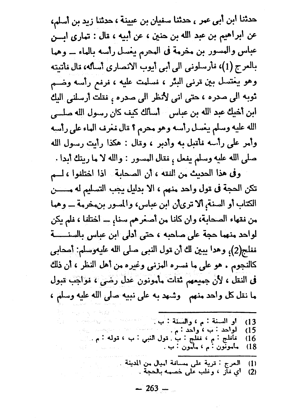حَدَّثَنَا ابْنُ أَبِي عُمَرَ حَدَّثَنَا سُفْيَانُ بْنُ عيينة حدثنا زيد ابن أَسْلَمَ عَنْ إِبْرَاهِيمَ بْنِ عَبْدِ اللَّهِ بْنِ حُنَيْنٍ عَنْ أَبِيهِ قَالَ تَمَارَى ابْنُ عَبَّاسٍ وَالْمُسَوَّرُ بْنُ مَخْرَمَةَ فِي الْمُحْرِمِ يَغْسِلُ رَأْسَهُ بِالْمَاءِ وَهُمَا بِالْعَرْجِ فَأَرْسَلُونِي إِلَى أَبِي أَيُّوبَ الْأَنْصَارِيِّ أَسْأَلُهُ قَالَ فَأَتَيْتُهُ وَهُوَ يَغْتَسِلُ بَيْنَ قَرْنَيِ الْبِئْرِ فَسَلَّمَتْ عَلَيْهِ فَرَفَعَ رَأَسَهُ وَضَمَّ ثَوْبَهُ إِلَى صَدْرِهِ حَتَّى إِنِّي لَأَنْظُرُ إِلَى صَدْرِهِ فَقُلْتُ أَرْسَلَنِي إِلَيْكَ ابْنُ أَخِيكَ عَبْدُ اللَّهِ بْنُ عَبَّاسٍ أَسْأَلُكَ كَيْفَ كَانَ رَسُولُ اللَّهِ صَلَّى اللَّهُ عَلَيْهِ وَسَلَّمَ يَغْسِلُ رَأْسَهُ وَهُوَ مُحْرِمٌ قَالَ فَغَرَفَ الْمَاءَ عَلَى رَأْسِهِ وَأَمَرَّ عَلَى رَأْسِهِ فَأَقْبَلَ بِهِ وَأَدْبَرَ وَقَالَ هَكَذَا رَأَيْتُ رَسُولَ اللَّهِ صَلَّى اللَّهُ عَلَيْهِ وَسَلَّمَ يفعل فقال المسور والله لا ما ريتك أَبَدًا وَفِي هَذَا الْحَدِيثِ مِنَ الْفِقْهِ أَنَّ الصَّحَابَةَ إِذَا اخْتَلَفُوا لَمْ تَكُنِ الْحُجَّةُ فِي قَوْلِ وَاحِدٍ مِنْهُمْ إِلَّا بِدَلِيلٍ يَجِبُ التَّسْلِيمُ لَهُ مِنَ الْكِتَابِ أَوِ السُّنَّةِ أَلَا تَرَى أن ابن عباس والمسور بن مخرمة وَهُمَا مِنْ فُقَهَاءِ الصَّحَابَةِ وَإِنْ كَانَا مِنْ أَصْغَرِهِمْ سِنًّا اخْتَلَفَا فَلَمْ يَكُنْ لِوَاحِدٍ مِنْهُمَا حُجَّةٌ عَلَى صَاحِبِهِ حَتَّى أَدْلَى ابْنُ عَبَّاسٍ بِالسُّنَّةِ فَفَلَجَ وَهَذَا يُبَيِّنُ لَكَ أَنَّ قَوْلَ النَّبِيِّ صَلَّى اللَّهُ عَلَيْهِ وَسَلَّمَ أَصْحَابِي كَالنُّجُومِ هُوَ عَلَى مَا فَسَّرَهُ الْمُزَنِيُّ وَغَيْرُهُ مِنْ أَهْلِ النَّظَرِ أَنَّ ذَلِكَ فِي النَّقْلِ لِأَنَّ جَمِيعَهُمْ ثِقَاتٌ مَأْمُونُونَ عَدْلٌ رِضًى فَوَاجِبٌ قَبُولُ مَا نَقَلَ كُلُّ وَاحِدٍ مِنْهُمْ وَشَهِدَ بِهِ عَلَى نَبِيِّهِ صَلَّى اللَّهُ عَلَيْهِ وَسَلَّمَ