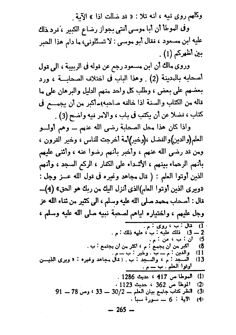 وَكُلُّهُمْ رَوَى فِيهِ أَنَّهُ تَلَا قَدْ ضَلَلْتُ إِذًا الْآيَةَ وَفِي الْمُوَطَّأِ أَنَّ أَبَا مُوسَى أَفْتَى بِجَوَازِ رَضَاعِ الْكَبِيرِ فَرَدَّ ذَلِكَ عَلَيْهِ ابْنُ مَسْعُودٍ فَقَالَ أَبُو مُوسَى لَا تَسْئَلُونِي مَا دَامَ هَذَا الْحَبْرُ بَيْنَ أَظْهُرِكُمْ وَرَوَى مَالِكٌ أَنَّ ابْنَ مَسْعُودٍ رَجَعَ عَنْ قَوْلِهِ فِي الرَّبِيبَةِ إِلَى قَوْلِ أَصْحَابِهِ بِالْمَدِينَةِ وَهَذَا الْبَابُ فِي اخْتِلَافِ الصَّحَابَةِ وَرَدِّ بَعْضِهِمْ عَلَى بَعْضٍ وَطَلَبِ كُلِّ وَاحِدٍ مِنْهُمُ الدَّلِيلَ وَالْبُرْهَانَ عَلَى مَا قَالَهُ مِنَ الْكِتَابِ وَالسُّنَّةِ إِذَا خَالَفَهُ صَاحِبُهُ أَكْبَرُ مِنْ أَنْ يُجْمَعَ فِي كِتَابٍ فَضْلًا عَنْ أَنْ يُكْتَبَ فِي بَابٍ وَالْأَمْرُ فِيهِ وَاضِحٌ وَإِذَا كَانَ هَذَا مَحَلَّ الصَّحَابَةِ رَضِيَ اللَّهُ عَنْهُمْ وَهُمْ أُولُو الْعِلْمِ (وَالدِّينِ) وَالْفَضْلِ (وَخَيْرُ) أُمَّةٍ أُخْرِجَتْ لِلنَّاسِ وَخَيْرُ الْقُرُونِ وَمَنْ قَدْ رَضِيَ اللَّهُ عَنْهُمْ وَأَخْبَرَ بِأَنَّهُمْ رَضُوا عَنْهُ وَأَثْنَى عَلَيْهِمْ بِأَنَّهُمُ الرُّحَمَاءُ بَيْنَهُمْ الْأَشِدَّاءُ عَلَى الْكُفَّارِ الرُّكَّعُ السُّجَّدُ وَأَنَّهُمُ الَّذِينَ أُوتُوا الْعِلْمَ (قَالَ مُجَاهِدٌ وَغَيْرُهُ فِي قَوْلِ اللَّهِ عَزَّ وَجَلَّ وَيَرَى الَّذِينَ أُوتُوا الْعِلْمَ) الَّذِي أُنْزِلَ إِلَيْكَ مِنْ رَبِّكَ هُوَ الْحَقَّ قَالَ أَصْحَابُ مُحَمَّدٍ صَلَّى اللَّهُ عَلَيْهِ وَسَلَّمَ إِلَى كَثِيرٍ مِنْ ثَنَاءِ اللَّهِ عَزَّ وَجَلَّ عَلَيْهِمْ وَاخْتِيَارِهِ إِيَّاهُمْ لِصُحْبَةِ نَبِيِّهِ صَلَّى اللَّهُ عَلَيْهِ وَسَلَّمَ