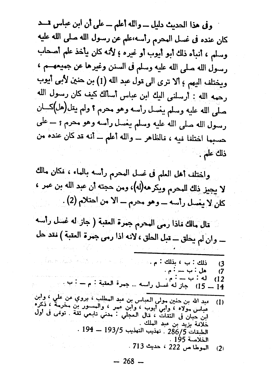 وَفِي هَذَا الْحَدِيثِ دَلِيلٌ وَاللَّهُ أَعْلَمُ عَلَى أَنَّ ابْنَ عَبَّاسٍ قَدْ كَانَ عِنْدَهُ فِي غَسْلِ الْمُحْرِمِ رَأْسَهُ عِلْمٌ عَنْ رَسُولِ اللَّهِ صَلَّى اللَّهُ عَلَيْهِ وَسَلَّمَ أَنْبَأَهُ ذَلِكَ أَبُو أَيُّوبَ أَوْ غَيْرُهُ لِأَنَّهُ كَانَ يَأْخُذُ عِلْمَ أصحاب رسول الله صلى الله عليه وسلم فِي السُّنَنِ وَغَيْرِهَا عَنْ جَمِيعِهِمْ وَيَخْتَلِفُ إِلَيْهِمْ أَلَا تَرَى إِلَى قَوْلِ عَبْدِ اللَّهِ بْنِ حُنَيْنٍ لِأَبِي أَيُّوبَ رَحِمَهُ اللَّهُ أَرْسَلَنِي إِلَيْكَ ابْنُ عَبَّاسٍ أَسْأَلُكَ كَيْفَ كَانَ رَسُولُ اللَّهِ صَلَّى اللَّهُ عَلَيْهِ وَسَلَّمَ يَغْسِلُ رَأْسَهُ وَهُوَ مُحْرِمٌ وَلَمْ يَقُلْ (هَلْ) كَانَ رَسُولُ اللَّهِ صَلَّى اللَّهُ عَلَيْهِ وَسَلَّمَ يَغْسِلُ رَأْسَهُ وَهُوَ مُحْرِمٌ عَلَى حَسْبَمَا اخْتَلَفَا فِيهِ فَالظَّاهِرُ وَاللَّهُ أَعْلَمُ أَنَّهُ قَدْ كَانَ عِنْدَهُ مِنْ ذَلِكَ عِلْمٌ وَاخْتَلَفَ أَهْلُ الْعِلْمِ فِي غَسْلِ الْمُحْرِمِ رَأْسَهُ بِالْمَاءِ فَكَانَ مَالِكٌ لَا يُجِيزُ ذَلِكَ لِلْمُحْرِمِ وَيَكْرَهُهُ (لَهُ) وَمِنْ حُجَّتِهِ أَنَّ عَبْدَ اللَّهِ بْنَ عُمَرَ كَانَ لَا يَغْسِلُ رَأْسَهُ وَهُوَ مُحْرِمٌ إِلَّا مِنِ احْتِلَامٍ قَالَ مَالِكٌ فَإِذَا رَمَى الْمُحْرِمُ جَمْرَةَ الْعَقَبَةِ (جَازَ لَهُ غَسْلُ رَأْسِهِ وَإِنْ لَمْ يَحْلِقْ قَبْلَ الْحَلْقِ لأنه إذا رمى جمرةالعقبة) فقد حل