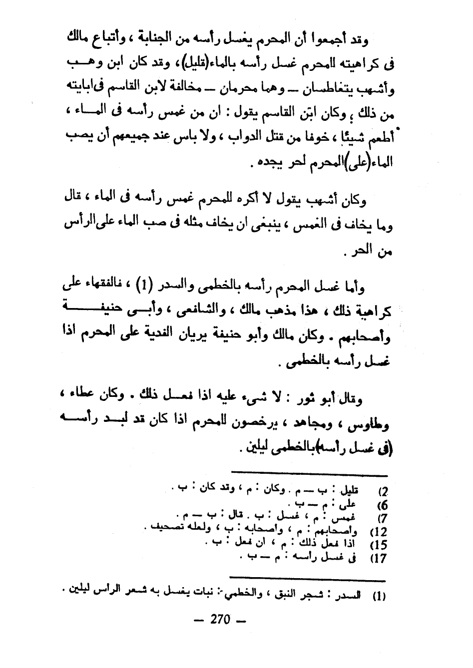 وَقَدْ أَجْمَعُوا أَنَّ الْمُحْرِمَ يَغْسِلُ رَأْسَهُ مِنَ الْجَنَابَةِ وَأَتْبَاعُ مَالِكٍ فِي كَرَاهِيَتِهِ لِلْمُحْرِمِ غَسْلَ رَأْسِهِ بِالْمَاءِ (قَلِيلٌ) وَقَدْ كَانَ ابْنُ وَهْبٍ وَأَشْهَبُ يَتَغَاطَسَانِ وَهُمَا مُحْرِمَانِ مُخَالَفَةً لِابْنِ الْقَاسِمِ فِي إِبَايَتِهِ مِنْ ذَلِكَ وَكَانَ ابْنُ الْقَاسِمِ يَقُولُ إِنَّ مَنْ غَمَسَ رَأْسَهُ فِي الْمَاءِ أَطْعَمَ شَيْئًا خَوْفًا مِنْ قَتْلِ الدَّوَابِّ وَلَا بَأْسَ عِنْدَ جَمِيعِهِمْ أَنْ يُصَبَّ الْمَاءُ (عَلَى الْمُحْرِمِ لِحَرٍّ يَجِدُهُ وَكَانَ أَشْهَبُ يَقُولُ لَا أَكْرَهُ لِلْمُحْرِمِ غَمْسَ رَأْسِهِ فِي الْمَاءِ قَالَ وَمَا يُخَافُ فِي الْغَمْسِ يَنْبَغِي أَنْ يُخَافَ مِثْلُهُ فِي صَبِّ الْمَاءِ عَلَى الرَّأْسِ مِنَ الْحَرِّ وَأَمَّا غَسْلُ الْمُحْرِمِ رَأْسَهُ بِالْخِطْمِيِّ وَالسِّدْرِ (1) فَالْفُقَهَاءُ عَلَى كَرَاهِيَةِ ذَلِكَ هَذَا مَذْهَبُ مَالِكٍ وَالشَّافِعِيِّ وَأَبِي حَنِيفَةَ وَأَصْحَابِهِمْ وَكَانَ مَالِكٌ وَأَبُو حَنِيفَةَ يَرَيَانِ الْفِدْيَةَ عَلَى الْمُحْرِمِ إِذَا غَسَلَ رَأْسَهُ بِالْخِطْمِيِّ وَقَالَ أَبُو ثَوْرٍ لَا شَيْءَ عَلَيْهِ إِذَا فَعَلَ ذَلِكَ وَكَانَ عَطَاءٌ وَطَاوُسٌ وَمُجَاهِدٌ يُرَخِّصُونَ لِلْمُحْرِمِ إِذَا كَانَ قَدْ لَبَّدَ رَأْسَهُ (فِي غَسْلِ رَأْسِهِ) بِالْخِطْمِيِّ لِيَلِينَ