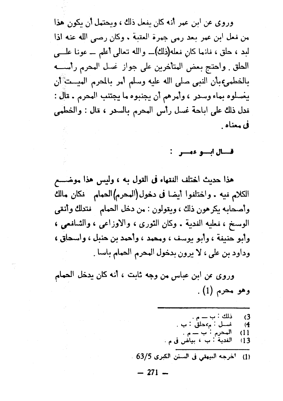 وَرُوِيَ عَنِ ابْنِ عُمَرَ أَنَّهُ كَانَ يَفْعَلُ ذَلِكَ وَيُحْتَمَلُ أَنْ يَكُونَ هَذَا مِنْ فِعْلِ ابْنِ عُمَرَ بَعْدَ رَمْيِ جَمْرَةِ الْعَقَبَةِ وَكَانَ رَضِيَ اللَّهُ عَنْهُ إِذَا لَبَّدَ حَلَقَ فَإِنَّمَا كَانَ فِعْلُهُ (ذَلِكَ) وَاللَّهُ تَعَالَى أَعْلَمُ عَوْنًا عَلَى الْحَلْقِ وَاحْتَجَّ بَعْضُ الْمُتَأَخِّرِينَ عَلَى جَوَازِ غَسْلِ الْمُحْرِمِ رَأْسَهُ بِالْخِطْمِيِّ بِأَنَّ النَّبِيَّ صَلَّى اللَّهُ عَلَيْهِ وَسَلَّمَ أَمَرَ بِالْمُحْرِمِ الْمَيِّتِ أَنْ يُغَسِّلُوهُ بِمَاءٍ وَسِدْرٍ وَأَمَرَهَمْ أَنْ يُجَنِّبُوهُ مَا يَجْتَنِبُ الْمُحْرِمُ قَالَ فَدَلَّ ذَلِكَ عَلَى إِبَاحَةِ غَسْلِ رَأْسِ الْمُحْرِمِ بِالسِّدْرِ قَالَ وَالْخِطْمِيُّ فِي مَعْنَاهُ قَالَ أَبُو عُمَرَ هَذَا حَدِيثٌ اخْتَلَفَ الْفُقَهَاءُ فِي الْقَوْلِ بِهِ وَلَيْسَ هَذَا مَوْضِعَ الْكَلَامِ فِيهِ وَاخْتَلَفُوا أَيْضًا فِي دُخُولِ (الْمُحْرِمِ) الْحَمَّامَ فَكَانَ مَالِكٌ وَأَصْحَابُهُ يَكْرَهُونَ ذَلِكَ وَيَقُولُونَ مَنْ دَخَلَ الْحَمَّامَ فَتَدَلَّكَ وَأَنْقَى الْوَسَخَ فَعَلَيْهِ الْفِدْيَةُ وَكَانَ الثَّوْرِيُّ وَالْأَوْزَاعِيُّ وَالشَّافِعِيُّ وَأَبُو حَنِيفَةَ وَأَبُو يُوسُفَ وَمُحَمَّدٌ وَأَحْمَدُ بْنُ حَنْبَلٍ وَإِسْحَاقُ وَدَاوُدُ بْنُ عَلِيٍّ لَا يَرَوْنَ بِدُخُولِ الْمُحْرِمِ الْحَمَّامَ بَأْسًا وَرُوِيِ عَنِ ابْنِ عَبَّاسٍ مِنْ وَجْهٍ ثَابِتٍ أَنَّهُ كَانَ يَدْخُلُ الْحَمَّامَ وَهُوَ محرم