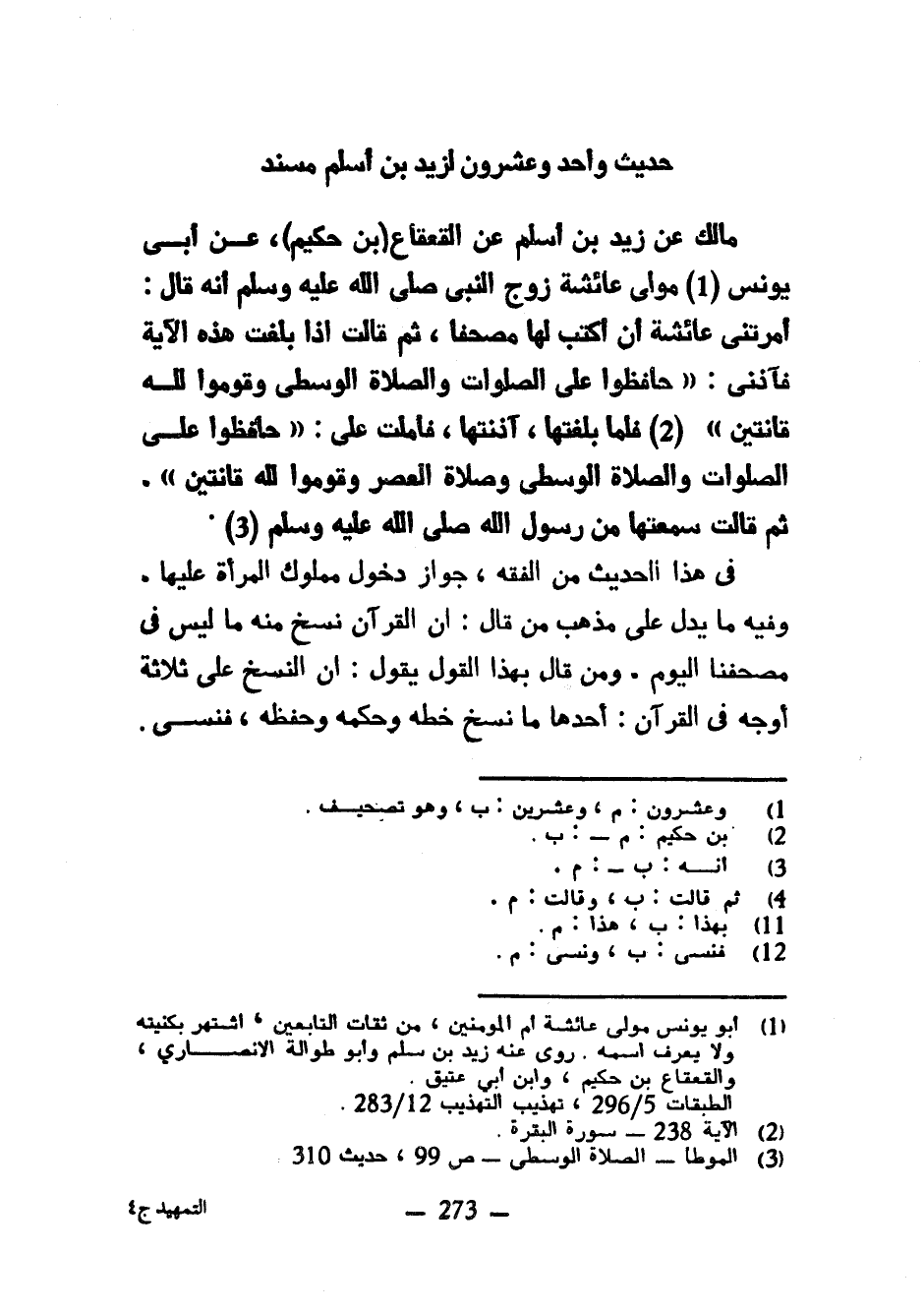 حَدِيثٌ وَاحِدٌ وَعِشْرُونَ لِزَيْدِ بْنِ أَسْلَمَ مُسْنَدٌ مَالِكٌ عَنْ زَيْدِ ابْنِ أَسْلَمَ عَنْ الْقَعْقَاعِ (بْنِ حَكِيمٍ) عَنْ أَبِي يُونُسَ مَوْلَى عَائِشَةَ زَوْجَ النَّبِيِّ صَلَّى اللَّهُ عَلَيْهِ وَسَلَّمَ أَنَّهُ قَالَ أَمَرَتْنِي عَائِشَةُ أَنْ أَكْتُبَ لَهَا مُصْحَفًا ثُمَّ قَالَتْ إِذَا بَلَغْتَ هَذِهِ الْآيَةَ فَآذِنِّي حَافِظُوا عَلَى الصَّلَوَاتِ وَالصَّلَاةِ الْوُسْطَى وَقُومُوا لِلَّهِ قَانِتِينَ فَلَمَّا بَلَغْتُهَا آذَنْتُهَا فَأَمْلَتْ عَلَيَّ حَافِظُوا عَلَى الصَّلَوَاتِ وَالصَّلَاةِ الْوُسْطَى وَصَلَاةِ الْعَصْرِ وَقُومُوا لِلَّهِ قَانِتِينَ ثُمَّ قَالَتْ سَمِعْتُهَا مِنْ رَسُولِ اللَّهِ صَلَّى اللَّهُ عَلَيْهِ وَسَلَّمَ فِي هَذَا الْحَدِيثِ مِنَ الْفِقْهِ جَوَازُ دُخُولِ مَمْلُوكِ الْمَرْأَةِ عَلَيْهَا وَفِيهِ مَا يَدُلُّ عَلَى مَذْهَبِ مَنْ قَالَ إِنَّ الْقُرْآنَ نُسِخَ مِنْهُ مَا لَيْسَ فِي مُصْحَفِنَا الْيَوْمَ وَمَنْ قَالَ بِهَذَا الْقَوْلِ يَقُولُ إِنَّ النَّسْخَ عَلَى ثَلَاثَةِ أَوْجُهٍ فِي الْقُرْآنِ أَحَدُهَا مَا نُسِخَ خَطُّهُ وَحُكْمُهُ وَحِفْظُهُ فَنُسِيَ