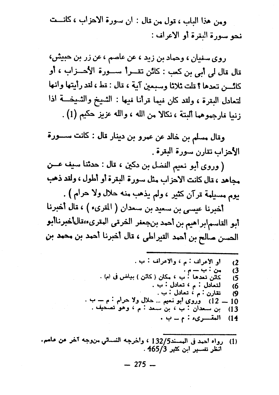 وَمِنْ هَذَا الْبَابِ قَوْلُ مَنْ قَالَ إِنَّ سُورَةَ الْأَحْزَابِ كَانَتْ نَحْوَ سُورَةِ الْبَقَرَةِ أَوِ الْأَعْرَافِ رَوَى سُفْيَانُ وَحَمَّادُ بْنُ زَيْدٍ عَنْ عَاصِمٍ عَنْ زِرِّ بْنِ حُبَيْشٍ قَالَ قَالَ لي أبي بن كعب كائن تقرأ سورة الأحزاب أو كائن تَعِدُّهَا قُلْتُ ثَلَاثًا وَسَبْعِينَ آيَةً قَالَ قَطُّ لَقَدْ رَأَيْتُهَا وَإِنَّهَا لَتُعَادِلُ الْبَقَرَةَ وَلَقَدْ كَانَ فِيمَا قَرَأْنَا فِيهَا الشَّيْخُ وَالشَّيْخَةُ إِذَا زَنَيَا فَارْجُمُوهُمَا الْبَتَّةَ نَكَالًا مِنَ اللَّهِ وَاللَّهُ عَزِيزٌ حَكِيمٌ وَقَالَ مُسْلِمُ بْنُ خَالِدٍ عَنْ عَمْرِو بْنِ دِينَارٍ قَالَ كَانَتْ سُورَةُ الْأَحْزَابِ تُقَارِنُ سُورَةَ الْبَقَرَةِ (وَرَوَى أَبُو نُعَيْمٍ الْفَضْلُ بْنُ دُكَيْنٍ قَالَ حَدَّثَنَا سَيْفٌ عَنْ مُجَاهِدٍ قَالَ كَانَتِ الْأَحْزَابُ مِثْلَ سُورَةِ الْبَقَرَةِ أَوْ أَطْوَلَ وَلَقَدْ ذَهَبَ يَوْمَ مُسَيْلِمَةَ قُرْآنٌ كَثِيرٌ وَلَمْ يَذْهَبْ مِنْهُ حَلَالٌ وَلَا حَرَامٌ) أَخْبَرَنَا عِيسَى بْنُ سَعِيدِ بْنِ سَعْدَانَ (الْمُقْرِئُ) قَالَ أَخْبَرَنَا أَبُو الْقَاسِمِ إِبْرَاهِيمُ بْنُ أَحْمَدَ بْنِ جَعْفَرٍ الْخِرَقِيُّ الْمُقْرِئُ قَالَ أَخْبَرَنَا أَبُو الْحَسَنِ صَالِحُ بْنُ أَحْمَدَ الْقِيرَاطِيُّ قَالَ أَخْبَرَنَا أَحْمَدُ بْنُ محمد بن