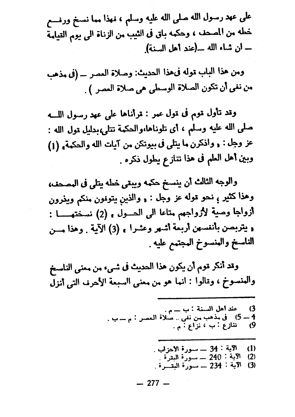 عَلَى عَهْدِ رَسُولِ اللَّهِ صَلَّى اللَّهُ عَلَيْهِ وَسَلَّمَ فَهَذَا مِمَّا نُسِخَ وَرُفِعَ خَطُّهُ مِنَ الْمُصْحَفِ وَحُكْمُهُ بَاقٍ فِي الثَّيِّبِ مِنَ الزُّنَاةِ إِلَى يَوْمِ الْقِيَامَةِ إِنْ شَاءَ اللَّهُ (عِنْدَ أَهْلِ السُّنَّةِ) وَمِنْ هَذَا الْبَابِ قَوْلُهُ فِي هَذَا الْحَدِيثِ وَصَلَاةُ الْعَصْرِ (فِي مَذْهَبِ مَنْ نَفَى أَنْ تَكُونَ الصَّلَاةُ الْوُسْطَى هِيَ صَلَاةَ الْعَصْرِ) وَقَدْ تَأَوَّلَ قَوْمٌ فِي قَوْلِ عُمَرَ قَرَأْنَاهَا عَلَى عَهْدِ رَسُولِ اللَّهِ صَلَّى اللَّهُ عَلَيْهِ وَسَلَّمَ أَيْ تَلَوْنَاهَا وَالْحِكْمَةُ تُتْلَى بِدَلِيلِ قَوْلِ اللَّهِ عَزَّ وَجَلَّ وَاذْكُرْنَ مَا يُتْلَى فِي بُيُوتِكُنَّ مِنْ آيَاتِ اللَّهِ وَالْحِكْمَةِ وَبَيْنَ أَهْلِ الْعِلْمِ فِي هَذَا تَنَازُعٌ يَطُولُ ذِكْرُهُ وَالْوَجْهُ الثَّالِثُ أَنْ يُنْسَخَ حُكْمُهُ وَيَبْقَى خَطُّهُ يُتْلَى فِي الْمُصْحَفِ وَهَذَا كَثِيرٌ نَحْوَ قَوْلِهِ عَزَّ وَجَلَّ وَالَّذِينَ يُتَوَفَّوْنَ مِنْكُمْ وَيَذَرُونَ أَزْوَاجًا وَصِيَّةً لِأَزْوَاجِهِمْ مَتَاعًا إِلَى الْحَوْلِ نَسَخَتْهَا يَتَرَبَّصْنَ بِأَنْفُسِهِنَّ أَرْبَعَةَ أَشْهُرٍ وَعَشْرًا الْآيَةَ وَهَذَا مِنَ النَّاسِخِ وَالْمَنْسُوخِ الْمُجْتَمَعِ عَلَيْهِ وَقَدْ أَنْكَرَ قَوْمٌ أَنْ يَكُونَ هَذَا الْحَدِيثُ فِي شَيْءٍ مِنْ مَعْنَى النَّاسِخِ وَالْمَنْسُوخِ وَقَالُوا إِنَّمَا هُوَ مِنْ مَعْنَى السَّبْعَةِ الْأَحْرُفِ الَّتِي أَنْزَلَ