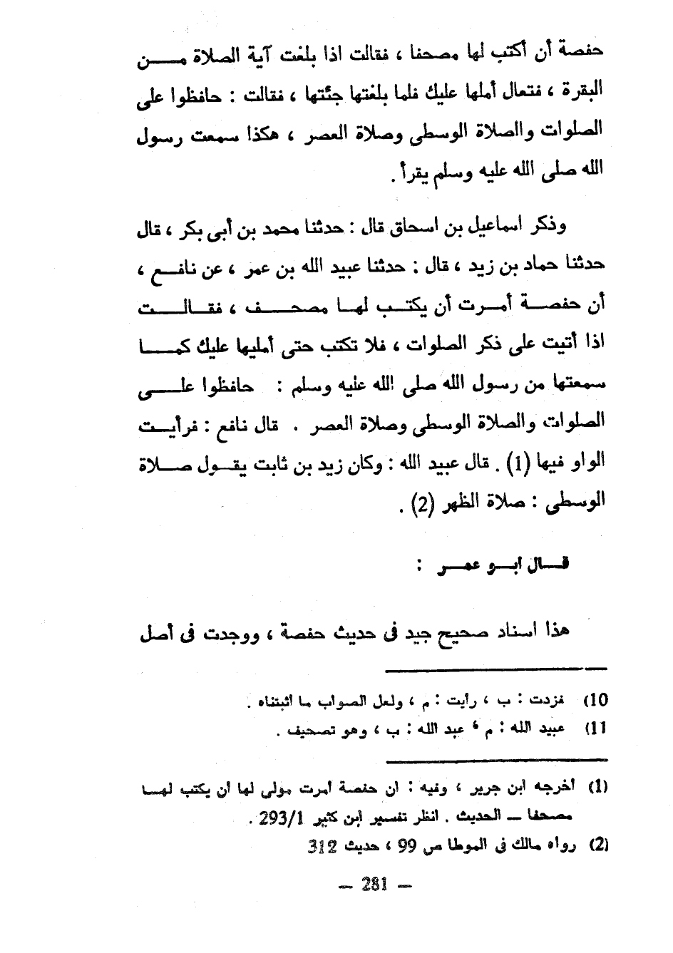 حَفْصَةُ أَنْ أَكْتُبَ لَهَا مُصْحَفًا فَقَالَتْ إِذَا بَلَغْتَ آيَةَ الصَّلَاةِ مِنَ الْبَقَرَةِ فَتَعَالَ أُمْلِهَا عَلَيْكَ فَلَمَّا بَلَغْتُهَا جِئْتُهَا فَقَالَتْ حَافِظُوا عَلَى الصَّلَوَاتِ وَالصَّلَاةِ الْوُسْطَى وَصَلَاةِ الْعَصْرِ هَكَذَا سَمِعْتُ رَسُولَ اللَّهِ صَلَّى اللَّهُ عَلَيْهِ وَسَلَّمَ يَقْرَأُ وذكر إسمعيل بن إسحاق قال حدثنا محمد بن أبي بَكْرٍ قَالَ حَدَّثَنَا حَمَّادُ بْنُ زَيْدٍ قَالَ حَدَّثَنَا عُبَيْدُ اللَّهِ بْنُ عُمَرَ عَنْ نَافِعٍ أَنَّ حَفْصَةَ أَمَرَتْ أَنْ يُكْتَبَ لَهَا مُصْحَفٌ فَقَالَتْ إِذَا أَتَيْتَ عَلَى ذِكْرِ الصَّلَوَاتِ فَلَا تَكْتُبْ حَتَّى أُمْلِيَهَا عَلَيْكَ كَمَا سَمِعْتُهَا مِنْ رَسُولِ اللَّهِ صَلَّى اللَّهُ عَلَيْهِ وَسَلَّمَ حَافِظُوا عَلَى الصَّلَوَاتِ وَالصَّلَاةِ الْوُسْطَى وَصَلَاةِ الْعَصْرِ قَالَ نَافِعٌ فَرَأَيْتُ الْوَاوَ فِيهَا قَالَ عُبَيْدُ اللَّهِ وَكَانَ زَيْدُ بْنُ ثَابِتٍ يَقُولُ صَلَاةُ الْوُسْطَى صَلَاةُ الظُّهْرِ قَالَ أَبُو عُمَرَ هَذَا إِسْنَادٌ صَحِيحٌ جَيِّدٌ فِي حَدِيثِ حَفْصَةَ وَوَجَدْتُ فِي أَصْلِ