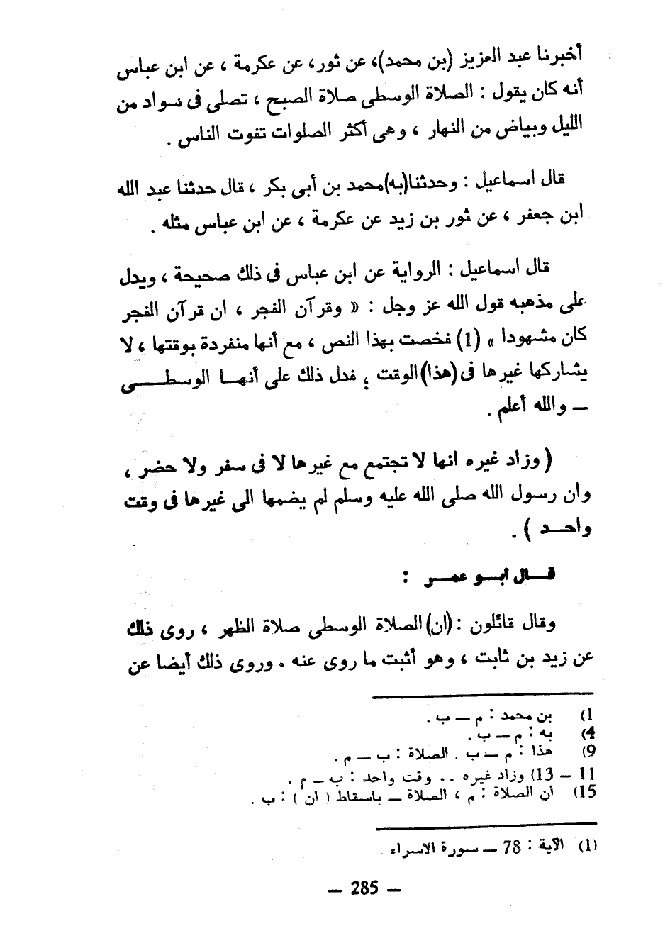 أَخْبَرَنَا عَبْدُ الْعَزِيزِ (بْنُ مُحَمَّدٍ) عَنْ ثَوْرٍ عَنْ عِكْرِمَةَ عَنِ ابْنِ عَبَّاسٍ أَنَّهُ كَانَ يَقُولُ الصَّلَاةُ الْوُسْطَى صَلَاةُ الصُّبْحِ تُصَلَّى فِي سَوَادٍ مِنَ اللَّيْلِ وَبَيَاضٍ مِنَ النَّهَارِ وَهِيَ أكثر الصلوات تفوت الناس قال إسمعيل وَحَدَّثَنَا (بِهِ) مُحَمَّدُ بْنُ أَبِي بَكْرٍ قَالَ حدثنا عبد الله ابن جَعْفَرٍ عَنْ ثَوْرِ بْنِ زَيْدٍ عَنْ عِكْرِمَةَ عَنِ ابْنِ عَبَّاسٍ مِثْلَهُ قَالَ إِسْمَاعِيلُ الرِّوَايَةُ عَنِ ابْنِ عَبَّاسٍ فِي ذَلِكَ صَحِيحَةٌ وَيَدُلُّ عَلَى مَذْهَبِهِ قَوْلُ اللَّهِ عَزَّ وَجَلَّ وَقُرْآنَ الْفَجْرِ إِنَّ قُرْآنَ الْفَجْرِ كَانَ مَشْهُودًا فَخُصَّتْ بِهَذَا النَّصِّ مَعَ أَنَّهَا مُنْفَرِدَةٌ بِوَقْتِهَا لَا يُشَارِكُهَا غَيْرُهَا فِي (هَذَا) الْوَقْتِ فَدَلَّ ذَلِكَ عَلَى أَنَّهَا الْوُسْطَى وَاللَّهُ أَعْلَمُ (وَزَادَ غَيْرُهُ إِنَّهَا لَا تَجْتَمِعُ مَعَ غَيْرِهَا لَا فِي سَفَرٍ وَلَا حَضَرٍ وَأَنَّ رَسُولَ اللَّهِ صَلَّى اللَّهُ عَلَيْهِ وَسَلَّمَ لَمْ يَضُمَّهَا إِلَى غَيْرِهَا فِي وَقْتٍ وَاحِدٍ) قَالَ أَبُو عُمَرَ وَقَالَ قَائِلُونَ (إِنَّ) الصَّلَاةَ الْوُسْطَى صَلَاةُ الظُّهْرِ رُوِيَ ذَلِكَ عَنْ زَيْدِ بْنِ ثَابِتٍ وَهُوَ أَثْبَتُ مَا رُوِيَ عَنْهُ وَرُوِيَ ذَلِكَ أَيْضًا عَنْ