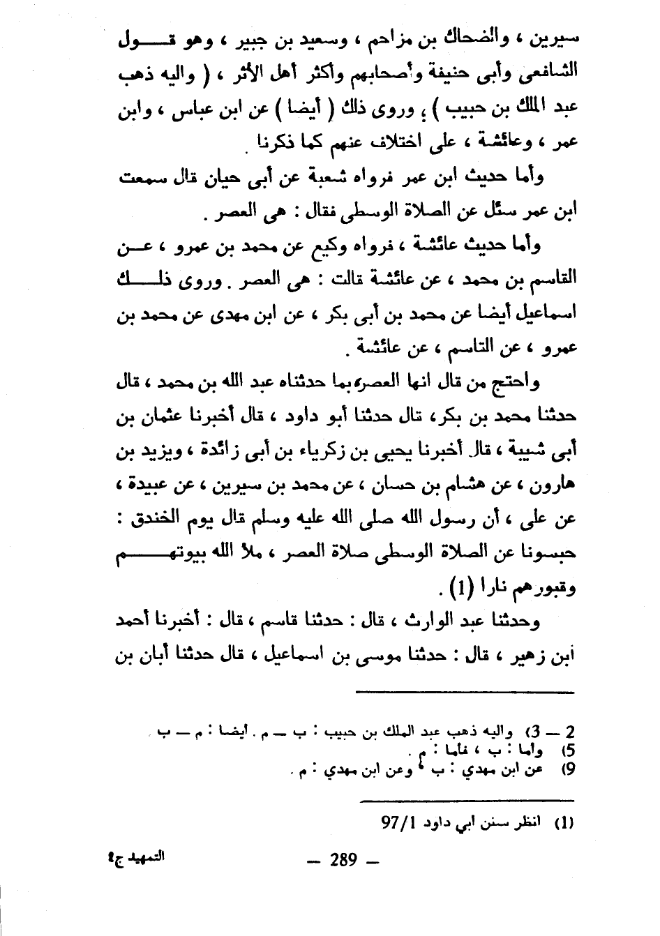 سِيرِينَ وَالضَّحَّاكِ بْنِ مُزَاحِمٍ وَسَعِيدِ بْنِ جُبَيْرٍ وَهُوَ قَوْلُ الشَّافِعِيِّ وَأَبِي حَنِيفَةَ وَأَصْحَابِهِمْ وَأَكْثَرِ أَهْلِ الْأَثَرِ (وَإِلَيْهِ ذَهَبَ عَبْدُ الْمَلِكِ بْنُ حَبِيبٍ) وَرُوِيَ ذَلِكَ (أَيْضًا) عَنِ ابْنِ عَبَّاسٍ وَابْنِ عُمَرَ وَعَائِشَةَ عَلَى اخْتِلَافٍ عَنْهُمْ كَمَا ذَكَرْنَا وَأَمَّا حَدِيثُ ابْنِ عُمَرَ فَرَوَاهُ شُعْبَةُ عَنْ أَبِي حَيَّانَ قَالَ سَمِعْتُ ابْنَ عُمَرَ سُئِلَ عَنِ الصَّلَاةِ الْوُسْطَى فَقَالَ هِيَ الْعَصْرُ وَأَمَّا حَدِيثُ عَائِشَةَ فَرَوَاهُ وَكِيعٌ عَنْ مُحَمَّدِ بْنِ عَمْرٍو عَنِ الْقَاسِمِ بْنِ مُحَمَّدٍ عَنْ عَائِشَةَ قَالَتْ هِيَ الْعَصْرُ وَرَوَى ذَلِكَ إِسْمَاعِيلُ أَيْضًا عَنْ مُحَمَّدِ بْنِ أَبِي بَكْرٍ عَنِ ابْنِ مَهْدِيٍّ عَنْ مُحَمَّدِ بْنِ عَمْرٍو عَنِ الْقَاسِمِ عَنْ عَائِشَةَ وَاحْتَجَّ مَنْ قَالَ إِنَّهَا الْعَصْرُ بِمَا حَدَّثَنَاهُ عَبْدُ اللَّهِ بْنُ مُحَمَّدٍ قَالَ حَدَّثَنَا مُحَمَّدُ بْنُ بَكْرٍ قَالَ حَدَّثَنَا أَبُو دَاوُدَ قَالَ أَخْبَرَنَا عُثْمَانُ بْنُ أَبِي شَيْبَةَ قَالَ أَخْبَرَنَا يَحْيَى بْنُ زَكَرِيَّاءَ بْنِ أَبِي زَائِدَةَ وَيَزِيدُ بْنُ هَارُونَ عَنْ هِشَامُ بْنُ حَسَّانَ عَنْ مُحَمَّدِ بْنِ سِيرِينَ عن عُبَيْدَةَ عَنْ عَلَى أَنَّ رَسُولَ اللَّهِ صَلَّى اللَّهُ عَلَيْهِ وَسَلَّمَ قَالَ يَوْمَ الْخَنْدَقِ حَبَسُونَا عَنِ الصَّلَاةِ الْوُسْطَى صَلَاةِ الْعَصْرِ مَلَأَ اللَّهُ بُيُوتَهُمْ وَقُبُورَهُمْ نَارًا وَحَدَّثَنَا عَبْدُ الْوَارِثِ قَالَ حَدَّثَنَا قَاسِمٌ قَالَ أخبرنا أحمد ابن زُهَيْرٍ قَالَ حَدَّثَنَا مُوسَى بْنُ إِسْمَاعِيلَ قَالَ حَدَّثَنَا أَبَانُ بْنُ