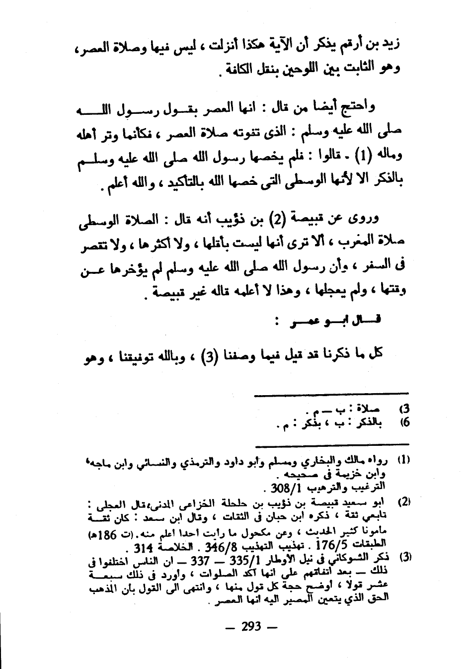 زَيْدُ بْنُ أَرْقَمَ يَذْكُرُ أَنَّ الْآيَةَ هَكَذَا أُنْزِلَتْ لَيْسَ فِيهَا وَصَلَاةِ الْعَصْرِ وَهُوَ الثَّابِتُ بَيْنَ اللَّوْحَيْنِ بِنَقْلِ الْكَافَّةِ وَاحْتَجَّ أَيْضًا مَنْ قَالَ إِنَّهَا الْعَصْرُ بِقَوْلِ رَسُولِ اللَّهِ صَلَّى اللَّهُ عَلَيْهِ وَسَلَّمَ الَّذِي تَفُوتُهُ صَلَاةُ الْعَصْرِ فَكَأَنَّمَا وُتِرَ أَهْلُهُ وَمَالُهُ قَالُوا فَلَمْ يَخُصَّهَا رَسُولُ اللَّهِ صَلَّى اللَّهُ عَلَيْهِ وَسَلَّمَ بِالذِّكْرِ إِلَّا لِأَنَّهَا الْوُسْطَى الَّتِي خَصَّهَا اللَّهُ بِالتَّأْكِيدِ وَاللَّهُ أَعْلَمُ وَرُوِيَ عَنْ قَبِيصَةَ بْنِ ذُؤَيْبٍ أَنَّهُ قَالَ الصَّلَاةُ الْوُسْطَى صَلَاةُ الْمَغْرِبِ أَلَا تَرَى أَنَّهَا لَيْسَتْ بِأَقَلِّهَا وَلَا أَكْثَرِهَا وَلَا تُقْصَرُ فِي السَّفَرِ وَأَنَّ رَسُولَ اللَّهِ صَلَّى اللَّهُ عَلَيْهِ وَسَلَّمَ لَمْ يُؤَخِّرْهَا عَنْ وَقْتِهَا وَلَمْ يُعَجِّلْهَا وَهَذَا لَا أَعْلَمُهُ قَالَهُ غَيْرُ قَبِيصَةَ قَالَ أَبُو عُمَرَ كُلُّ مَا ذَكَرْنَا قَدْ قِيلَ فِيمَا وَصَفْنَا وَبِاللَّهِ تَوْفِيقُنَا وَهُوَ