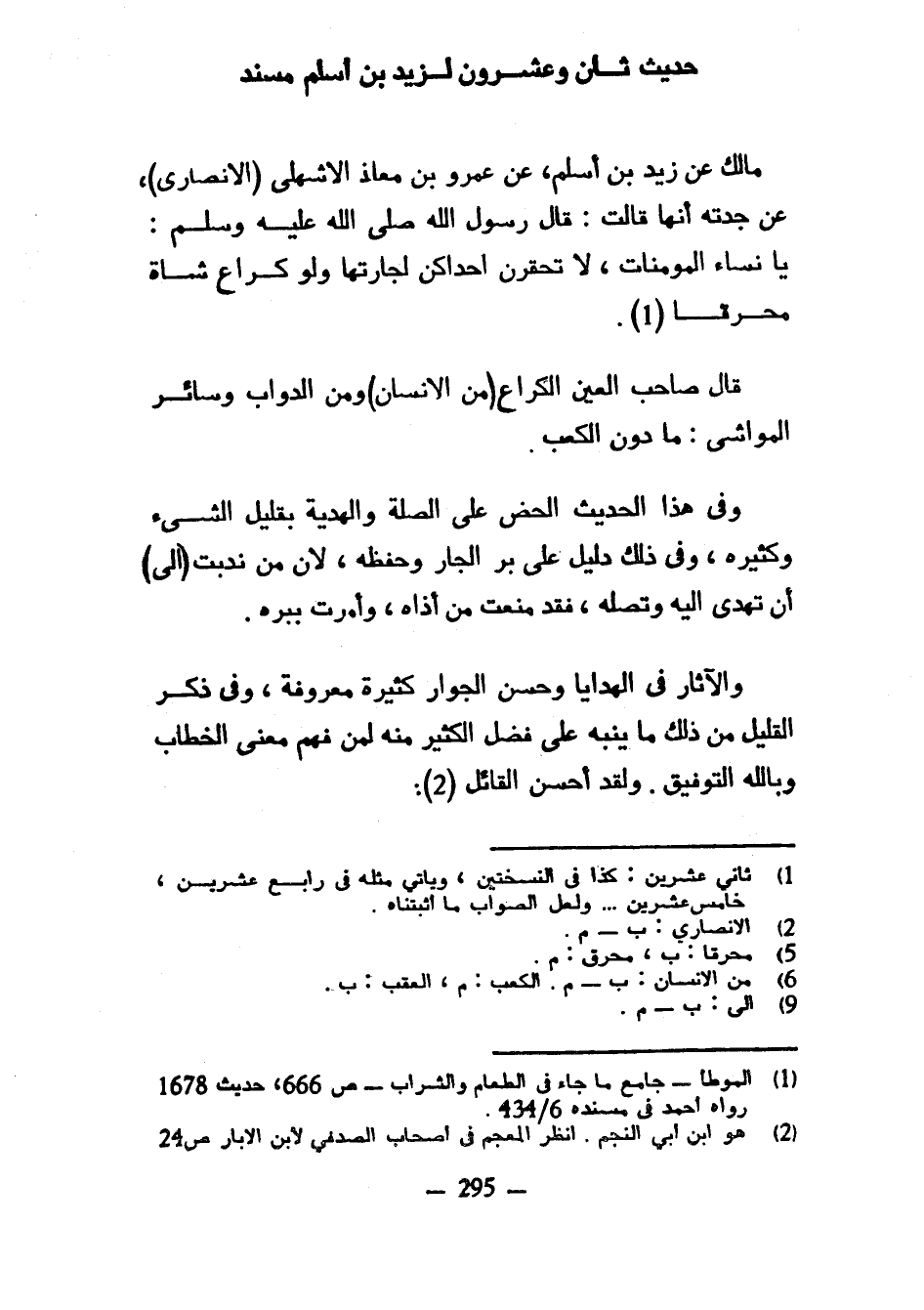 حَدِيثٌ ثَانٍ وَعِشْرُونَ لِزَيْدِ بْنِ أَسْلَمَ مُسْنَدٌ مَالِكٌ عَنْ زَيْدِ بْنِ أَسْلَمَ عَنْ عَمْرِو بْنِ مُعَاذٍ الْأَشْهَلِيِّ (الْأَنْصَارِيِّ) عَنْ جَدَّتِهِ أَنَّهَا قَالَتْ قَالَ رَسُولُ اللَّهِ صَلَّى اللَّهُ عَلَيْهِ وَسَلَّمَ يَا نِسَاءَ الْمُؤْمِنَاتِ لَا تَحْقِرَنَّ أَحَدُكُنَّ لِجَارَتِهَا وَلَوْ كُرَاعَ شَاةٍ مُحْرَقًا قَالَ صَاحِبُ الْعَيْنِ الْكُرَاعُ (مِنَ الْإِنْسَانِ) وَمِنَ الدَّوَابِّ وَسَائِرِ الْمَوَاشِي مَا دُونَ الْكَعْبِ وَفِي هَذَا الْحَدِيثِ الْحَضُّ عَلَى الصِّلَةِ وَالْهَدِيَّةِ بِقَلِيلِ الشَّيْءِ وَكَثِيرِهِ وَفِي ذَلِكَ دَلِيلٌ عَلَى بِرِّ الْجَارِ وَحِفْظِهِ لِأَنَّ مَنْ نُدِبْتَ (إِلَى) أَنْ تُهْدِيَ إِلَيْهِ وَتَصِلَهُ فَقَدْ مُنِعْتَ مِنْ أَذَاهُ وَأُمِرْتَ بِبِرِّهِ وَالْآثَارُ فِي الْهَدَايَا وَحُسْنِ الْجِوَارِ كَثِيرَةٌ مَعْرُوفَةٌ وَفِي ذِكْرِ الْقَلِيلِ مِنْ ذَلِكَ مَا يُنَبِّهُ عَلَى فَضْلِ الْكَثِيرِ مِنْهُ لِمَنْ فَهِمَ مَعْنَى الْخِطَابِ وَبِاللَّهِ التَّوْفِيقُ وَلَقَدْ أَحْسَنَ الْقَائِلُ