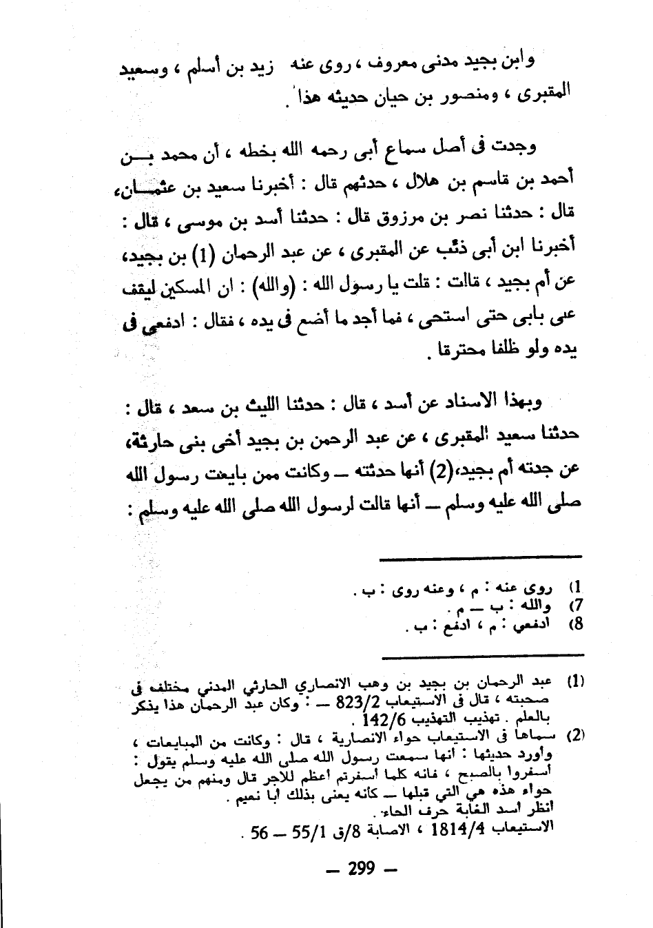 وَابْنُ بُجَيْدٍ مَدَنِيٌّ مَعْرُوفٌ رَوَى عَنْهُ زَيْدُ ابن أَسْلَمَ وَسَعِيدٌ الْمَقْبُرِيُّ وَمَنْصُورُ بْنُ حَيَّانَ حَدِيثُهُ هَذَا وَجَدْتُ فِي أَصْلِ سَمَاعِ أَبِي رَحِمَهُ اللَّهُ بِخَطِّهِ أَنَّ مُحَمَّدَ بْنَ أَحْمَدَ بْنِ قَاسِمِ بْنِ هِلَالٍ حَدَّثَهُمْ قَالَ أَخْبَرَنَا سَعِيدُ بْنُ عُثْمَانَ قَالَ حَدَّثَنَا نَصْرُ بْنُ مَرْزُوقٍ قَالَ حَدَّثَنَا أَسَدُ بْنُ مُوسَى قَالَ أَخْبَرَنَا ابْنُ أَبِي ذِئْبٍ عَنِ الْمَقْبُرِيِّ عَنْ عَبْدِ الرحمان بْنِ بُجَيْدٍ عَنْ أُمِّ بُجَيْدٍ قَالَتْ قُلْتُ يَا رَسُولَ اللَّهِ (وَاللَّهِ) إِنَّ الْمِسْكِينَ لَيَقِفُ على بابي حتى استحي فَمَا أَجِدُ مَا أَضَعُ فِي يَدِهِ فَقَالَ ادْفَعِي فِي يَدِهِ وَلَوْ ظِلْفًا مُحْتَرِقًا وَبِهَذَا الْإِسْنَادِ عَنْ أَسَدٍ قَالَ حَدَّثَنَا اللَّيْثُ بْنُ سَعْدٍ قَالَ حَدَّثَنَا سَعِيدٌ الْمَقْبُرِيُّ عَنْ عَبْدِ الرَّحْمَنِ بْنِ بُجَيْدٍ أَخِي بَنِي حَارِثَةَ عَنْ جَدَّتِهِ أُمِّ بُجَيْدٍ أَنَّهَا حَدَّثَتْهُ وَكَانَتْ مِمَّنْ بَايَعَتْ رَسُولُ اللَّهِ صَلَّى اللَّهُ عَلَيْهِ وَسَلَّمَ إِنَّهَا قَالَتْ لِرَسُولِ اللَّهِ صَلَّى اللَّهُ عَلَيْهِ وسلم