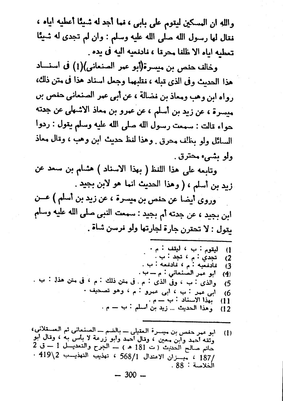 وَاللَّهِ إِنَّ الْمِسْكِينَ لَيَقُومَ عَلَى بَابِي فَمَا أَجِدُ لَهُ شَيْئًا أُعْطِيهِ إِيَّاهُ فَقَالَ لَهَا رَسُولُ اللَّهِ صَلَّى اللَّهُ عَلَيْهِ وسلم وإن لَمْ تَجِدِي لَهُ شَيْئًا تُعْطِيهِ إِيَّاهُ إِلَّا ظِلْفًا مُحْرَقًا فَادْفَعِيهِ إِلَيْهِ فِي يَدِهِ وَخَالَفَ حَفْصُ بْنُ مَيْسَرَةَ (أَبُو عُمَرَ الصَّنْعَانِيُّ) فِي إِسْنَادِ هَذَا الْحَدِيثِ وَفِي الَّذِي قَبْلَهُ فَقَلَبَهُمَا وَجَعَلَ إِسْنَادَ هَذَا فِي مَتْنِ ذَلِكَ رَوَاهُ ابْنُ وَهْبٍ وَمُعَاذُ بْنُ فَضَالَةَ عَنْ أَبِي عُمَرَ الصَّنْعَانِيِّ حَفْصِ بْنِ مَيْسَرَةَ عَنْ زَيْدِ بْنِ أَسْلَمَ عَنْ عَمْرِو بْنِ مُعَاذٍ الْأَشْهَلِيِّ عَنْ جَدَّتِهِ حَوَّاءَ قَالَتْ سَمِعْتُ رَسُولَ اللَّهِ صَلَّى اللَّهُ عَلَيْهِ وَسَلَّمَ يَقُولُ رُدُّوا السَّائِلَ وَلَوْ بِظِلْفٍ مُحْرَقٍ وَهَذَا لَفْظُ حَدِيثِ ابْنِ وهب وقال معاذ ولو بشيء مُحْتَرِقٌ وَتَابَعَهُ عَلَى هَذَا اللَّفْظِ (بِهَذَا الْإِسْنَادِ) هشام بن سعد عن زيد ابن أَسْلَمَ (وَهَذَا الْحَدِيثُ إِنَّمَا هُوَ لِابْنِ بُجَيْدٍ وَرُوِيَ أَيْضًا عَنْ حَفْصِ بْنِ مَيْسَرَةِ عَنْ زيد ابن أَسْلَمَ) عَنِ ابْنِ بُجَيْدٍ عَنْ جَدَّتِهِ أُمِّ بُجَيْدٍ سَمِعْتُ النَّبِيَّ صَلَّى اللَّهُ عَلَيْهِ وَسَلَّمَ يَقُولُ لَا تَحْقِرَنَّ جَارَةٌ لِجَارَتِهَا وَلَوْ فِرْسِنَ شاة