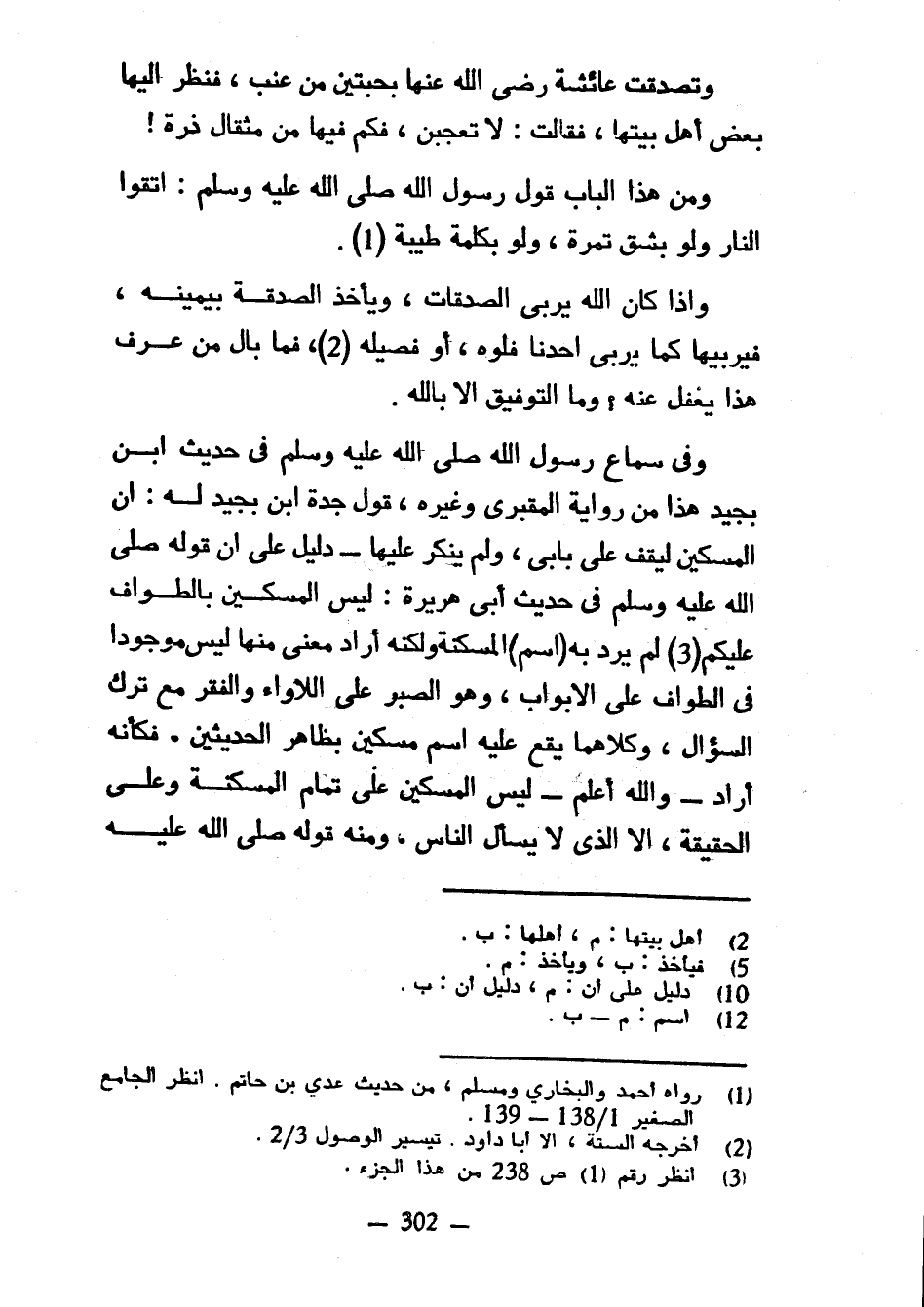 وَتَصَدَّقَتْ عَائِشَةُ رَضِيَ اللَّهُ عَنْهَا بِحَبَّتَيْنِ مِنْ عِنَبٍ فَنَظَرَ إِلَيْهَا بَعْضُ أَهْلِ بَيْتِهَا فَقَالَتْ لَا تَعْجَبُنَّ فَكَمْ فِيهَا مِنْ مِثْقَالِ ذَرَّةٍ وَمِنْ هَذَا الْبَابِ قَوْلُ رَسُولِ اللَّهِ صَلَّى اللَّهُ عَلَيْهِ وَسَلَّمَ اتَّقُوا النَّارَ وَلَوْ بِشِقِّ تَمْرَةٍ وَلَوْ بِكَلِمَةٍ طَيِّبَةٍ وَإِذَا كَانَ اللَّهُ يربي الصدقات ويأخذ الصدقة بيمينه فيربها كَمَا يُرَبِّي أَحَدُنَا فُلَوَّهُ أَوْ فَصِيلَهُ فَمَا بَالُ مَنْ عَرَفَ هَذَا يَغْفُلُ عَنْهُ وَمَا التَّوْفِيقُ إِلَّا بِاللَّهِ وَفِي سَمَاعِ رَسُولِ اللَّهِ صَلَّى اللَّهُ عَلَيْهِ وَسَلَّمَ فِي حَدِيثِ ابْنِ بُجَيْدٍ هَذَا مِنْ رِوَايَةِ الْمَقْبُرِيِّ وَغَيْرِهِ قَوْلُ جَدَّةِ ابْنِ بُجَيْدٍ لَهُ إِنَّ الْمِسْكِينَ لَيَقِفُ عَلَى بَابِي وَلَمْ يُنْكِرْ عَلَيْهَا دَلِيلٌ عَلَى أَنَّ قَوْلَهُ صَلَّى اللَّهُ عَلَيْهِ وَسَلَّمَ فِي حَدِيثِ أَبِي هُرَيْرَةَ لَيْسَ الْمِسْكِينُ بِالطَّوَّافِ عَلَيْكُمْ لَمْ يُرِدْ بِهِ (اسْمَ) الْمَسْكَنَةِ وَلَكِنَّهُ أَرَادَ مَعْنًى مِنْهَا لَيْسَ مَوْجُودًا فِي الطَّوَّافِ عَلَى الْأَبْوَابِ وَهُوَ الصَّبْرُ عَلَى اللَّأْوَاءِ وَالْفَقْرِ مَعَ تَرْكِ السُّؤَالِ وَكِلَاهُمَا يَقَعُ عَلَيْهِ اسْمُ مِسْكِينٍ بِظَاهِرِ الْحَدِيثَيْنِ فَكَأَنَّهُ أَرَادَ وَاللَّهُ أَعْلَمُ لَيْسَ الْمِسْكِينُ عَلَى تَمَامِ الْمَسْكَنَةِ وَعَلَى الْحَقِيقَةِ إِلَّا الَّذِي لَا يَسْأَلُ النَّاسَ وَمِنْهُ قَوْلُهُ صَلَّى اللَّهُ عَلَيْهِ وَسَلَّمَ