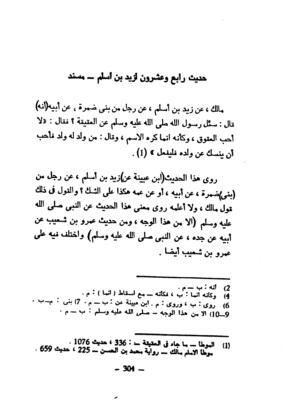 حَدِيثٌ رَابِعٌ وَعِشْرُونَ لِزَيْدِ بْنِ أَسْلَمَ مُسْنَدٌ مَالِكٌ عَنْ زَيْدِ ابْنِ أَسْلَمَ عَنْ رَجُلٍ مِنْ بَنِي ضَمْرَةَ عَنْ أَبِيهِ (أَنَّهُ) قَالَ سُئِلَ رَسُولُ اللَّهِ صَلَّى اللَّهُ عَلَيْهِ وَسَلَّمَ عَنِ الْعَقِيقَةِ فَقَالَ لَا أُحِبُّ الْعُقُوقَ وَكَأَنَّهُ إِنَّمَا كَرِهَ الِاسْمَ وَقَالَ مَنْ وُلِدَ لَهُ وَلَدٌ فَأَحَبَّ أَنْ يَنْسِكَ عَنْ وَلَدِهِ فَلْيَفْعَلْ رَوَى هَذَا الْحَدِيثَ (ابْنُ عُيَيْنَةَ عَنْ) زَيْدِ ابن أَسْلَمَ عَنْ رَجُلٍ مِنْ (بَنِي) ضَمْرَةَ عَنْ أَبِيهِ أَوْ عَنْ عَمِّهِ هَكَذَا عَلَى الشَّكِّ وَالْقَوْلُ فِي ذَلِكَ قَوْلُ مَالِكٍ وَلَا أَعْلَمُهُ رَوَى مَعْنَى هَذَا الْحَدِيثِ عَنِ النَّبِيِّ صَلَّى اللَّهُ عَلَيْهِ وَسَلَّمَ (إِلَّا مِنْ هَذَا الْوَجْهِ وَمِنْ حَدِيثِ عَمْرِو بْنِ شُعَيْبٍ عَنْ أَبِيهِ عَنْ جَدِّهِ عَنِ النَّبِيِّ صَلَّى اللَّهُ عَلَيْهِ وَسَلَّمَ) وَاخْتُلِفَ فِيهِ عَلَى عَمْرِو بْنِ شُعَيْبٍ أيضا
