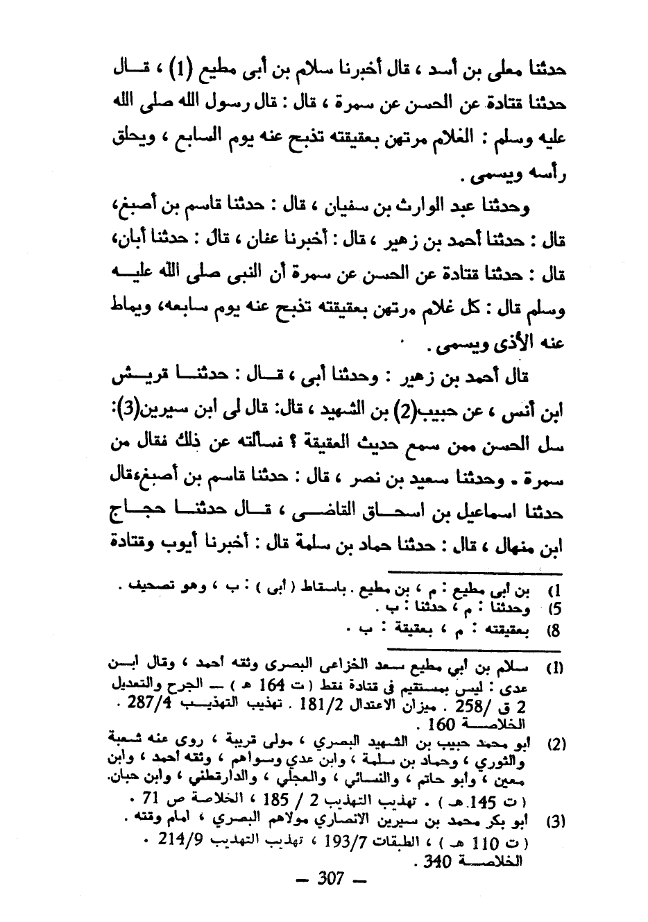 حَدَّثَنَا مُعَلَّى بْنُ أَسَدٍ قَالَ أَخْبَرَنَا سَلَامُ بْنُ أَبِي مُطِيعٍ قَالَ حَدَّثَنَا قَتَادَةُ عَنِ الْحَسَنِ عَنْ سَمُرَةَ قَالَ قَالَ رَسُولُ اللَّهِ صَلَّى اللَّهُ عَلَيْهِ وَسَلَّمَ الْغُلَامُ مُرْتَهَنٌ بِعَقِيقَتِهِ تُذْبَحُ عَنْهُ يَوْمَ السَّابِعِ وَيُحْلَقُ رَأْسُهُ وَيُسَمَّى وَحَدَّثَنَا عَبْدُ الْوَارِثِ بْنُ سُفْيَانَ قَالَ حَدَّثَنَا قَاسِمُ بْنُ أَصْبَغَ قَالَ حَدَّثَنَا أَحْمَدُ بْنُ زُهَيْرٍ قَالَ أَخْبَرَنَا عَفَّانُ قَالَ حَدَّثَنَا أَبَانٌ قَالَ حَدَّثَنَا قَتَادَةُ عَنِ الْحَسَنِ عَنْ سَمُرَةَ أَنَّ النَّبِيَّ صَلَّى اللَّهُ عَلَيْهِ وَسَلَّمَ قَالَ كُلُّ غُلَامٍ مُرْتَهَنٌ بِعَقِيقَتِهِ تُذْبَحُ عَنْهُ يَوْمَ سَابِعِهِ وَيُمَاطُ عَنْهُ الْأَذَى وَيُسَمَّى قَالَ أَحْمَدُ بْنُ زُهَيْرٍ وَحَدَّثَنَا أَبِي قَالَ حَدَّثَنَا قُرَيْشُ ابن أَنَسٍ عَنْ حَبِيبِ بْنِ الشَّهِيدِ قَالَ قَالَ لِي ابْنُ سِيرِينَ سَلِ الْحَسَنَ مِمَّنْ سَمِعَ حَدِيثَ الْعَقِيقَةِ فَسَأَلْتُهُ عَنْ ذَلِكَ فَقَالَ مِنْ سَمُرَةَ وَحَدَّثَنَا سَعِيدُ بْنُ نَصْرٍ قَالَ حَدَّثَنَا قَاسِمُ بْنُ أَصْبَغَ قَالَ حَدَّثَنَا إِسْمَاعِيلُ بْنُ إِسْحَاقَ القاضي قال حدثنا حجاج ابن مِنْهَالٍ قَالَ حَدَّثَنَا حَمَّادُ بْنُ سَلَمَةَ قَالَ أَخْبَرَنَا أَيُّوبُ وَقَتَادَةُ
