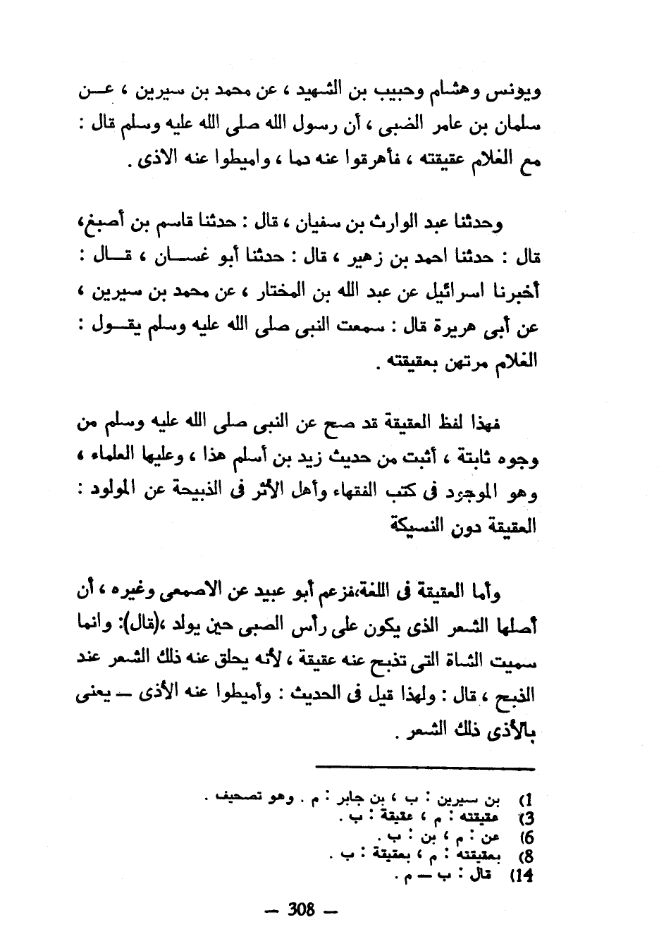 وَيُونُسُ وَهِشَامٌ وَحَبِيبُ بْنُ الشَّهِيدِ عَنْ مُحَمَّدِ بْنِ سِيرِينَ عَنْ سَلْمَانَ بْنِ عَامِرٍ الضَّبِّيِّ أن رسول الله صلى الله عليه وسلم قَالَ مَعَ الْغُلَامِ عَقِيقَتُهُ فَأَهْرِقُوا عَنْهُ دَمًا وَأَمِيطُوا عَنْهُ الْأَذَى وَحَدَّثَنَا عَبْدُ الْوَارِثِ بْنُ سُفْيَانَ قَالَ حَدَّثَنَا قَاسِمُ بْنُ أَصْبَغَ قَالَ حَدَّثَنَا أَحْمَدُ بْنُ زُهَيْرٍ قَالَ حَدَّثَنَا أَبُو غَسَّانَ قَالَ أَخْبَرَنَا إِسْرَائِيلُ عَنْ عَبْدِ اللَّهِ بْنِ الْمُخْتَارِ عَنْ مُحَمَّدِ بْنِ سِيرِينَ عَنْ أَبِي هُرَيْرَةَ قَالَ سَمِعْتُ النَّبِيَّ صَلَّى اللَّهُ عَلَيْهِ وَسَلَّمَ يَقُولُ الْغُلَامُ مُرْتَهَنٌ بِعَقِيقَتِهِ فَهَذَا لَفْظُ الْعَقِيقَةِ قَدْ صَحَّ عَنِ النَّبِيِّ صَلَّى اللَّهُ عَلَيْهِ وَسَلَّمَ مِنْ وُجُوهٍ ثَابِتَةٍ أَثْبَتُ مِنْ حَدِيثِ زَيْدِ بْنِ أَسْلَمَ هَذَا وَعَلَيْهَا الْعُلَمَاءُ وَهُوَ الْمَوْجُودُ فِي كُتُبِ الْفُقَهَاءِ وَأَهْلِ الْأَثَرِ فِي الذَّبِيحَةِ عَنِ الْمَوْلُودِ الْعَقِيقَةُ دُونَ النَّسِيكَةِ وَأَمَّا الْعَقِيقَةُ فِي اللُّغَةِ فَزَعَمَ أَبُو عُبَيْدٍ عَنِ الْأَصْمَعِيِّ وَغَيْرِهِ أَنَّ أَصْلَهَا الشَّعْرُ الَّذِي يَكُونُ عَلَى رَأْسِ الصَّبِيِّ حِينَ يُولَدُ (قَالَ) وَإِنَّمَا سُمِّيَتِ الشَّاةُ الَّتِي تُذْبَحُ عَنْهُ عَقِيقَةً لِأَنَّهُ يُحْلَقُ عَنْهُ ذَلِكَ الشَّعْرُ عِنْدَ الذَّبْحِ قَالَ وَلِهَذَا قِيلَ فِي الْحَدِيثِ وَأَمِيطُوا عَنْهُ الْأَذَى يَعْنِي بِالْأَذَى ذَلِكَ الشَّعْرَ