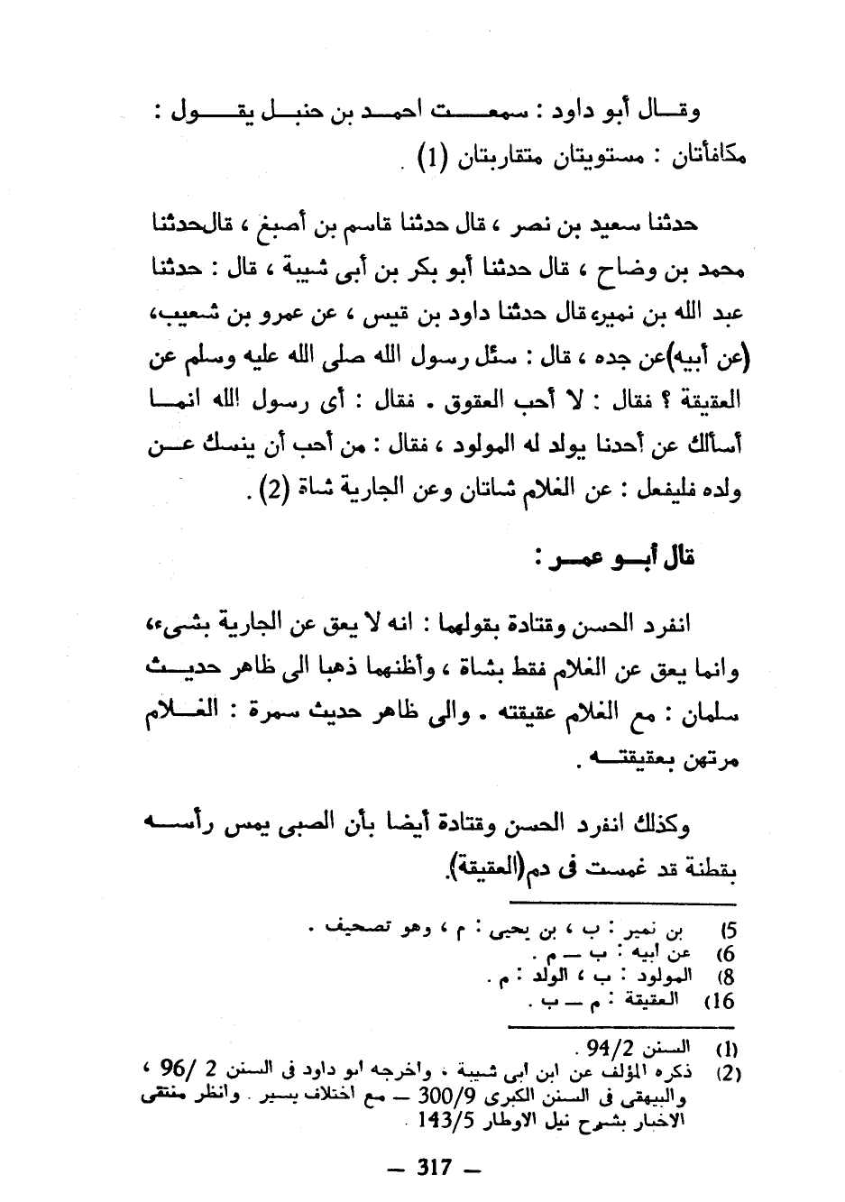 وَقَالَ أَبُو دَاوُدَ سَمِعْتُ أَحْمَدَ بْنَ حَنْبَلٍ يَقُولُ مُكَافَأَتَانِ مُسْتَوِيَتَانِ مُتَقَارِبَتَانِ حَدَّثَنَا سَعِيدُ بْنُ نَصْرٍ قَالَ حَدَّثَنَا قَاسِمُ بْنُ أَصْبَغَ قَالَ حَدَّثَنَا مُحَمَّدُ بْنُ وَضَّاحٍ قَالَ حَدَّثَنَا أَبُو بَكْرِ بْنُ أَبِي شَيْبَةَ قَالَ حَدَّثَنَا عَبْدُ اللَّهِ بْنُ نُمَيْرٍ قَالَ حَدَّثَنَا دَاوُدُ بْنُ قَيْسٍ عَنْ عَمْرِو بْنِ شُعَيْبٍ (عَنْ أَبِيهِ) عَنْ جَدِّهِ قَالَ سُئِلَ رَسُولُ اللَّهِ صَلَّى اللَّهُ عَلَيْهِ وَسَلَّمَ عَنِ الْعَقِيقَةِ فَقَالَ لَا أُحِبُّ الْعُقُوقَ فَقَالَ أَيْ رَسُولَ اللَّهِ إِنَّمَا أَسْأَلُكَ عَنْ أَحَدِنَا يُولَدُ لَهُ الْمَوْلُودُ فَقَالَ مَنْ أَحَبَّ أَنْ يَنْسِكَ عَنْ وَلَدِهِ فَلْيَفْعَلْ عَنِ الْغُلَامِ شَاتَانِ وَعَنِ الْجَارِيَةِ شَاةٌ قَالَ أَبُو عُمَرَ انْفَرَدَ الْحَسَنُ وَقَتَادَةُ بِقَوْلِهِمَا إِنَّهُ لَا يُعَقُّ عَنِ الْجَارِيَةِ بِشَيْءٍ وَإِنَّمَا يُعَقُّ عَنِ الْغُلَامِ فَقَطْ بِشَاةٍ وَأَظُنُّهُمَا ذَهَبَا إِلَى ظَاهِرِ حَدِيثِ سَلْمَانَ مَعَ الْغُلَامِ عَقِيقَتُهُ وَالَى ظَاهِرِ حَدِيثِ سَمُرَةَ الْغُلَامُ مُرْتَهَنٌ بِعَقِيقَتِهِ وَكَذَلِكَ انْفَرَدَ الْحَسَنُ وَقَتَادَةُ أَيْضًا بِأَنَّ الصَّبِيَّ يُمَسُّ رَأْسُهُ بِقُطْنَةٍ قَدْ غُمِسَتْ فِي دَمِ (الْعَقِيقَةِ)