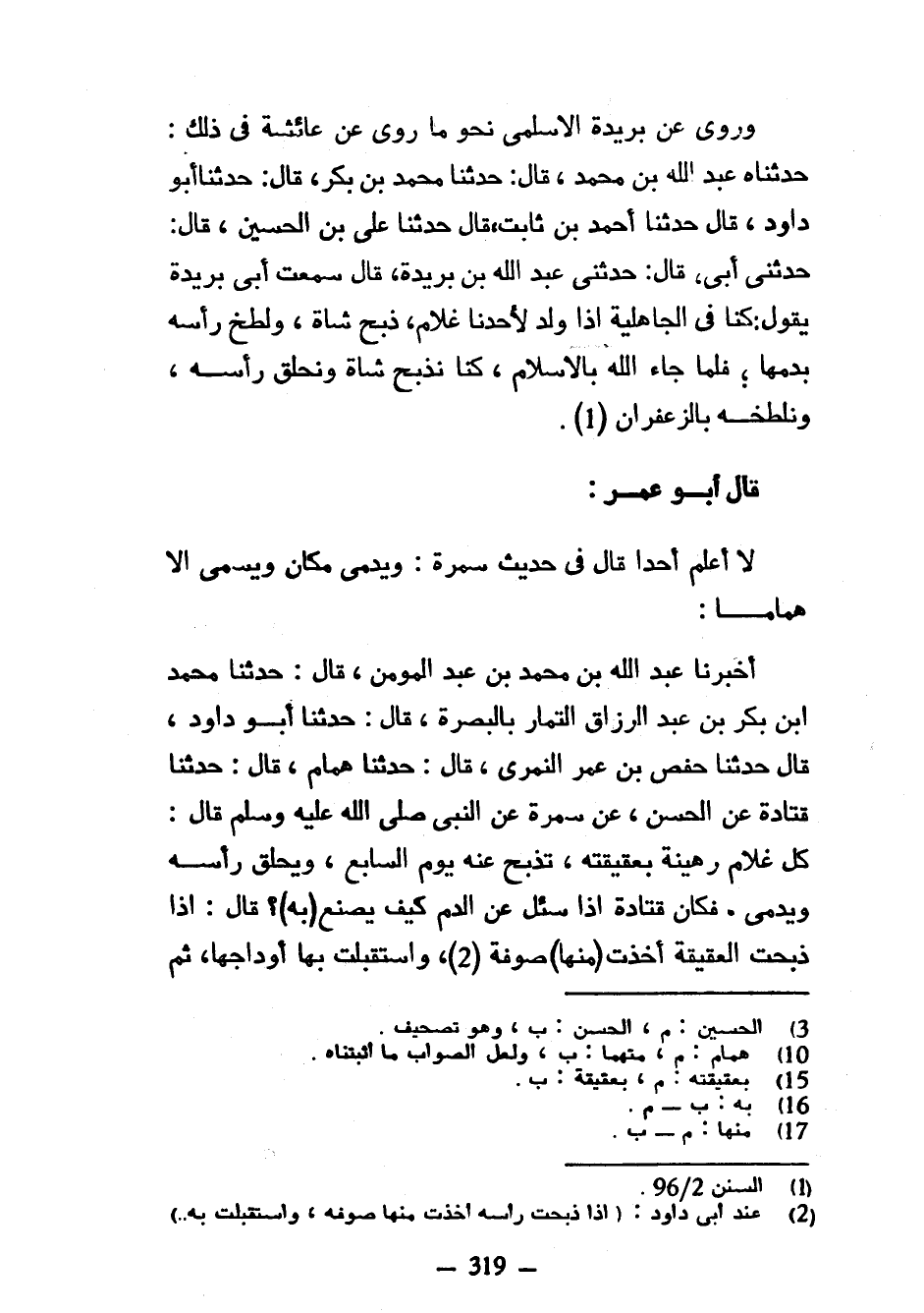 وَرُوِيَ عَنْ بُرَيْدَةَ الْأَسْلَمِيِّ نَحْوُ مَا رُوِيَ عَنْ عَائِشَةَ فِي ذَلِكَ حَدَّثَنَاهُ عَبْدُ اللَّهِ بْنُ مُحَمَّدٍ قَالَ حَدَّثَنَا مُحَمَّدُ بْنُ بَكْرٍ قَالَ حَدَّثَنَا أَبُو دَاوُدَ قَالَ حَدَّثَنَا أَحْمَدُ بْنُ ثَابِتٍ قَالَ حَدَّثَنَا عَلِيُّ بْنُ الْحُسَيْنِ قَالَ حَدَّثَنِي أَبِي قَالَ حَدَّثَنِي عَبْدُ اللَّهِ بْنُ بُرَيْدَةَ قَالَ سَمِعْتُ أَبِي بُرَيْدَةَ يَقُولُ كُنَّا فِي الْجَاهِلِيَّةِ إِذَا وُلِدَ لِأَحَدِنَا غُلَامٌ ذَبَحَ شَاةً وَلَطَّخَ رَأْسَهُ بِدَمِهَا فَلَمَّا جَاءَ اللَّهُ بِالْإِسْلَامِ كُنَّا نَذْبَحُ شَاةً وَنَحْلِقُ رَأْسَهُ وَنُلَطِّخُهُ بِالزَّعْفَرَانِ قَالَ أَبُو عُمَرَ لَا أَعْلَمُ أَحَدًا قَالَ فِي حَدِيثِ سَمُرَةَ وَيُدْمَى مَكَانَ وَيُسَمَّى إِلَّا هَمَّامًا أَخْبَرَنَا عَبْدُ اللَّهِ بْنُ مُحَمَّدِ بْنِ عَبْدِ الْمُؤْمِنِ قَالَ حَدَّثَنَا مُحَمَّدُ ابن بَكْرِ بْنِ عَبْدِ الرَّزَّاقِ التَّمَّارُ بِالْبَصْرَةِ قَالَ حَدَّثَنَا أَبُو دَاوُدَ قَالَ حَدَّثَنَا حَفْصُ بْنُ عُمَرَ النَّمَرِيُّ قَالَ حَدَّثَنَا هَمَّامٌ قَالَ حَدَّثَنَا قَتَادَةُ عَنْ الْحَسَنِ عَنْ سَمُرَةَ عَنِ النَّبِيِّ صَلَّى اللَّهُ عَلَيْهِ وَسَلَّمَ قَالَ كُلُّ غُلَامٍ رَهِينَةٌ بِعَقِيقَتِهِ تُذْبَحُ عَنْهُ يَوْمَ السَّابِعِ وَيُحْلَقُ رَأْسُهُ وَيُدْمَى فَكَانَ قَتَادَةُ إِذَا سُئِلَ عَنِ الدَّمِ كَيْفَ يَصْنَعُ (بِهِ) قَالَ إِذَا ذُبِحَتِ الْعَقِيقَةُ أُخِذَتْ (مِنْهَا) صُوفَةٌ وَاسْتُقْبِلَتْ بِهَا أَوْدَاجُهَا ثم