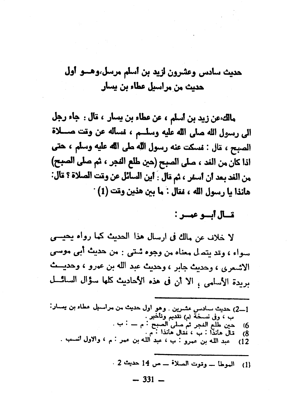 حَدِيثٌ سَادِسٌ وَعِشْرُونَ لِزَيْدِ بْنِ أَسْلَمَ مُرْسَلٌ وَهُوَ أَوَّلٌ حَدِيثٌ مِنْ مَرَاسِيلِ عَطَاءِ بْنِ يسار مَالِكٌ عَنْ زَيْدِ ابْنِ أَسْلَمَ عَنْ عَطَاءِ بْنِ يَسَارٍ قَالَ جَاءَ رَجُلٌ إِلَى رَسُولِ اللَّهِ صَلَّى اللَّهُ عَلَيْهِ وَسَلَّمَ فَسَأَلَهُ عَنْ وَقْتِ صَلَاةِ الصُّبْحِ قَالَ فَسَكَتَ عَنْهُ رَسُولُ اللَّهِ صَلَّى اللَّهُ عَلَيْهِ وَسَلَّمَ حَتَّى إِذَا كَانَ مِنَ الْغَدِ صَلَّى الصُّبْحَ (حِينَ طَلَعَ الْفَجْرُ ثُمَّ صَلَّى الصُّبْحَ) مِنَ الْغَدِ بَعْدَ أَنْ أَسْفَرَ ثُمَّ قَالَ أَيْنَ السَّائِلُ عَنْ وَقْتِ الصَّلَاةِ قَالَ هَأَنَذَا يَا رَسُولَ اللَّهِ فَقَالَ مَا بَيْنَ هَذَيْنِ وَقْتٌ قَالَ أَبُو عُمَرَ لَا خِلَافَ عَنْ مَالِكٍ فِي إِرْسَالِ هَذَا الْحَدِيثِ كَمَا رَوَاهُ يَحْيَى سَوَاءً وَقَدْ يَتَّصِلُ مَعْنَاهُ مِنْ وُجُوهٍ شَتَّى مِنْ حَدِيثِ أَبِي مُوسَى الْأَشْعَرِيِّ وَحَدِيثِ جَابِرٍ وَحَدِيثِ عَبْدِ اللَّهِ بْنِ عَمْرٍو وَحَدِيثِ بُرَيْدَةَ الْأَسْلَمِيِّ إِلَّا أَنَّ فِي هَذِهِ الْأَحَادِيثِ كُلِّهَا سُؤَالَ السَّائِلِ