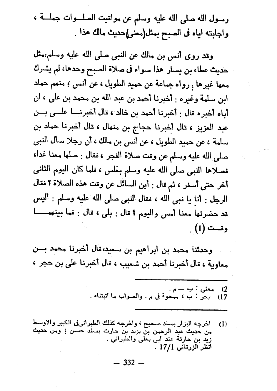 رسول الله صلى الله عليه وسلم عن مَوَاقِيتِ الصَّلَوَاتِ جُمْلَةً وَإِجَابَتَهُ إِيَّاهُ فِي الصُّبْحِ بِمِثْلِ (مَعْنَى) حَدِيثِ مَالِكٍ هَذَا وَقَدْ رَوَى أَنَسِ بْنِ مَالِكٍ عَنِ النَّبِيِّ صَلَّى اللَّهُ عَلَيْهِ وَسَلَّمَ مِثْلَ حَدِيثِ عَطَاءِ بْنِ يَسَارٍ هَذَا سَوَاءً فِي صَلَاةِ الصُّبْحِ وَحْدَهَا لَمْ يُشْرَكْ مَعَهَا غَيْرُهَا رَوَاهُ جَمَاعَةٌ عَنْ حُمَيْدٍ الطويل عن أنس منهم حماد ابن سَلَمَةَ وَغَيْرُهُ أَخْبَرَنَا أَحْمَدُ بْنُ عَبْدِ اللَّهِ بْنِ مُحَمَّدِ بْنِ عَلِيٍّ أَنَّ أَبَاهُ أَخْبَرَهُ قَالَ أَخْبَرَنَا أَحْمَدُ بْنُ خَالِدٍ قَالَ أَخْبَرَنَا عَلِيُّ بْنُ عَبْدِ الْعَزِيزِ قَالَ أَخْبَرَنَا حَجَّاجُ بْنُ مِنْهَالٍ قَالَ أَخْبَرَنَا حَمَّادُ بْنُ سَلَمَةَ عَنْ حُمَيْدٍ الطَّوِيلِ عَنْ أَنَسِ بْنِ مَالِكٍ أَنَّ رَجُلًا سَأَلَ النَّبِيَّ صَلَّى اللَّهُ عَلَيْهِ وَسَلَّمَ عَنْ وَقْتِ صَلَاةِ الْفَجْرِ فَقَالَ صَلِّهَا مَعَنَا غَدًا فَصَلَّاهَا النَّبِيُّ صَلَّى اللَّهُ عَلَيْهِ وَسَلَّمَ بِغَلَسٍ فَلَمَّا كَانَ الْيَوْمُ الثَّانِي أَخَّرَ حَتَّى أَسْفَرَ ثُمَّ قَالَ أَيْنَ السَّائِلُ عَنْ وَقْتِ هَذِهِ الصَّلَاةِ فَقَالَ الرَّجُلُ أَنَا يَا نَبِيَّ اللَّهِ فَقَالَ النَّبِيُّ صَلَّى اللَّهُ عَلَيْهِ وَسَلَّمَ أَلَيْسَ قَدْ حَضَرْتَهَا مَعَنَا أَمْسَ وَالْيَوْمَ قَالَ بَلَى قَالَ فَمَا بَيْنَهُمَا وَقْتٌ وَحَدَّثَنَا مُحَمَّدُ بْنُ إِبْرَاهِيمَ بْنِ سَعِيدٍ قَالَ أَخْبَرَنَا مُحَمَّدُ بْنُ مُعَاوِيَةَ قَالَ أَخْبَرَنَا أَحْمَدُ بْنُ شُعَيْبٍ قَالَ أَخْبَرَنَا عَلِيُّ بْنُ حَجَرٍ