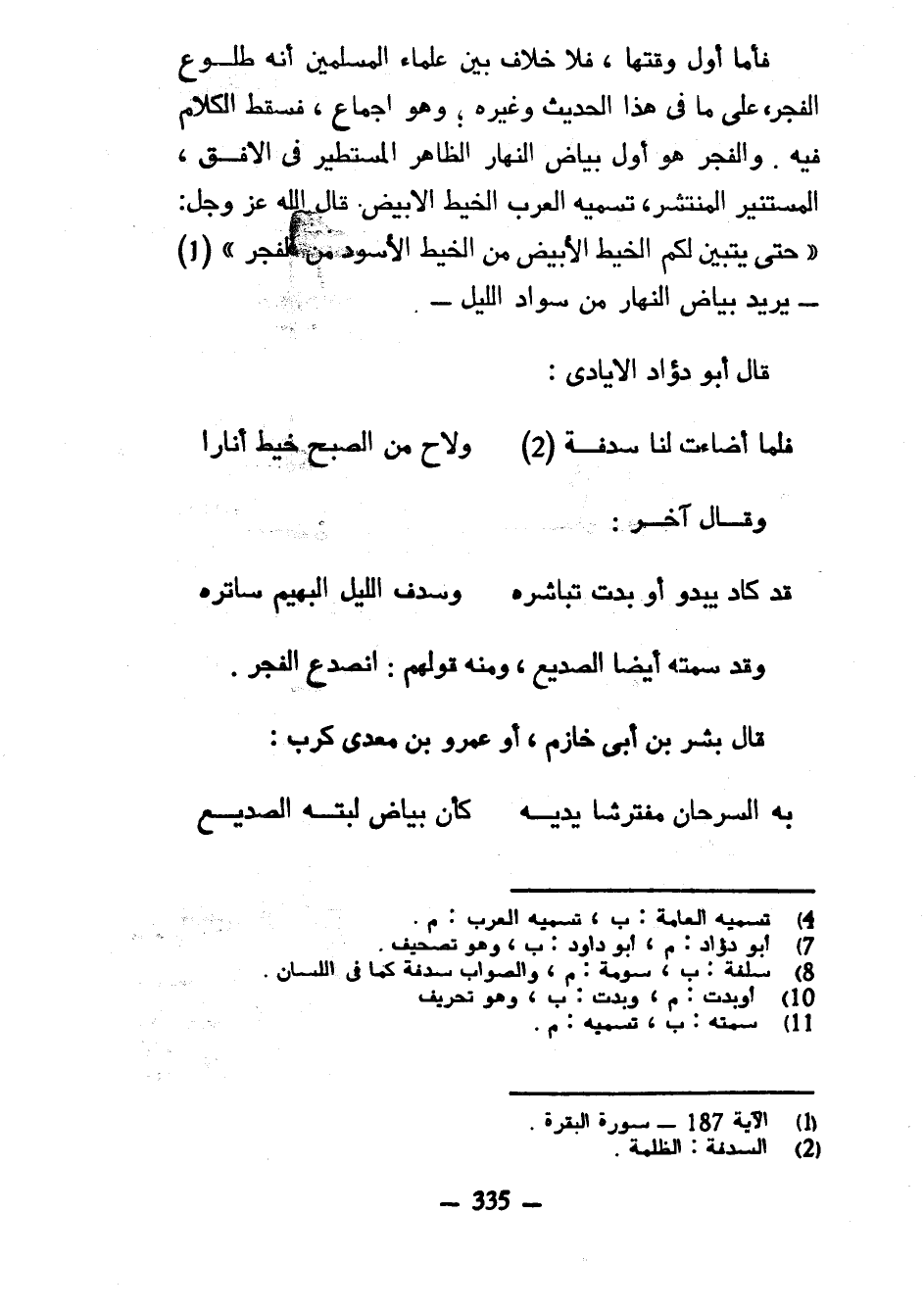 فَأَمَّا أَوَّلُ وَقْتِهَا فَلَا خِلَافَ بَيْنِ عُلَمَاءِ الْمُسْلِمِينَ أَنَّهُ طُلُوعُ الْفَجْرِ عَلَى مَا فِي هَذَا الْحَدِيثِ وَغَيْرِهِ وَهُوَ إِجْمَاعٌ فَسَقَطَ الْكَلَامُ فِيهِ وَالْفَجْرُ هُوَ أَوَّلُ بَيَاضِ النَّهَارِ الظَّاهِرِ الْمُسْتَطِيرِ فِي الْأُفُقِ الْمُسْتَنِيرِ الْمُنْتَشِرِ تُسَمِّيهِ الْعَرَبُ الْخَيْطَ الْأَبْيَضَ قَالَ اللَّهُ عَزَّ وَجَلَّ حَتَّى يَتَبَيَّنَ لَكُمُ الْخَيْطُ الْأَبْيَضُ مِنَ الْخَيْطِ الْأَسْوَدِ مِنَ الْفَجْرِ يُرِيدُ بَيَاضَ النَّهَارِ مِنْ سَوَادِ اللَّيْلِ قَالَ أَبُو دَؤُادَ الْإِيَادِيُّ ... فَلَمَّا أَضَاءَتْ لنا سدقه ... وَلَاحَ مِنَ الصُّبْحِ خَيْطٌ أَنَارَا ... وَقَالَ آخَرُ ... قَدْ كَادَ يَبْدُو أَوْ بَدَتْ تُبَاشِرُهُ ... وَسُدَفُ اللَّيْلِ الْبَهِيمِ سَاتِرُهُ ... وَقَدْ سَمَّتْهُ أَيْضًا الصَّدِيعَ وَمِنْهُ قَوْلُهُمْ انْصَدَعَ الْفَجْرُ قَالَ بِشْرُ بْنُ أَبِي خَازِمٍ أَوْ عَمْرُو بْنُ مَعْدِي كَرِبَ ... بِهِ السَّرْحَانُ مُفْتَرِشًا يَدَيْهِ ... كَأَنَّ بَيَاضَ لِبَّتِهِ الصديع
