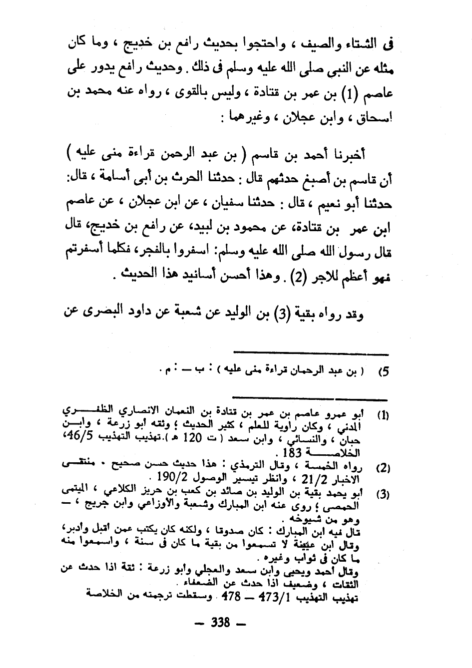 فِي الشِّتَاءِ وَالصَّيْفِ وَاحْتَجُّوا بِحَدِيثِ رَافِعِ بْنِ خَدِيجٍ وَمَا كَانَ مِثْلَهُ عَنِ النَّبِيِّ صَلَّى اللَّهُ عَلَيْهِ وَسَلَّمَ فِي ذَلِكَ وَحَدِيثُ رَافِعٍ يَدُورُ عَلَى عَاصِمِ بْنِ عُمَرَ بْنِ قَتَادَةَ وَلَيْسَ بِالْقَوِيِّ رَوَاهُ عَنْهُ مُحَمَّدُ بْنُ إِسْحَاقَ وَابْنُ عَجْلَانَ وَغَيْرُهُمَا أَخْبَرَنَا أَحْمَدُ بْنُ قَاسِمِ (بْنِ عَبْدِ الرَّحْمَنِ قِرَاءَةً مِنِّي عَلَيْهِ) أَنَّ قَاسِمَ بْنَ أَصْبَغَ حَدَّثَهُمْ قَالَ حَدَّثَنَا الْحَرْثُ بْنُ أَبِي أُسَامَةَ قَالَ حَدَّثَنَا أَبُو نُعَيْمٍ قَالَ حَدَّثَنَا سُفْيَانُ عَنِ ابْنِ عَجْلَانَ عَنْ عَاصِمِ ابن عُمَرَ بْنِ قَتَادَةَ عَنْ مَحْمُودِ بْنِ لَبِيدٍ عن رافع بن خديح قَالَ قَالَ رَسُولُ اللَّهِ صَلَّى اللَّهُ عَلَيْهِ وَسَلَّمَ أَسْفِرُوا بِالْفَجْرِ فَكُلَّمَا أَسْفَرْتُمْ فَهُوَ أَعْظَمُ لأجر وَهَذَا أَحْسَنُ أَسَانِيدِ هَذَا الْحَدِيثِ وَقَدْ رَوَاهُ بَقِيَّةُ بْنُ الْوَلِيدِ عَنْ شُعْبَةَ عَنْ دَاوُدَ البصري عن
