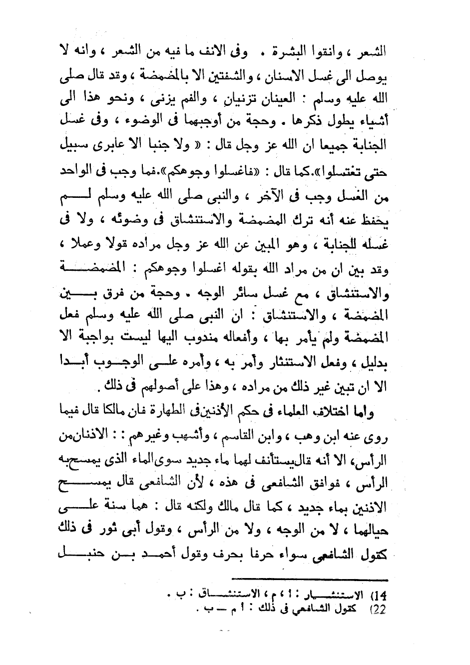 الشَّعْرَ وَأَنْقُوا الْبَشْرَةَ وَفِي الْأَنْفِ مَا فِيهِ مِنَ الشَّعْرِ وَأَنَّهُ لَا يُوصَلُ إِلَى غَسْلِ الْأَسْنَانِ وَالشَّفَتَيْنِ إِلَّا بِالْمَضْمَضَةِ وَقَدْ قَالَ صَلَّى اللَّهُ عَلَيْهِ وَسَلَّمَ الْعَيْنَانِ تَزْنِيَانِ وَالْفَمُ يَزْنِي وَنَحْوُ هَذَا إِلَى أَشْيَاءَ يَطُولُ ذِكْرُهَا وَحُجَّةُ مَنْ أَوْجَبَهُمَا فِي الْوُضُوءِ وَفِي غُسْلِ الْجَنَابَةِ جَمِيعًا إِنَّ اللَّهَ عَزَّ وَجَلَّ قَالَ وَلَا جُنُبًا إِلَّا عَابِرِي سَبِيلٍ حَتَّى تَغْتَسِلُوا كَمَا قَالَ فَاغْسِلُوا وُجُوهَكُمْ فَمَا وَجَبَ فِي الْوَاحِدِ مِنَ الْغُسْلِ وَجَبَ فِي الْآخَرِ وَالنَّبِيُّ صَلَّى اللَّهُ عَلَيْهِ وَسَلَّمَ لَمْ يُحْفَظْ عَنْهُ أَنَّهُ تَرَكَ الْمَضْمَضَةَ وَالِاسْتِنْشَاقَ فِي وُضُوئِهِ وَلَا فِي غُسْلِهِ لِلْجَنَابَةِ وَهُوَ الْمُبَيِّنُ عَنِ اللَّهِ عَزَّ وَجَلَّ مُرَادَهُ قَوْلًا وَعَمَلًا وَقَدْ بَيَّنَ أَنَّ مِنْ مُرَادِ اللَّهِ بِقَوْلِهِ اغْسِلُوا وُجُوهَكُمْ الْمَضْمَضَةُ وَالِاسْتِنْشَاقُ مَعَ غَسْلِ سَائِرِ الْوَجْهِ وَحُجَّةُ مَنْ فَرَّقَ بَيْنَ الْمَضْمَضَةِ وَالِاسْتِنْشَاقِ أَنَّ النَّبِيَّ صَلَّى اللَّهُ عَلَيْهِ وَسَلَّمَ فَعَلَ الْمَضْمَضَةَ وَلَمْ يَأْمُرْ بِهَا وَأَفْعَالُهُ مَنْدُوبٌ إِلَيْهَا لَيْسَتْ بِوَاجِبَةٍ إِلَّا بِدَلِيلٍ وَفَعَلَ الِاسْتِنْثَارَ وَأَمَرَ بِهِ وَأَمْرُهُ عَلَى الْوُجُوبِ أَبَدًا إِلَّا أَنْ تَبَيَّنَ غَيْرُ ذَلِكَ مِنْ مُرَادِهِ وَهَذَا عَلَى أُصُولِهِمْ فِي ذَلِكَ وَأَمَّا اخْتِلَافُ الْعُلَمَاءِ فِي حُكْمِ الْأُذُنَيْنِ فِي الطَّهَارَةِ فَإِنَّ مَالِكًا قَالَ فِيمَا رَوَى عَنْهُ ابْنُ وَهْبٍ وَابْنُ الْقَاسِمِ وَأَشْهَبُ وَغَيْرُهُمْ الْأُذُنَانِ مِنَ الرَّأْسِ إِلَّا أَنَّهُ قَالَ يَسْتَأْنِفُ لَهُمَا مَاءٌ جَدِيدٌ سِوَى الْمَاءِ الَّذِي يَمْسَحُ بِهِ الرَّأْسَ فَوَافَقَ الشَّافِعِيُّ فِي هَذِهِ لِأَنَّ الشَّافِعِيَّ قَالَ يَمْسَحُ الْأُذُنَيْنِ بِمَاءٍ جَدِيدٍ كَمَا قَالَ مَالِكٌ وَلَكِنَّهُ قَالَ هُمَا سُنَّةٌ عَلَى حِيَالِهِمَا لَا مِنَ الْوَجْهِ وَلَا مِنَ الرَّأْسِ وَقَوْلُ أَبِي ثَوْرٍ فِي ذَلِكَ كَقَوْلِ الشَّافِعِيِّ سَوَاءٌ حَرْفًا بِحَرْفٍ وَقَوْلُ أَحْمَدَ بْنِ حَنْبَلٍ