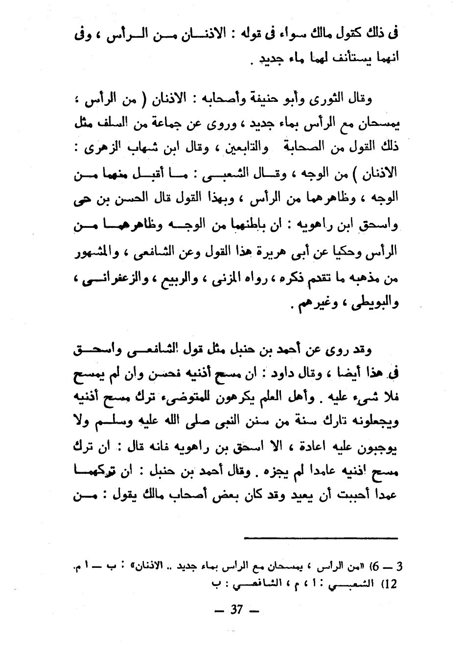 فِي ذَلِكَ كَقَوْلِ مَالِكٍ سَوَاءٌ فِي قَوْلِهِ الْأُذُنَانِ مِنَ الرَّأْسِ وَفِي أَنَّهُمَا يَسْتَأْنِفُ لَهُمَا مَاءٌ جَدِيدٌ وَقَالَ الثَّوْرِيُّ وَأَبُو حَنِيفَةَ وَأَصْحَابُهُ الْأُذُنَانِ (مِنَ الرَّأْسِ يُمْسَحَانِ مَعَ الرَّأْسِ بِمَاءٍ جَدِيدٍ وَرُوِيَ عَنْ جَمَاعَةٍ مِنَ السَّلَفِ مِثْلَ ذَلِكَ الْقَوْلِ مِنَ الصَّحَابَةِ وَالتَّابِعِينَ وَقَالَ ابْنُ شهاب الزهري الْأُذُنَانِ) مِنَ الْوَجْهِ وَقَالَ الشَّعْبِيُّ مَا أَقْبَلَ مِنْهُمَا مِنَ الْوَجْهِ وَظَاهِرَهُمَا مِنَ الرَّأْسِ وَبِهَذَا القول قال الحسن بن حي وإسحاق ابن رَاهَوَيْهِ إِنَّ بَاطِنَهُمَا مِنَ الْوَجْهِ وَظَاهِرَهُمَا مِنَ الرَّأْسِ وَحَكَيَا عَنْ أَبِي هُرَيْرَةَ هَذَا الْقَوْلَ وَعَنِ الشَّافِعِيِّ وَالْمَشْهُورُ مِنْ مَذْهَبِهِ مَا تَقَدَّمَ ذِكْرُهُ رَوَاهُ الْمُزَنِيُّ وَالرَّبِيعُ وَالزَّعْفَرَانِيُّ وَالْبُوَيْطِيُّ وَغَيْرُهُمْ وَقَدْ رُوِيَ عَنْ أَحْمَدِ بْنِ حَنْبَلٍ مِثْلَ قَوْلِ الشَّافِعِيِّ وَإِسْحَاقَ فِي هَذَا أَيْضًا وَقَالَ دَاوُدُ إِنْ مَسَحَ أُذُنَيْهِ فَحَسَنٌ وَإِنْ لَمْ يَمْسَحْ فَلَا شَيْءَ عَلَيْهِ وَأَهْلُ الْعِلْمِ يَكْرَهُونَ للمتوضيء ترك مسح أذنيه ويجعلونه تارك سُنَّةً مِنْ سُنَنِ النَّبِيِّ صَلَّى اللَّهُ عَلَيْهِ وسلم ولا يوجبون عليه إعادة الا اسحق بْنَ رَاهَوَيْهِ فَإِنَّهُ قَالَ إِنْ تَرَكَ مَسْحَ أُذُنَيْهِ عَامِدًا لَمْ يَجُزْهُ وَقَالَ أَحْمَدُ بْنُ حَنْبَلٍ إِنْ تَرَكَهُمَا عَمْدًا أَحْبَبْتُ أَنْ يُعِيدَ وقد كان بعض أصحاب مالك يقول من