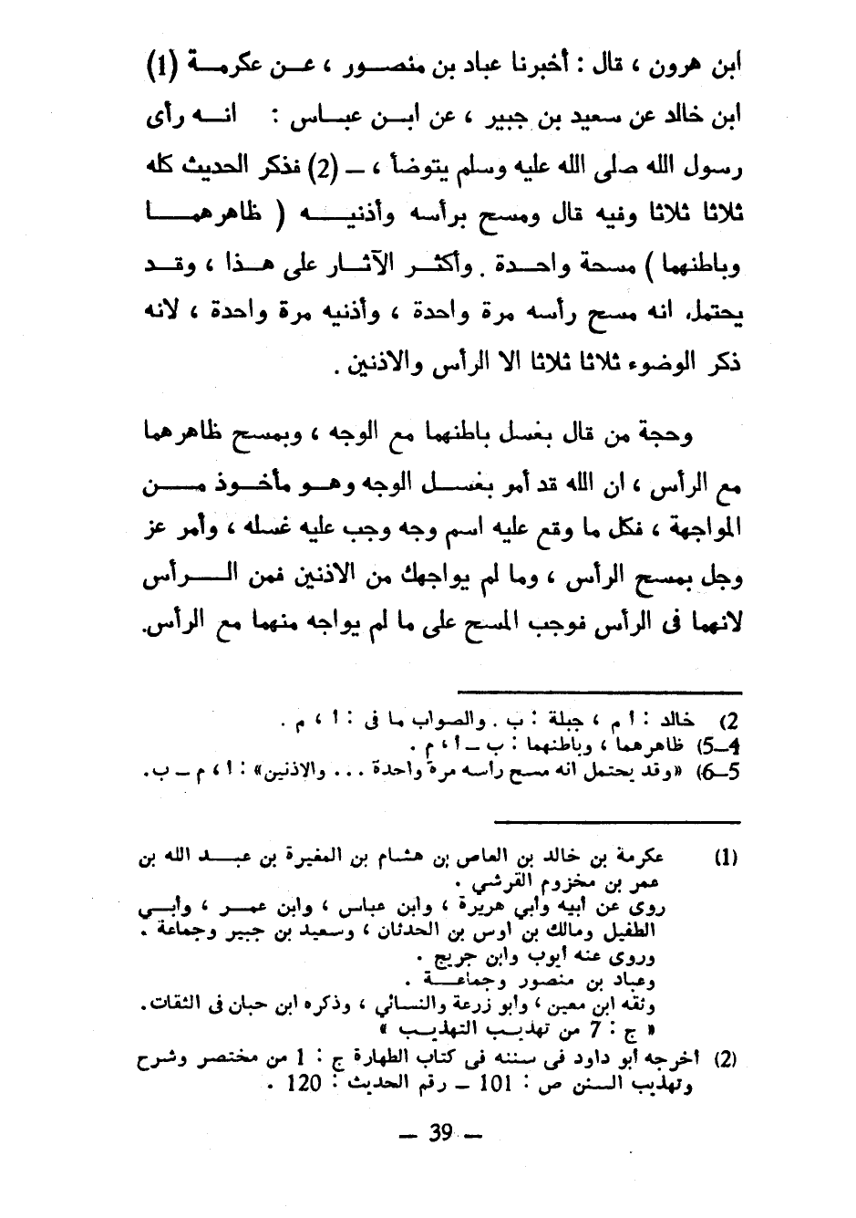 ابن هرون قَالَ أَخْبَرْنَا عَبَّادُ بْنُ مَنْصُورٍ عَنْ عِكْرِمَةَ ابن خَالِدٍ عَنْ سَعِيدِ بْنِ جُبَيْرٍ عَنِ ابْنِ عَبَّاسٍ أَنَّهُ رَأَى رَسُولَ اللَّهِ صَلَّى اللَّهُ عَلَيْهِ وَسَلَّمَ يَتَوَضَّأُ فَذَكَرَ الْحَدِيثَ كُلَّهُ ثَلَاثًا ثَلَاثًا وَفِيهِ قَالَ وَمَسَحَ بِرَأْسِهِ وَأُذُنَيْهِ (ظَاهِرِهِمَا وَبَاطِنِهِمَا) مَسْحَةً وَاحِدَةً وَأَكْثَرُ الْآثَارِ عَلَى هَذَا وَقَدْ يُحْتَمَلُ أَنَّهُ مَسَحَ رَأْسَهُ مَرَّةً وَاحِدَةً وَأُذُنَيْهِ مَرَّةً وَاحِدَةً لِأَنَّهُ ذَكَرَ الْوُضُوءَ ثَلَاثًا ثَلَاثًا إِلَّا الرَّأْسَ وَالْأُذُنَيْنِ وَحُجَّةُ مَنْ قَالَ بِغَسْلِ بَاطِنِهِمَا مَعَ الْوَجْهِ وَبِمَسْحِ ظَاهِرِهِمَا مَعَ الرَّأْسِ إِنَّ اللَّهَ قَدْ أَمَرَ بِغَسْلِ الْوَجْهِ وَهُوَ مَأْخُوذٌ مِنَ الْمُوَاجَهَةِ فَكُلُّ مَا وَقَعَ عَلَيْهِ اسْمُ وَجْهٍ وَجَبَ عَلَيْهِ غَسْلُهُ وَأَمَرَ عَزَّ وَجَلَّ بِمَسْحِ الرَّأْسِ وَمَا لَمْ يُوَاجِهْكَ مِنَ الْأُذُنَيْنِ فَمِنَ الرَّأْسِ لِأَنَّهُمَا فِي الرَّأْسِ فَوَجَبَ الْمَسْحُ عَلَى مَا لَمْ يُوَاجِهْ مِنْهُمَا مع الرأس