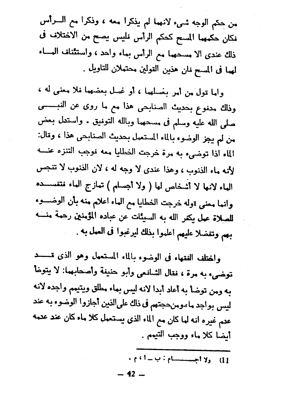 مِنْ حُكْمِ الْوَجْهِ شَيءٌ لِأَنَّهُمَا لَمْ يُذْكَرَا مَعَهُ وَذُكِرَا مَعَ الرَّأْسِ فَكَانَ حُكْمُهُمَا الْمَسْحُ كَحُكْمِ الرَّأْسِ فَلَيْسَ يَصِحُّ مِنْ الِاخْتِلَافِ فِي ذَلِكَ عِنْدِي إِلَّا مَسْحُهُمَا مَعَ الرَّأْسِ بِمَاءٍ وَاحِدٍ وَاسْتِئْنَافُ الْمَاءِ لَهُمَا فِي الْمَسْحِ فَإِنَّ هَذَيْنِ الْقَوْلَيْنِ مُحْتَمَلَانِ لِلتَّأْوِيلِ وَأَمَّا قَوْلُ مَنْ أَمَرَ بِغَسْلِهِمَا أَوْ غَسْلِ بَعْضِهِمَا فَلَا مَعْنَى لَهُ وَذَلِكَ مَدْفُوعٌ بِحَدِيثِ الصُّنَابِحِيِّ هَذَا مَعَ مَا رُوِيَ عَنِ النَّبِيِّ صَلَّى اللَّهُ عَلَيْهِ وَسَلَّمَ فِي مَسْحِهِمَا وَبِاللَّهِ التَّوْفِيقُ وَاسْتَدَلَّ بَعْضُ مَنْ لَمْ يُجِزْ الْوُضُوءَ بِالْمَاءِ الْمُسْتَعْمَلِ بِحَدِيثِ الصنابحي هذا وقال الماء إذا توضيء بِهِ مَرَّةً خَرَجَتِ الْخَطَايَا مَعَهُ فَوَجَبَ التَّنَزُّهُ عَنْهُ لِأَنَّهُ مَاءُ الذُّنُوبِ وَهَذَا عِنْدِي لَا وَجْهَ لَهُ لِأَنَّ الذُّنُوبَ لَا تُنَجِّسُ الْمَاءَ لِأَنَّهَا لَا أَشْخَاصَ لَهَا (وَلَا أَجْسَامَ) تُمَازِجُ الْمَاءَ فَتُفْسِدُهُ وَإِنَّمَا مَعْنَى قَوْلِهِ خَرَجَتِ الْخَطَايَا مَعَ الْمَاءِ إِعْلَامٌ مِنْهُ بِأَنَّ الْوُضُوءَ لِلصَّلَاةِ عَمَلٌ يُكَفِّرُ اللَّهُ بِهِ السَّيِّئَاتِ عَنْ عِبَادِهِ المؤمنين رحمة منه بهم وتفضلا عليهم اعلموا بذلك لِيَرْغَبُوا فِي الْعَمَلِ بِهِ وَاخْتَلَفَ الْفُقَهَاءُ فِي الوضوء بالماء المستعمل وهو الذي قد توضيء بِهِ مَرَّةً فَقَالَ الشَّافِعِيُّ وَأَبُو حَنِيفَةَ وَأَصْحَابُهُمَا لَا يُتَوَضَّأُ بِهِ وَمَنْ تَوَضَّأَ بِهِ أَعَادَ أَبَدًا لِأَنَّهُ لَيْسَ بِمَاءٍ مُطْلَقٍ وَيَتَيَمَّمُ وَاجِدُهُ لِأَنَّهُ لَيْسَ بِوَاجِدٍ مَاءً وَمِنْ حُجَّتِهِمْ فِي ذَلِكَ عَلَى الَّذِينَ أَجَازُوا الْوُضُوءَ بِهِ عِنْدَ عدم غَيْرِهِ أَنَّهُ لَمَّا كَانَ مَعَ الْمَاءِ الَّذِي يُسْتَعْمَلُ كُلًّا مَاءٌ كَانَ عِنْدَ عَدَمِهِ أَيْضًا كُلًّا مَاءٌ وَوَجَبَ التَّيَمُّمُ