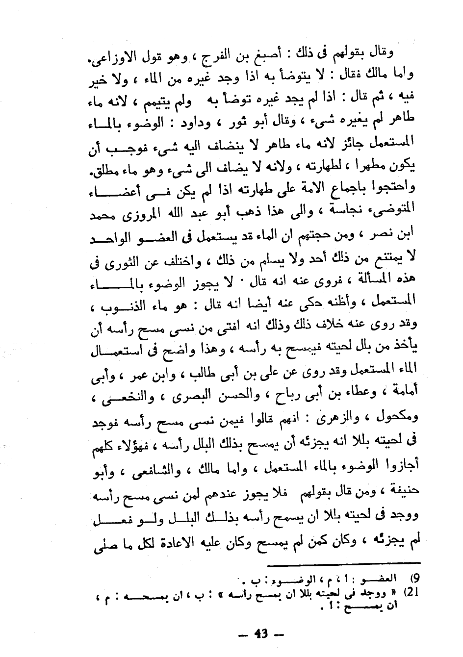 وَقَالَ بِقَوْلِهِمْ فِي ذَلِكَ أَصْبَغُ بْنُ الْفَرَجِ وَهُوَ قَوْلُ الْأَوْزَاعِيِّ وَأَمَّا مَالِكٌ فَقَالَ لَا يَتَوَضَّأُ بِهِ إِذَا وَجَدَ غَيْرَهُ مِنَ الْمَاءِ وَلَا خَيْرَ فِيهِ ثُمَّ قَالَ إِذَا لَمْ يَجِدْ غَيْرَهُ تَوَضَّأَ بِهِ وَلَمْ يَتَيَمَّمْ لِأَنَّهُ مَاءٌ طَاهِرٌ لَمْ يُغَيِّرْهُ شَيْءٌ وَقَالَ أَبُو ثَوْرٍ وَدَاوُدُ الْوُضُوءُ بِالْمَاءِ الْمُسْتَعْمَلِ جَائِزٌ لِأَنَّهُ مَاءٌ طَاهِرٌ لَا يَنْضَافُ إِلَيْهِ شَيْءٌ فَوَجَبَ أَنْ يَكُونَ مُطَهِّرًا لِطَهَارَتِهِ وَلِأَنَّهُ لَا يُضَافُ إِلَى شَيْءٍ وَهُوَ مَاءٌ مُطْلَقٌ وَاحْتَجُّوا بِإِجْمَاعِ الْأُمَّةِ عَلَى طَهَارَتِهِ إِذَا لَمْ يَكُنْ فِي أعضاء المتوضيء نَجَاسَةٌ وَإِلَى هَذَا ذَهَبَ أَبُو عَبْدِ اللَّهِ المروزي محمد ابن نَصْرٍ وَمِنْ حُجَّتِهِمْ أَنَّ الْمَاءَ قَدْ يُسْتَعْمَلُ فِي الْعُضْوِ الْوَاحِدِ لَا يَمْتَنِعُ مِنْ ذَلِكَ أحد ولا يسام مِنْ ذَلِكَ وَاخْتَلَفَ عَنِ الثَّوْرِيِّ فِي هَذِهِ الْمَسْأَلَةِ فَرُوِيَ عَنْهُ أَنَّهُ قَالَ لَا يَجُوزُ الْوُضُوءُ بِالْمَاءِ الْمُسْتَعْمَلِ وَأَظُنُّهُ حَكَى عَنْهُ أَيْضًا أَنَّهُ قَالَ هُوَ مَاءُ الذُّنُوبِ وَقَدْ رُوِيَ عَنْهُ خِلَافُ ذَلِكَ وَذَلِكَ أَنَّهُ أَفْتَى مَنْ نَسَى مَسْحَ رَأْسِهِ أَنْ يَأْخُذَ مِنْ بَلَلِ لِحْيَتِهِ فَيَمْسَحُ بِهِ رَأْسَهُ وَهَذَا وَاضِحٌ فِي اسْتِعْمَالِ الْمَاءِ الْمُسْتَعْمَلِ وَقَدْ رُوِيَ عَنْ عَلِيِّ بْنِ أَبِي طَالِبٍ وَابْنِ عُمَرَ وَأَبِي أُمَامَةَ وَعَطَاءِ بْنِ أَبِي رَبَاحٍ وَالْحَسَنِ الْبَصْرِيِّ وَالنَّخَعِيِّ وَمَكْحُولٍ وَالزُّهْرِيِّ أَنَّهُمْ قَالُوا فِيمَنْ نَسِيَ مَسْحَ رَأْسِهِ فَوَجَدَ فِي لِحْيَتِهِ بَلَلًا أَنَّهُ يُجْزِئُهُ أَنْ يَمْسَحَ بِذَلِكَ الْبَلَلِ رَأْسَهُ فَهَؤُلَاءِ كُلُّهُمْ أَجَازُوا الْوُضُوءَ بِالْمَاءِ الْمُسْتَعْمَلِ وَأَمَّا مَالِكٌ وَالشَّافِعِيُّ وَأَبُو حَنِيفَةَ وَمَنْ قَالَ بِقَوْلِهِمْ فَلَا يَجُوزُ عِنْدَهُمْ لِمَنْ نَسِيَ مَسْحَ رَأَسِهِ وَوَجَدَ فِي لِحْيَتِهِ بَلَلًا أَنْ يَمْسَحَ رَأْسَهُ بِذَلِكَ الْبَلَلِ وَلَوْ فَعَلَ لَمْ يُجَزِئْهُ وَكَانَ كَمَنْ لَمْ يَمْسَحْ وَكَانَ عَلَيْهِ الْإِعَادَةُ لِكُلِّ مَا صَلَّى