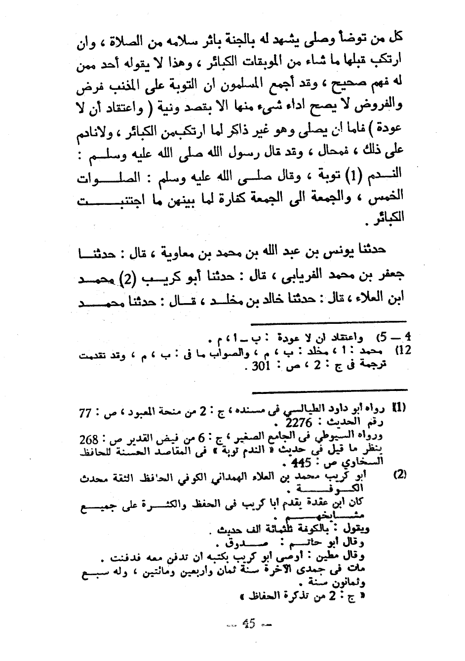 كُلُّ مَنْ تَوَضَّأَ وَصَلَّى يَشْهَدُ لَهُ بِالْجَنَّةِ بِأَثَرِ سَلَامِهِ مِنَ الصَّلَاةِ وَإِنِ ارْتَكَبَ قَبْلَهَا مَا شَاءَ مِنَ الْمُوبِقَاتِ الْكَبَائِرِ وَهَذَا لَا يَقُولُهُ أَحَدٌ مِمَّنْ لَهُ فَهْمٌ صَحِيحٌ وَقَدْ أَجْمَعَ الْمُسْلِمُونَ أَنَّ التَّوْبَةَ عَلَى الْمُذْنِبِ فَرْضٌ وَالْفُرُوضُ لَا يَصِحُّ أَدَاءُ شَيْءٍ مِنْهَا إِلَّا بِقَصْدٍ وَنِيَّةٍ (وَاعْتِقَادٍ أَنْ لَا عَوْدَةَ) فَأَمَّا أن يصلي وهو غير ذَاكِرٌ لِمَا ارْتَكَبَ مِنَ الْكَبَائِرِ وَلَا نَادِمَ عَلَى ذَلِكَ فَمُحَالٌ وَقَدْ قَالَ رَسُولُ اللَّهِ صَلَّى اللَّهُ عَلَيْهِ وَسَلَّمَ النَّدَمُ تَوْبَةٌ وَقَالَ صَلَّى اللَّهُ عَلَيْهِ وَسَلَّمَ الصَّلَوَاتُ الْخَمْسُ وَالْجُمُعَةُ إِلَى الْجُمُعَةِ كَفَّارَةٌ لِمَا بَيْنَهُنَّ مَا اجْتُنِبَتِ الْكَبَائِرُ حَدَّثَنَا يُونُسُ بْنُ عَبْدِ اللَّهِ بْنِ مُحَمَّدِ بْنِ مُعَاوِيَةَ قَالَ حَدَّثَنَا جَعْفَرُ بْنُ مُحَمَّدٍ الْفِرْيَابِيُّ قَالَ حَدَّثَنَا أَبُو كُرَيْبٍ مُحَمَّدُ ابن الْعَلَاءِ قَالَ حَدَّثَنَا خَالِدُ بْنُ مَخْلَدٍ قَالَ حَدَّثَنَا محمد
