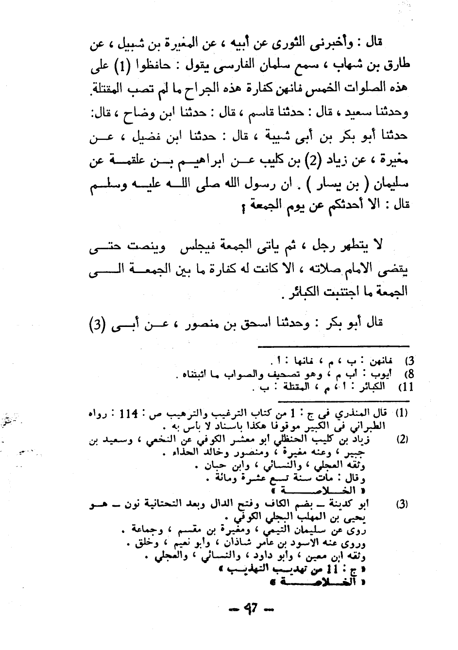 قَالَ وَأَخْبَرَنِي الثَّوْرِيُّ عَنْ أَبِيهِ عَنِ الْمُغِيرَةِ بْنِ شُبَيْلٍ عَنْ طَارِقِ بْنِ شِهَابٍ سَمِعَ سَلْمَانَ الْفَارِسِيَّ يَقُولُ حَافِظُوا عَلَى هَذِهِ الصَّلَوَاتِ الْخَمْسِ فَإِنَّهُنَّ كَفَّارَةُ هَذِهِ الْجِرَاحِ مَا لَمْ تُصَبِ الْمَقْتَلَةُ وَحَدَّثَنَا سَعِيدٌ قَالَ حَدَّثَنَا قَاسِمٌ قَالَ حَدَّثَنَا ابْنُ وَضَّاحٍ قَالَ حَدَّثَنَا أَبُو بَكْرِ بْنُ أَبِي شَيْبَةَ قَالَ حَدَّثَنَا ابْنُ فُضَيْلٍ عَنْ مُغِيرَةَ عَنْ زِيَادِ بْنِ كُلَيْبٍ عَنْ إِبْرَاهِيمَ بْنِ عَلْقَمَةَ عَنْ سُلَيْمَانَ (بْنِ يَسَارٍ) أَنَّ رَسُولَ اللَّهِ صَلَّى اللَّهُ عَلَيْهِ وَسَلَّمَ قَالَ أَلَا أُحَدِّثُكُمْ عَنْ يَوْمِ الْجُمُعَةِ لَا يَتَطَهَّرُ رَجُلٌ ثُمَّ يَأْتِي الْجُمُعَةَ فَيَجْلِسُ وَيُنْصِتُ حَتَّى يَقْضِيَ الْإِمَامُ صَلَاتَهُ إِلَّا كَانَتْ لَهُ كَفَّارَةُ مَا بَيْنَ الْجُمُعَةِ إِلَى الْجُمُعَةِ مَا اجْتُنِبَتِ الْكَبَائِرُ قَالَ أَبُو بَكْرٍ وَحَدَّثَنَا إِسْحَاقُ بْنُ مَنْصُورٍ عَنْ أَبِي