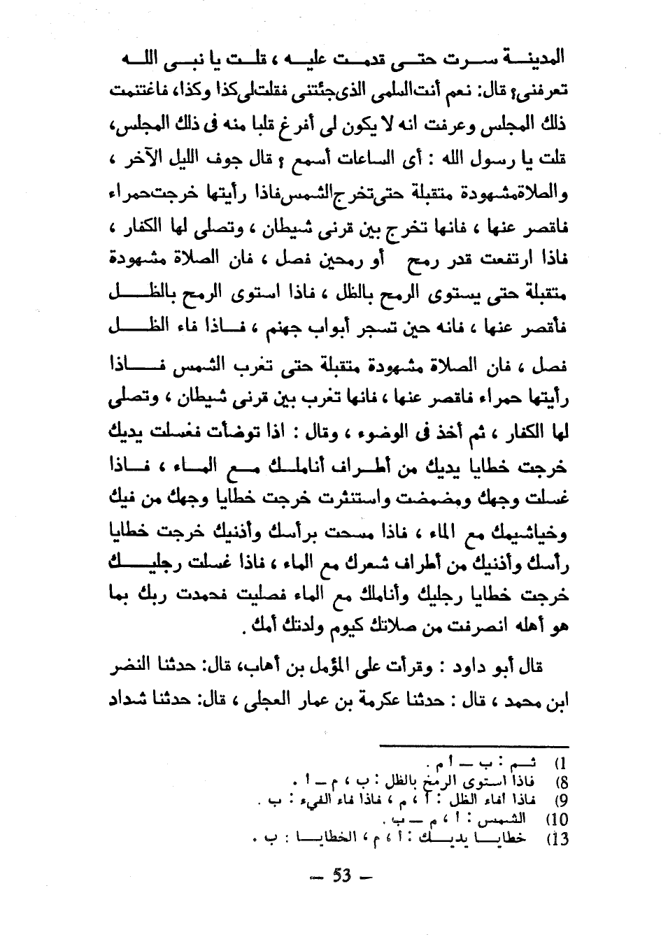 الْمَدِينَةِ سِرْتُ حَتَّى قَدِمْتُ عَلَيْهِ قُلْتُ يَا نَبِيَّ اللَّهِ تَعْرِفُنِي قَالَ نَعَمْ أَنْتَ السُّلَمِيُّ الَّذِي جِئْتَنِي فَقُلْتَ لِي كَذَا وَكَذَا فَاغْتَنَمْتُ ذَلِكَ الْمَجْلِسَ وَعَرَفْتُ أَنَّهُ لَا يَكُونُ لِي أَفْرَغُ قَلْبًا مِنْهُ فِي ذَلِكَ الْمَجْلِسِ قُلْتُ يَا رَسُولَ اللَّهِ أَيُّ السَّاعَاتِ أَسْمَعُ قَالَ جَوْفُ اللَّيْلِ الْآخِرِ وَالصَّلَاةُ مَشْهُودَةٌ مُتَقَبَّلَةٌ حَتَّى تَخْرُجَ الشَّمْسُ فَإِذَا رَأَيْتَهَا خَرَجَتْ حَمْرَاءَ فَاقْصُرْ عَنْهَا فَإِنَّهَا تَخْرُجُ بَيْنَ قَرْنَيْ شَيْطَانٍ وَتُصَلِّي لَهَا الْكُفَّارُ فَإِذَا ارْتَفَعَتْ قَدْرَ رُمْحٍ أَوْ رُمْحَيْنِ فَصَلِّ فَإِنَّ الصَّلَاةَ مَشْهُودَةٌ مُتَقَبَّلَةٌ حَتَّى يَسْتَوِيَ الرُّمْحُ بِالظِّلِّ فَإِذَا اسْتَوَى الرُّمْحُ بِالظِّلِّ فَأَقْصِرْ عَنْهَا فَإِنَّهُ حِينَ تُسْجَرُ أَبْوَابُ جَهَنَّمَ فَإِذَا فَاءَ الظِّلُّ فَصَلِّ فَإِنَّ الصَّلَاةَ مَشْهُودَةٌ مُتَقَبَّلَةٌ حَتَّى تَغْرُبَ الشَّمْسُ فَإِذَا رَأَيْتَهَا حَمْرَاءَ فَاقْصُرْ عَنْهَا فَإِنَّهَا تَغْرُبُ بَيْنَ قَرْنَيْ شَيْطَانٍ وَتُصَلِّي لَهَا الْكُفَّارُ ثُمَّ أَخَذَ فِي الْوُضُوءِ وَقَالَ إِذَا تَوَضَّأْتَ فَغَسَلْتَ يَدَيْكَ خَرَجَتْ خَطَايَا يَدَيْكَ مِنْ أَطْرَافِ أَنَامِلِكَ مَعَ الْمَاءِ فَإِذَا غَسَلْتَ وَجْهَكَ وَمَضْمَضْتَ وَاسْتَنْثَرْتَ خَرَجَتْ خَطَايَا وَجْهِكَ مِنْ فِيكَ وَخَيَاشِيمِكَ مَعَ الْمَاءِ فَإِذَا مَسَحْتَ بِرَأْسِكَ وَأُذُنَيْكَ خَرَجَتْ خَطَايَا رَأْسِكَ وَأُذُنَيْكَ مِنْ أَطْرَافِ شَعْرِكَ مَعَ الْمَاءِ فَإِذَا غَسَلْتَ رِجْلَيْكَ خَرَجَتْ خَطَايَا رِجْلَيْكَ وَأَنَامِلِكَ مَعَ الْمَاءِ فَصَلَّيْتَ فَحَمِدْتَ رَبَّكَ بِمَا هُوَ أَهْلُهُ انْصَرَفْتَ مِنْ صَلَاتِكَ كَيَوْمِ وَلَدَتْكَ أُمُّكَ قَالَ أَبُو دَاوُدَ وَقَرَأَتُ عَلَى الْمُؤَمَّلِ بْنِ إِهَابٍ قَالَ حَدَّثَنَا النضر ابن مُحَمَّدٍ قَالَ حَدَّثَنَا عِكْرِمَةُ بْنُ عَمَّارٍ الْعِجْلِيُّ قال حدثنا شداد