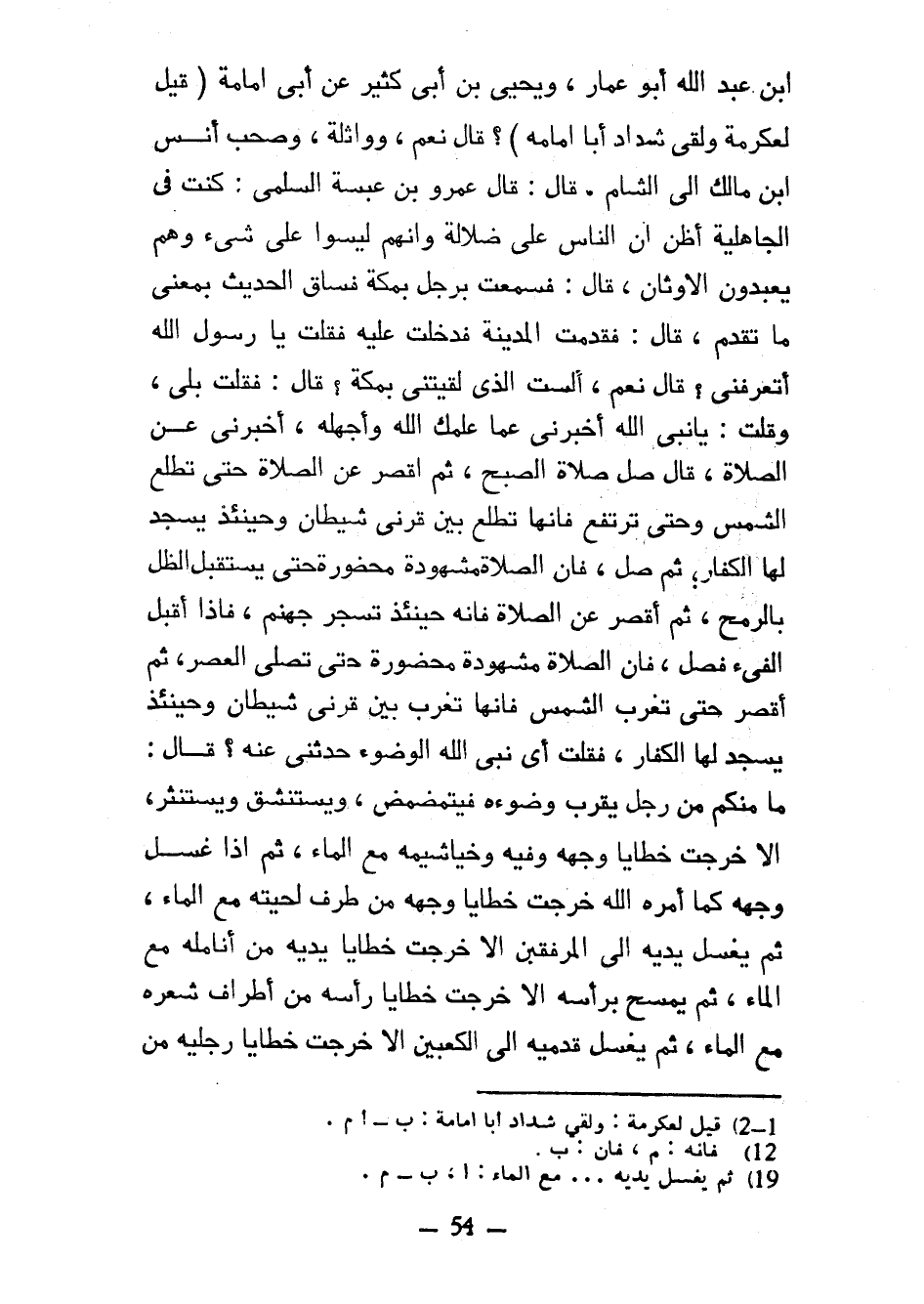 ابن عَبْدِ اللَّهِ أَبُو عَمَّارٍ وَيَحْيَى بْنُ أَبِي كَثِيرٍ عَنْ أَبِي أُمَامَةَ (قِيلَ لِعِكْرِمَةَ وَلَقِيَ شَدَّادٌ أَبَا أُمَامَةَ) قَالَ نَعَمْ وَوَاثِلَةَ وَصَحِبَ أنس ابن مَالِكٍ إِلَى الشَّامِ قَالَ قَالَ عَمْرُو بْنُ عَبَسَةَ السُّلَمِيُّ كُنْتُ فِي الْجَاهِلِيَّةِ أَظُنُّ أَنَّ النَّاسَ عَلَى ضَلَالَةٍ وَأَنَّهُمْ لَيْسُوا عَلَى شَيءٍ وَهُمْ يَعْبُدُونَ الْأَوْثَانَ قَالَ فَسَمِعْتُ بِرَجُلٍ بِمَكَّةَ فَسَاقَ الْحَدِيثَ بِمَعْنَى مَا تَقَدَّمَ قَالَ فَقَدِمْتُ المدينة فدخلت عَلَيْهِ فَقُلْتُ يَا رَسُولَ اللَّهِ أَتَعْرِفُنِي قَالَ نَعَمْ أَلَسْتَ الَّذِي لَقِيتَنِي بِمَكَّةَ قَالَ فَقُلْتُ بَلَى وَقُلْتُ يَا نَبِيَّ اللَّهِ أَخْبِرْنِي عَمَّا عَلَّمَكَ اللَّهُ وَأَجْهَلُهُ أَخْبِرْنِي عَنِ الصَّلَاةِ قَالَ صَلِّ صَلَاةَ الصُّبْحِ ثُمَّ أَقْصِرْ عَنِ الصَّلَاةِ حَتَّى تَطْلُعَ الشَّمْسُ وَحَتَّى تَرْتَفِعَ فَإِنَّهَا تَطْلُعُ بَيْنَ قَرْنَيْ شَيْطَانٍ وَحِينَئِذٍ يَسْجُدُ لَهَا الْكُفَّارُ ثم صل فإن الصلاة مشهودة محضورة يُسْتَقْبَلَ الظِّلُّ بِالرُّمْحِ ثُمَّ أَقْصِرْ عَنِ الصَّلَاةِ فَإِنَّهُ حِينَئِذٍ تُسْجَرُ جَهَنَّمُ فَإِذَا أَقْبَلَ الْفَيْءُ فَصَلِّ فَإِنَّ الصَّلَاةَ مَشْهُودَةٌ مَحْضُورَةٌ حَتَّى تُصَلَّى العصر ثم أقصر حَتَّى تَغْرُبَ الشَّمْسُ فَإِنَّهَا تَغْرُبُ بَيْنَ قَرْنَيْ شَيْطَانٍ وَحِينَئِذٍ يَسْجُدُ لَهَا الْكُفَّارُ فَقُلْتُ أَيْ نَبِيَّ اللَّهِ الْوُضُوءُ حَدِّثْنِي عَنْهُ قَالَ مَا مِنْكُمْ مِنْ رَجُلٍ يَقْرَبُ وَضَوْءَهُ فَيَتَمَضْمَضُ وَيَسْتَنْشِقُ وَيَسْتَنْثِرُ إِلَّا خَرَجَتْ خَطَايَا وَجْهِهِ وَفِيهِ وَخَيَاشِيمِهِ مَعَ الْمَاءِ ثُمَّ إِذَا غَسَلَ وَجْهَهُ كَمَا أَمَرَهُ اللَّهُ خَرَجَتْ خَطَايَا وَجْهِهِ مِنْ طَرَفِ لِحْيَتِهِ مَعَ الْمَاءِ ثُمَّ يَغْسِلُ يَدَيْهِ إِلَى الْمَرْفِقَيْنِ إِلَّا خَرَجَتْ خَطَايَا يَدَيْهِ مِنْ أَنَامِلِهِ مَعَ الْمَاءِ ثُمَّ يَمْسَحُ بِرَأْسِهِ إِلَّا خَرَجَتْ خَطَايَا رَأْسِهِ مِنْ أَطْرَافِ شَعْرِهِ مَعَ الْمَاءِ ثُمَّ يَغْسِلُ قَدَمَيْهِ إِلَى الْكَعْبَيْنِ إِلَّا خَرَجَتْ خَطَايَا رِجْلَيْهِ مِنْ