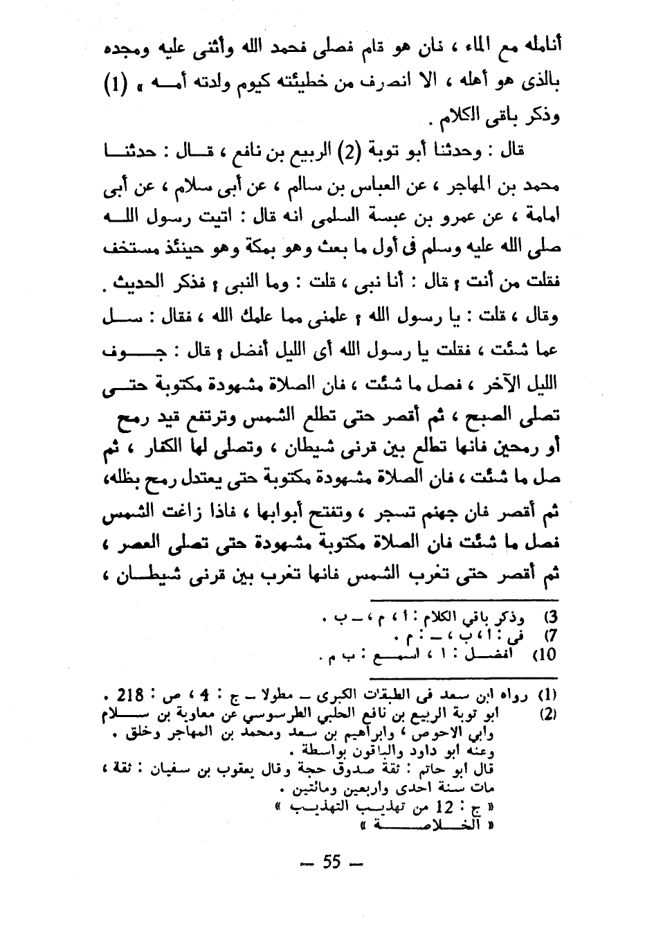 أَنَامِلِهِ مَعَ الْمَاءِ فَإِنْ هُوَ قَامَ فَصَلَّى فَحَمِدَ اللَّهَ وَأَثْنَى عَلَيْهِ وَمَجَّدَهُ بِالَّذِي هُوَ أَهْلُهُ إِلَّا انْصَرَفَ مِنْ خَطِيئَتِهِ كَيَوْمِ وَلَدَتْهُ أُمُّهُ وَذَكَرَ بَاقِي الْكَلَامِ قَالَ وَحَدَّثَنَا أَبُو تَوْبَةَ الرَّبِيعُ بْنُ نَافِعٍ قَالَ حَدَّثَنَا مُحَمَّدُ بْنُ الْمُهَاجِرِ عَنِ الْعَبَّاسِ بْنِ سَالِمٍ عَنْ أَبِي سَلَامٍ عَنْ أَبِي أُمَامَةَ عَنْ عَمْرِو بْنِ عَبَسَةَ السُّلَمِيِّ أَنَّهُ قَالَ أَتَيْتُ رَسُولَ اللَّهِ صَلَّى اللَّهُ عَلَيْهِ وَسَلَّمَ فِي أَوَّلِ مَا بُعِثَ وَهُوَ بِمَكَّةَ وَهُوَ حِينَئِذٍ مُسْتَخْفٍ فَقُلْتُ مَنْ أَنْتَ قَالَ أَنَا نَبِيٌّ قُلْتُ وَمَا النَّبِيُّ فَذَكَرَ الْحَدِيثَ وَقَالَ قُلْتُ يَا رَسُولَ اللَّهِ عَلِّمْنِي مِمَّا عَلَّمَكَ اللَّهُ فَقَالَ سَلْ عَمَّا شِئْتَ فَقُلْتُ يَا رَسُولَ اللَّهِ أَيُّ اللَّيْلِ أَفْضَلُ قَالَ جَوْفُ اللَّيْلِ الْآخَرِ فَصَلِّ مَا شِئتَ فَإِنَّ الصَّلَاةَ مَشْهُودَةٌ مَكْتُوبَةٌ حَتَّى تُصَلِّيَ الصُّبْحَ ثُمَّ أَقْصِرْ حَتَّى تَطْلُعَ الشَّمْسُ وَتَرْتَفِعَ قَيْدَ رُمْحٍ أَوْ رُمْحَيْنِ فَإِنَّهَا تَطْلُعُ بَيْنَ قَرْنَيْ شَيْطَانٍ وَتُصَلِّي لَهَا الْكُفَّارُ ثُمَّ صَلِّ مَا شِئتَ فَإِنَّ الصَّلَاةَ مَشْهُودَةٌ مَكْتُوبَةٌ حَتَّى يَعْتَدِلَ رُمْحٌ بِظِلِّهِ ثُمَّ أَقْصِرْ فَإِنَّ جَهَنَّمَ تُسْجَرُ وَتُفْتَحُ أَبْوَابُهَا فَإِذَا زَاغَتِ الشَّمْسُ فَصَلِّ مَا شِئتَ فَإِنَّ الصَّلَاةَ مَكْتُوبَةٌ مَشْهُودَةٌ حَتَّى تُصَلِّيَ الْعَصْرَ ثُمَّ أَقْصِرْ حَتَّى تَغْرُبَ الشَّمْسُ فَإِنَّهَا تَغْرُبُ بَيْنَ قَرْنَيْ شَيْطَانٍ