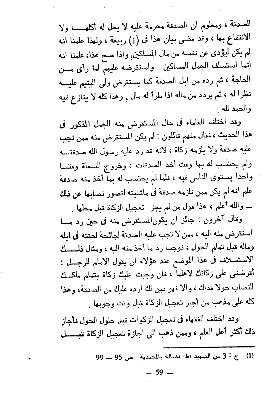 الصَّدَقَةِ وَمَعْلُومٌ أَنَّ الصَّدَقَةَ مُحَرَّمَةٌ عَلَيْهِ لَا يَحِلُّ لَهُ أَكْلُهَا وَلَا الِانْتِفَاعُ بِهَا وَقَدْ مَضَى بَيَانُ هَذَا فِي رَبِيعَةَ وَلِهَذَا عَلِمْنَا أَنَّهُ لَمْ يَكُنْ لِيُؤَدِّيَ عَنْ نَفْسِهِ مِنْ مَالِ الْمَسَاكِينِ وَإِذَا صَحَّ هَذَا عَلِمْنَا أَنَّهُ إِنَّمَا اسْتَسْلَفَ الْجَمَلَ لِلْمَسَاكِينِ وَاسْتَقْرَضَهُ عَلَيْهِمْ لِمَا رَأَى مِنَ الْحَاجَةِ ثُمَّ رَدَّهُ مِنْ إِبِلِ الصَّدَقَةِ كَمَا يَسْتَقْرِضُ وَلِيُّ الْيَتِيمِ عَلَيْهِ نَظَرًا لَهُ ثُمَّ يَرُدُّهُ مِنْ مَالِهِ إِذَا طَرَأَ لَهُ مَالٌ وَهَذَا كُلُّهُ لَا يُنَازَعُ فِيهِ وَالْحَمْدُ لِلَّهِ وَقَدِ اخْتَلَفَ الْعُلَمَاءُ فِي حَالِ الْمُسْتَقْرَضِ مِنْهُ الْجَمَلِ الْمَذْكُورِ فِي هَذَا الْحَدِيثِ فَقَالَ مِنْهُمْ قَائِلُونَ لَمْ يَكُنِ الْمُسْتَقْرَضُ مِنْهُ مِمَّنْ تَجِبُ عَلَيْهِ صَدَقَةٌ وَلَا يَلْزَمُهُ زَكَاةٌ لِأَنَّهُ قَدْ رَدَّ عَلَيْهِ رَسُولُ اللَّهِ صَدَقَتَهُ وَلَمْ يُحْتَسَبْ لَهُ بِهَا وَقْتَ أَخْذِ الصَّدَقَاتِ وَخُرُوجِ السُّعَاةِ وَقْتًا وَاحِدًا يَسْتَوِي النَّاسُ فِيهِ فما لَمْ يُحْتَسَبْ لَهُ بِمَا أُخِذَ مِنْهُ صَدَقَةً عُلِمَ أَنَّهُ لَمْ يَكُنْ مِمَّنْ تَلْزَمُهُ صَدَقَةٌ فِي مَاشِيَتِهِ لِقُصُورِ نِصَابِهَا عَنْ ذَلِكَ وَاللَّهُ أَعْلَمُ هَذَا قَوْلُ مَنْ لَمْ يُجِزْ تَعْجِيلَ الزكاة قبل محلها وقال آخرون جائر أَنْ يَكُونَ الْمُسْتَقْرَضُ مِنْهُ فِي حِينِ رَدِّ مَا اسْتُقْرِضَ مِنْهُ إِلَيْهِ مِمَّنْ لَا تَجِبُ عَلَيْهِ الصَّدَقَةُ لِجَائِحَةٍ لَحِقَتْهُ فِي إِبِلِهِ وَمَالِهِ قَبْلَ تَمَامِ الْحَوْلِ فَوَجَبَ رَدُّ مَا أُخِذَ مِنْهُ إِلَيْهِ وَمِثَالُ ذَلِكَ الِاسْتِسْلَافُ فِي هَذَا الْمَوْضِعِ عِنْدَ هَؤُلَاءِ أَنْ يَقُولَ الْإِمَامُ لِلرَّجُلِ أَقْرِضْنِي عَلَى زَكَاتِكَ لِأَهْلِهَا فَإِنْ وَجَبَتْ عَلَيْكَ زَكَاةٌ بِتَمَامِ مِلْكِكَ لِلنِّصَابِ حَوْلًا فَذَاكَ وَإِلَّا فَهُوَ دَيْنٌ لَكَ أَرُدُّهُ عَلَيْكَ مِنَ الصَّدَقَةِ وَهَذَا كُلُّهُ عَلَى مَذْهَبِ مَنْ أَجَازَ تَعْجِيلَ الزَّكَاةِ قَبْلَ وَقْتِ وُجُوبِهَا وَقَدِ اخْتَلَفَ الْفُقَهَاءُ فِي تَعْجِيلِ الزَّكَوَاتِ قَبْلَ حُلُولِ الْحَوْلِ فَأَجَازَ ذَلِكَ أَكْثَرُ أَهْلِ الْعِلْمِ وَمِمَّنْ ذَهَبَ إِلَى إِجَازَةِ تَعْجِيلِ الزَّكَاةِ قَبْلَ