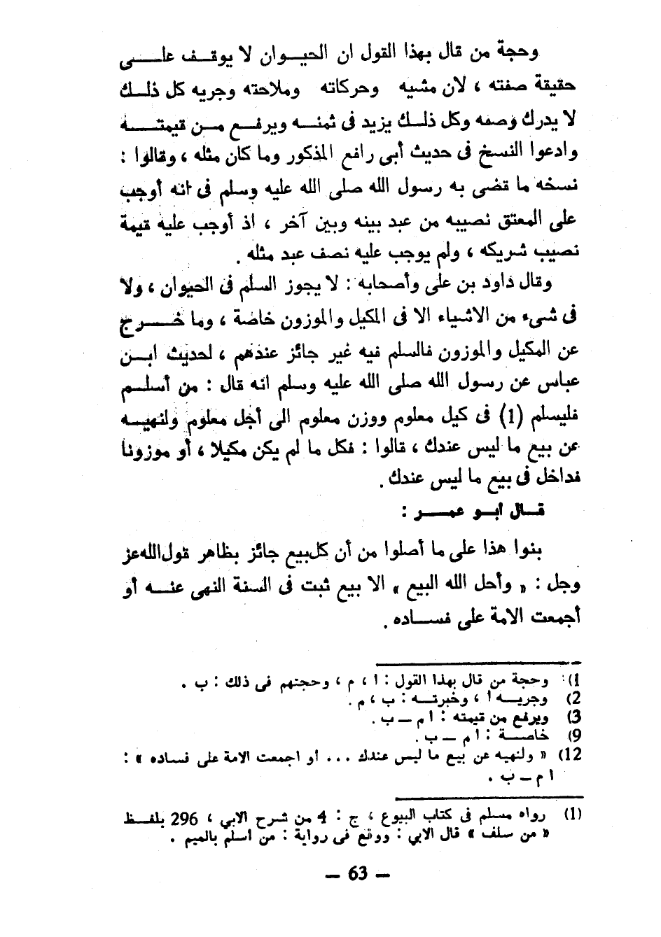وَحُجَّةُ مَنْ قَالَ بِهَذَا الْقَوْلِ إِنَّ الْحَيَوَانَ لَا يُوقَفُ عَلَى حَقِيقَةِ صِفَتِهِ لِأَنَّ مَشْيَهُ وَحَرَكَاتِهِ وَمَلَاحَتَهُ وَجَرْيَهُ كُلُّ ذَلِكَ لَا يُدْرَكُ وَصْفُهُ وَكُلُّ ذَلِكَ يَزِيدُ فِي ثَمَنِهِ وَيَرْفَعُ مَنْ قِيمَتِهِ وَادَّعُوا النَّسْخَ فِي حَدِيثِ أَبِي رَافِعٍ الْمَذْكُورِ وَمَا كَانَ مِثْلَهُ وَقَالُوا نَسَخَهُ مَا قَضَى بِهِ رَسُولُ اللَّهِ صَلَّى اللَّهُ عَلَيْهِ وَسَلَّمَ فِي أَنَّهُ أَوْجَبَ عَلَى الْمُعَتَقِ نَصِيبُهُ مِنْ عَبْدٍ بَيْنَهُ وَبَيْنَ آخَرَ إِذْ أَوْجَبَ عَلَيْهِ قِيمَةُ نَصِيبِ شَرِيكِهِ وَلَمْ يُوجِبْ عَلَيْهِ نِصْفَ عَبْدٍ مِثْلِهِ وَقَالَ دَاوُدُ بْنُ عَلِيٍّ وَأَصْحَابُهُ لَا يَجُوزُ السَّلَمُ فِي الْحَيَوَانِ وَلَا فِي شَيْءٍ مِنَ الْأَشْيَاءِ إِلَّا فِي الْمَكِيلِ وَالْمَوْزُونِ خَاصَّةً وَمَا خَرَجَ عَنِ الْمَكِيلِ والموزن فَالسَّلَمُ فِيهِ غَيْرُ جَائِزٍ عِنْدَهُمْ لِحَدِيثِ ابْنِ عَبَّاسٍ عَنْ رَسُولِ اللَّهِ صَلَّى اللَّهُ عَلَيْهِ وَسَلَّمَ أَنَّهُ قَالَ مَنْ أَسْلَمَ فَلْيُسْلِمْ فِي كَيْلٍ مَعْلُومٍ وَوَزْنٍ مَعْلُومٍ إِلَى أَجَلٍ مَعْلُومٍ وَلِنَهْيهِ عَنْ بَيْعِ مَا لَيْسَ عِنْدَكَ قَالُوا فَكُلُّ مَا لَمْ يَكُنْ مَكِيلًا أَوْ مَوْزُونًا فَدَاخِلٌ فِي بَيْعِ مَا لَيْسَ عِنْدَكَ قَالَ أَبُو عُمَرَ بَنَوْا هَذَا عَلَى مَا أَصَّلُوا مِنْ أَنَّ كُلَّ بَيْعٍ جَائِزٍ بِظَاهِرِ قَوْلِ اللَّهِ عَزَّ وَجَلَّ وَأَحَلَّ اللَّهُ الْبَيْعَ إِلَّا بيع ثَبَتَ فِي السُّنَّةِ النَّهْيُ عَنْهُ أَوْ أَجْمَعَتِ الْأُمَّةُ عَلَى فَسَادِهِ