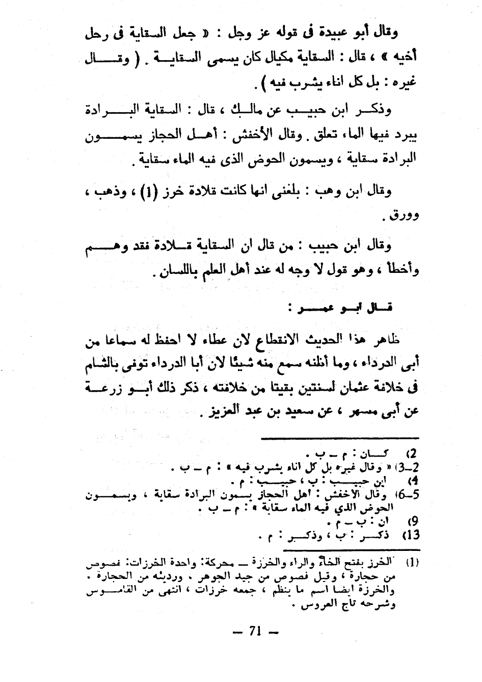وَقَالَ أَبُو عُبَيْدَةَ فِي قَوْلِهِ عَزَّ وَجَلَّ جَعَلَ السِّقَايَةَ فِي رَحْلِ أَخِيهِ قَالَ السِّقَايَةُ مِكْيَالٌ كَانَ يُسَمَّى السِّقَايَةَ (وَقَالَ غَيْرُهُ بَلْ كُلُّ إِنَاءٍ يُشْرَبُ فِيهِ) وَذَكَرَ ابْنُ حَبِيبٍ عَنْ مَالِكٍ قَالَ السِّقَايَةُ الْبَرَّادَةُ يُبَرَّدُ فِيهَا الْمَاءُ تُعَلَّقُ وَقَالَ الْأَخْفَشُ أَهْلُ الْحِجَازِ يُسَمُّونَ الْبَرَّادَةَ سِقَايَةٌ وَيُسَمُّونَ الْحَوْضَ الَّذِي فِيهِ الْمَاءُ سِقَايَةً وَقَالَ ابْنُ وَهْبٍ بَلَغَنِي أَنَّهَا كَانَتْ قِلَادَةُ خَرَزٍ وَذَهَبٍ وَوَرِقٍ وَقَالَ ابْنُ حَبِيبٍ مَنْ قَالَ إِنَّ السِّقَايَةَ قِلَادَةٌ فَقَدْ وَهَمَ وأخطأ وهو قول لا وجه له عند أَهْلُ الْعِلْمِ بِاللِّسَانِ قَالَ أَبُو عُمَرَ ظَاهِرُ هَذَا الْحَدِيثِ الِانْقِطَاعُ لِأَنَّ عَطَاءً لَا أَحْفَظُ لَهُ سَمَاعًا مِنْ أَبِي الدَّرْدَاءِ وَمَا أَظُنُّهُ سَمِعَ مِنْهُ شَيْئًا لِأَنَّ أَبَا الدَّرْدَاءَ تُوُفِّيَ بِالشَّامِ فِي خِلَافَةِ عُثْمَانَ لِسَنَتَيْنِ بَقِيَتَا مِنْ خِلَافَتِهِ ذَكَرَ ذَلِكَ أَبُو زُرْعَةَ عَنْ أَبِي مُسْهِرٍ عَنْ سَعِيدِ بْنِ عَبْدِ الْعَزِيزِ