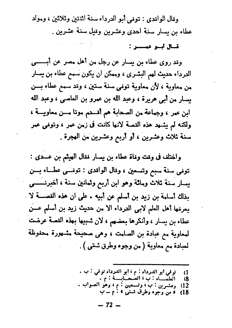 وَقَالَ الْوَاقِدِيُّ تُوُفِّيَ أَبُو الدَّرْدَاءِ سَنَةَ اثْنَتَيْنِ وَثَلَاثِينَ وَمَوْلِدُ عَطَاءِ بْنِ يَسَارٍ سَنَةَ إِحْدَى وَعِشْرِينَ وَقِيلَ سَنَةَ عِشْرِينَ قَالَ أَبُو عُمَرَ وَقَدْ رَوَى عَطَاءُ بْنُ يَسَارٍ عَنْ رَجُلٍ مِنْ أَهْلِ مِصْرَ عَنْ أَبِي الدَّرْدَاءِ حَدِيثَ لَهُمُ الْبُشْرَى وَمُمْكِنٌ أَنْ يَكُونَ سَمِعَ عَطَاءُ بْنُ يَسَارٍ مِنْ مُعَاوِيَةَ لِأَنَّ مُعَاوِيَةَ تُوَفِّي سَنَةَ سِتِّينَ وَقَدْ سَمِعَ عَطَاءُ بْنُ يَسَارٍ مِنْ أَبِي هُرَيْرَةَ وَعَبْدِ اللَّهِ بْنِ عَمْرِو بن العاصي وعبد الله ابن عُمَرَ وَجَمَاعَةٍ مِنَ الصَّحَابَةِ هُمْ أَقْدَمُ مَوْتًا مِنْ مُعَاوِيَةَ وَلَكِنَّهُ لَمْ يَشْهَدْ هَذِهِ الْقِصَّةَ لِأَنَّهَا كَانَتْ فِي زَمَنِ عُمَرَ وَتُوُفِّيَ عُمَرُ سَنَةَ ثَلَاثٍ وَعِشْرِينَ أَوْ أَرْبَعٍ وَعِشْرِينَ مِنَ الْهِجْرَةِ وَاخْتُلِفَ فِي وَقْتِ وَفَاةِ عَطَاءِ بْنِ يَسَارٍ فَقَالَ الْهَيْثَمُ بْنُ عَدِيٍّ تُوُفِّيَ سَنَةَ سَبْعٍ وَتِسْعِينَ وَقَالَ الْوَاقِدِيُّ تُوُفِّيَ عَطَاءُ بْنُ يَسَارٍ سَنَةَ ثَلَاثٍ وَمِائَةٍ وَهُوَ ابْنُ أَرْبَعٍ وَثَمَانِينَ سَنَةً أَخْبَرَنِي بِذَلِكَ أُسَامَةُ بْنُ زَيْدِ بْنِ أَسْلَمَ عَنْ أَبِيهِ عَلَى أَنَّ هَذِهِ الْقِصَّةَ لَا يَعْرِفُهَا أَهْلُ الْعِلْمِ لِأَبِي الدَّرْدَاءِ الا من حديث زَيْدِ ابْنِ أَسْلَمَ عَنْ عَطَاءِ بْنِ يَسَارٍ وَأَنْكَرَهَا بَعْضُهُمْ لِأَنَّ شَبِيهًا بِهَذِهِ الْقِصَّةِ عَرَضَتْ لِمُعَاوِيَةَ مَعَ عُبَادَةَ بْنِ الصَّامِتِ وَهِيَ صَحِيحَةٌ مَشْهُورَةٌ مَحْفُوظَةٌ لِعُبَادَةَ مَعَ مُعَاوِيَةَ (مِنْ وُجُوهٍ وَطُرُقٍ شَتَّى)